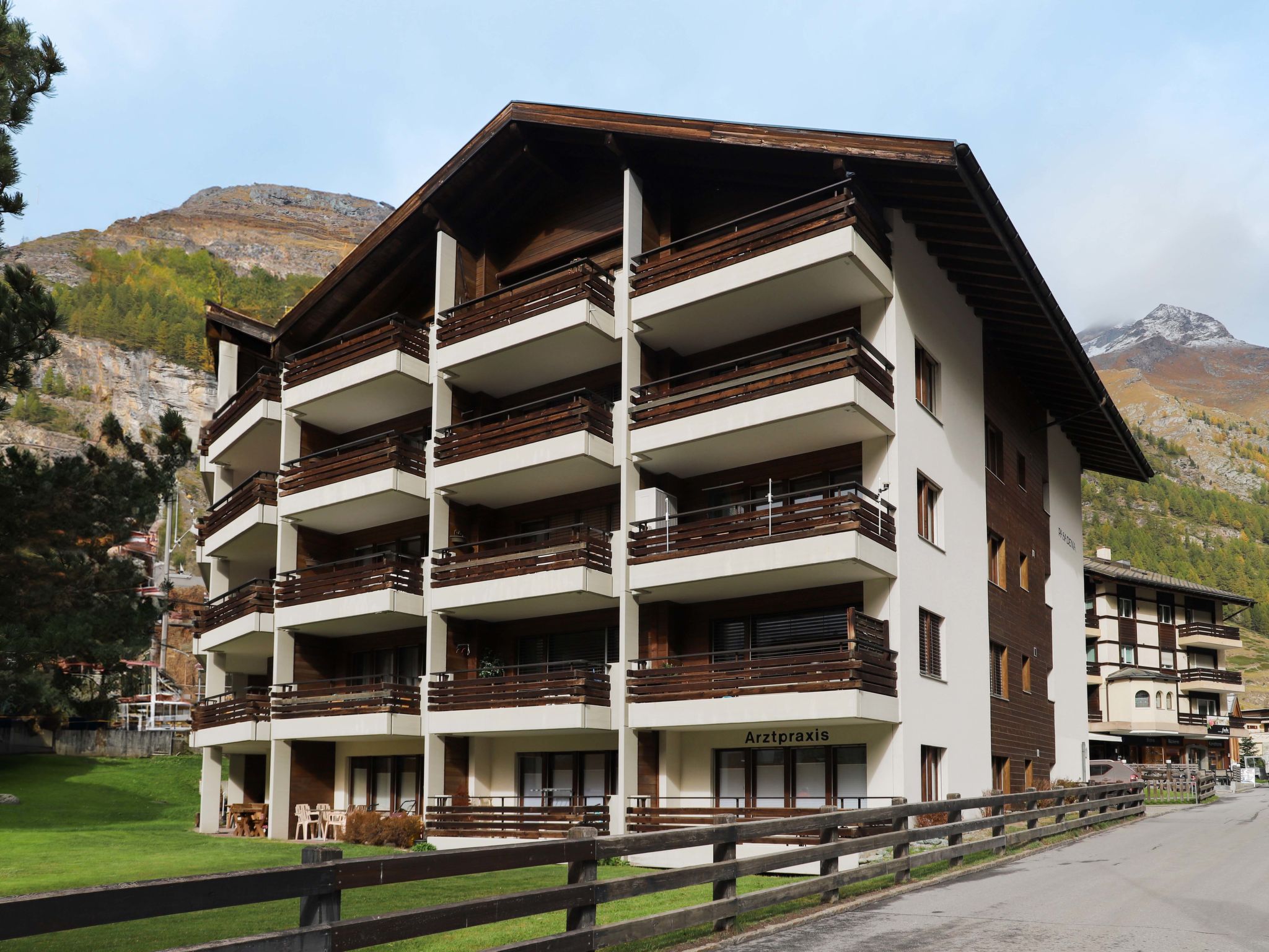 Grosses, einfaches Mehrfamilienhaus "Pasadena", auf 5 Stockwerken. Exzellente Lage: Absolut zentral und dennoch ruhig. Im Hause: Fahrstuhl, Skiraum, Zentralheizung. Supermarkt 300 m, Restaurant 100 m, Bäckerei 25 m, Fahrradverleih 150 m, Bushaltestelle "Getwingbrücke" 35 m, Bahnstation "Bahnhof Zermatt" 300 m. Bergeisenbahn, Skiverleih 150 m, Skibushaltestelle 35 m, Skischule, Kinderskischule 450 m. Bitte beachten: Weitere Unterkünfte sind buchbar.