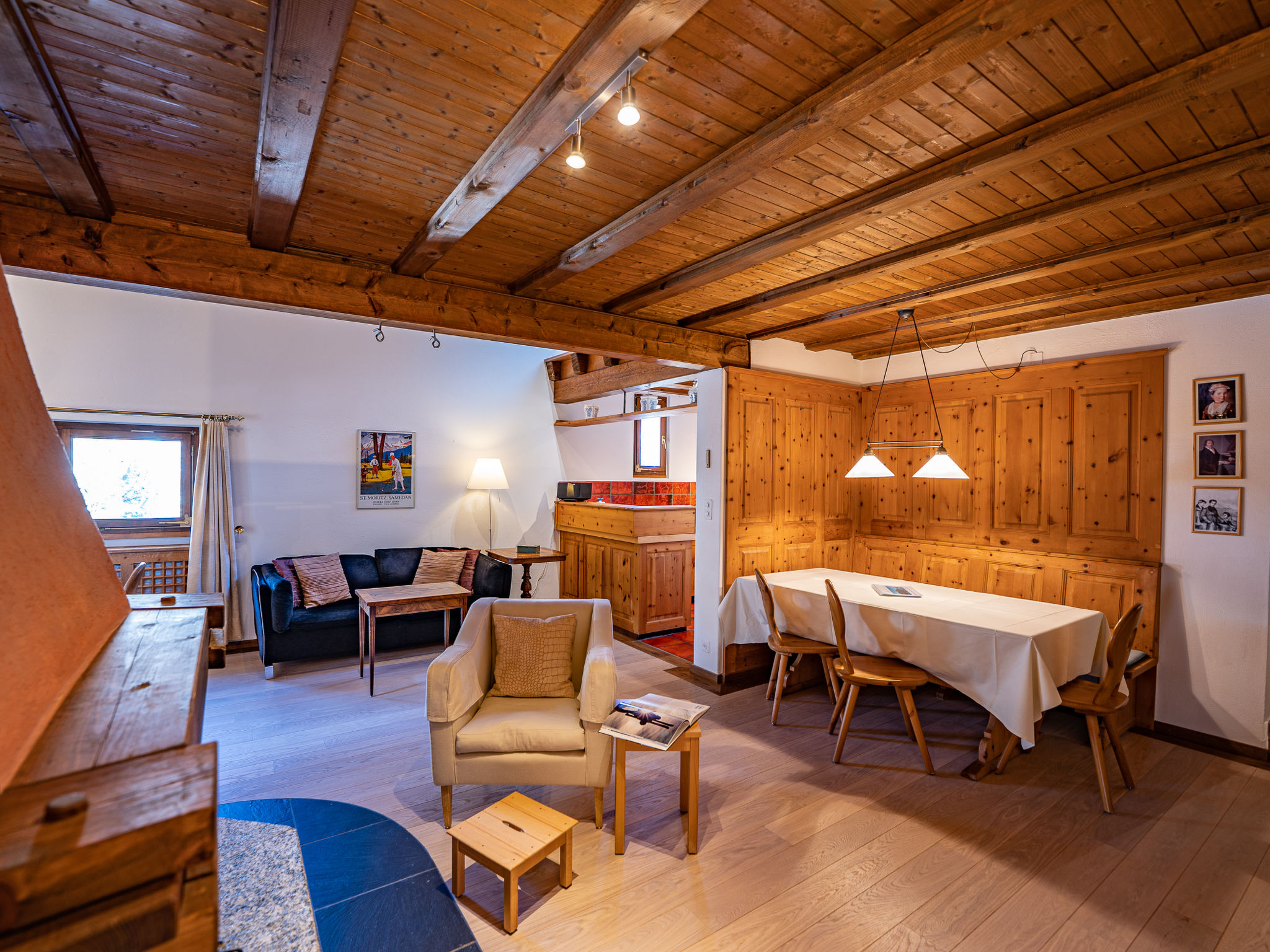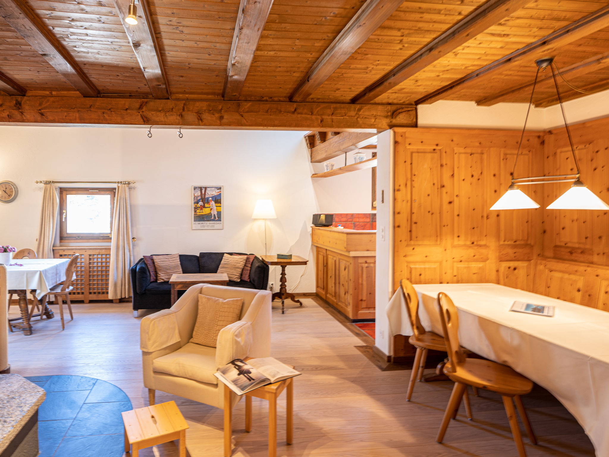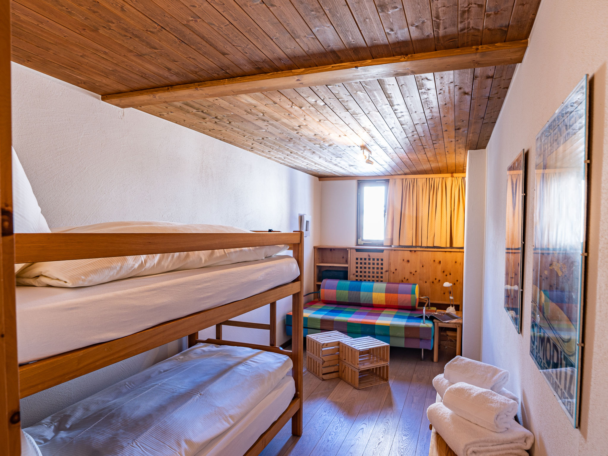 "Chesa Cantieni", 3-Zimmer-Wohnung 85 m2 auf 2 Stockwerken, Nordlage. Komfortabel und geschmackvoll eingerichtet: Wohn-/Esszimmer mit offenem Kamin und TV. 1 Zimmer mit 1 Bett (90 cm, Länge 200 cm), 1 x 2 Etagenbetten (85 cm, Länge 185 cm). Offene Küche (Backofen, Geschirrspüler, 4 Induktionskochplatten, Toaster, Wasserkocher, Tiefkühler, elektrische Kaffeemaschine, Kapseln für die Kaffeemaschine (Nespresso) extra, Racletteofen). Dusche/WC. Obergeschoss: 1 Zimmer mit 1 Doppelbett (2 x 80 cm, Länge 195 cm), Bad/Dusche/WC. Ausgang zum Balkon. Galerie mit 1 Diwanbett (150 cm, Länge 200 cm). Kleiner Balkon. Sicht auf die Ortschaft. Zur Verfügung: Haartrockner. Internet (Wireless LAN, gratis). Garage Nr. 12 in 100 m, Höhe 225 cm, Breite 260 cm. Bitte beachten: geeignet für Familien. Nichtraucher-Unterkunft. Anstelle eines abgeschlossenen Schlafzimmers befinden sich manche Schlafplätze in einem offenen Bereich (Galerie, Nische etc.).