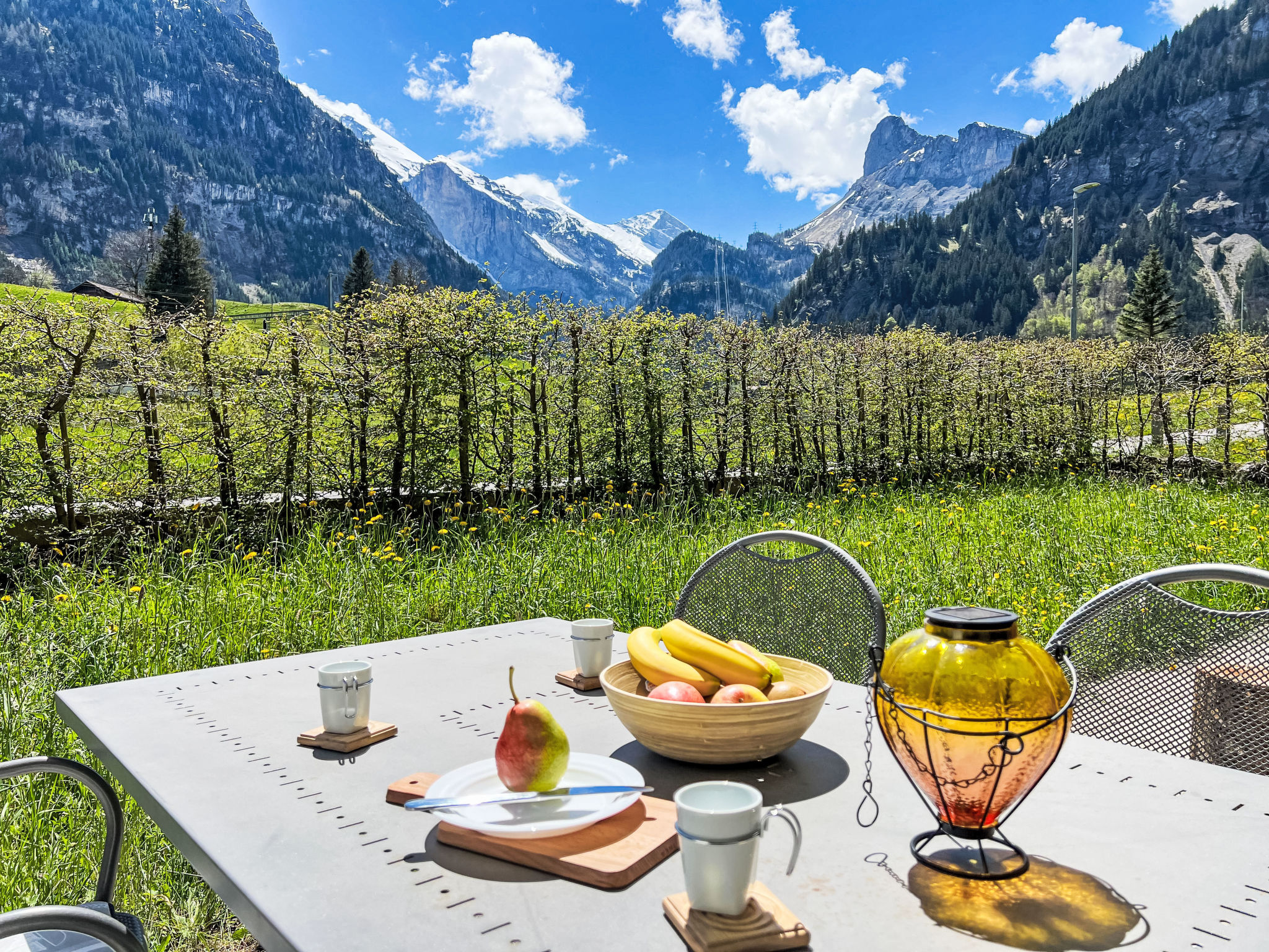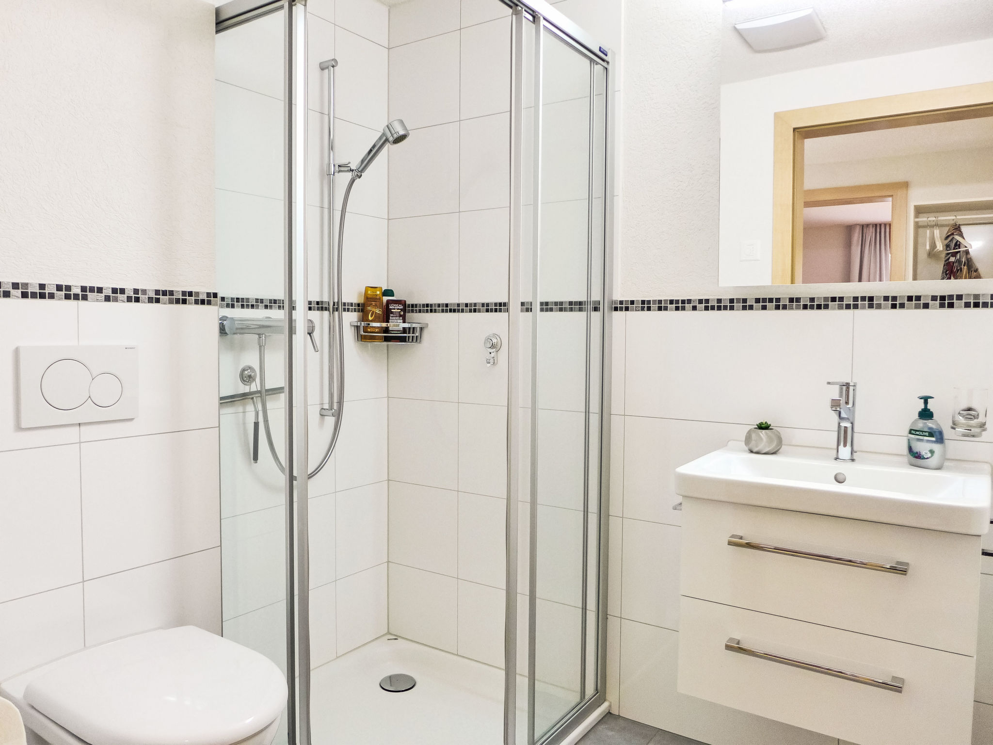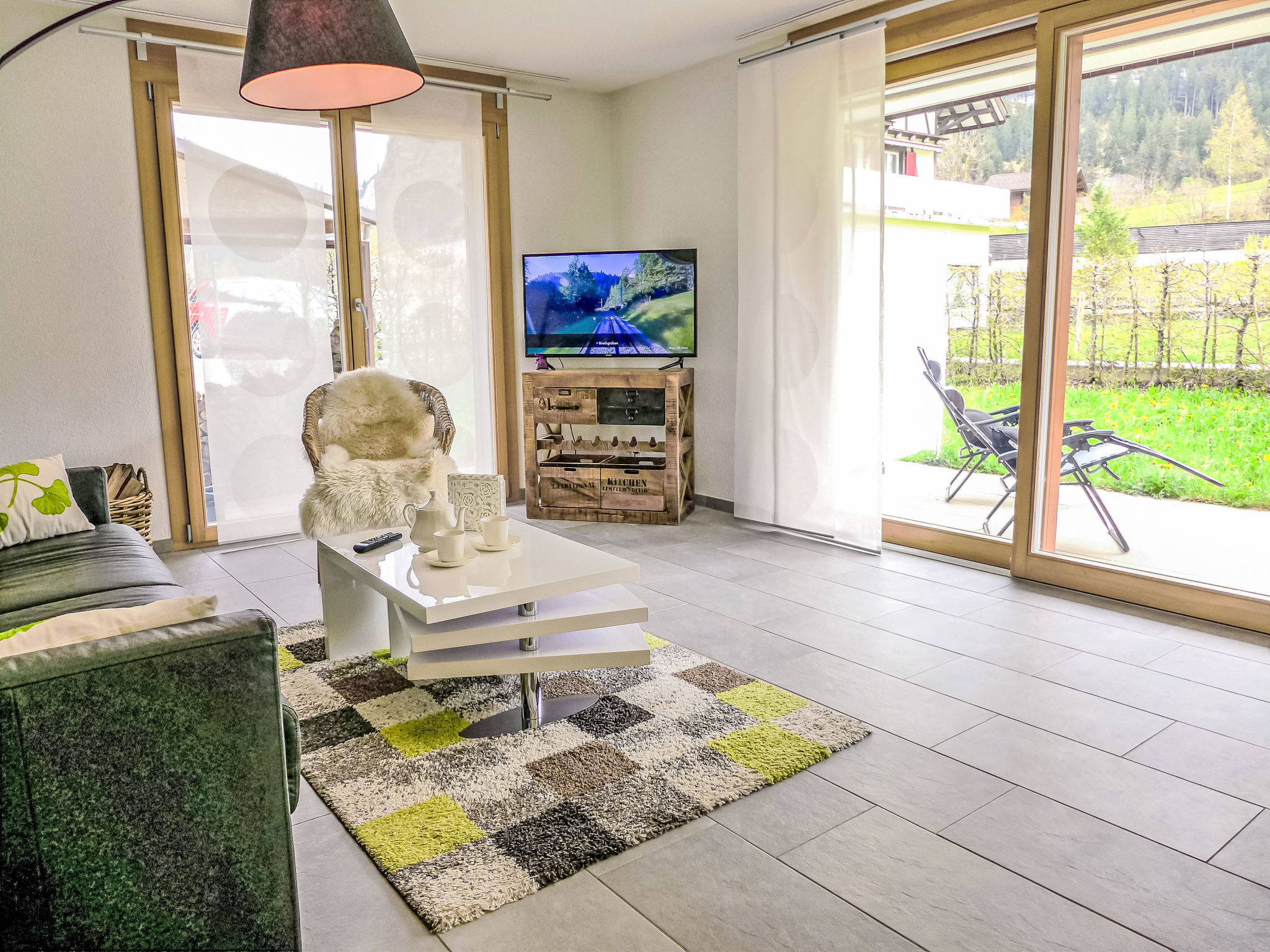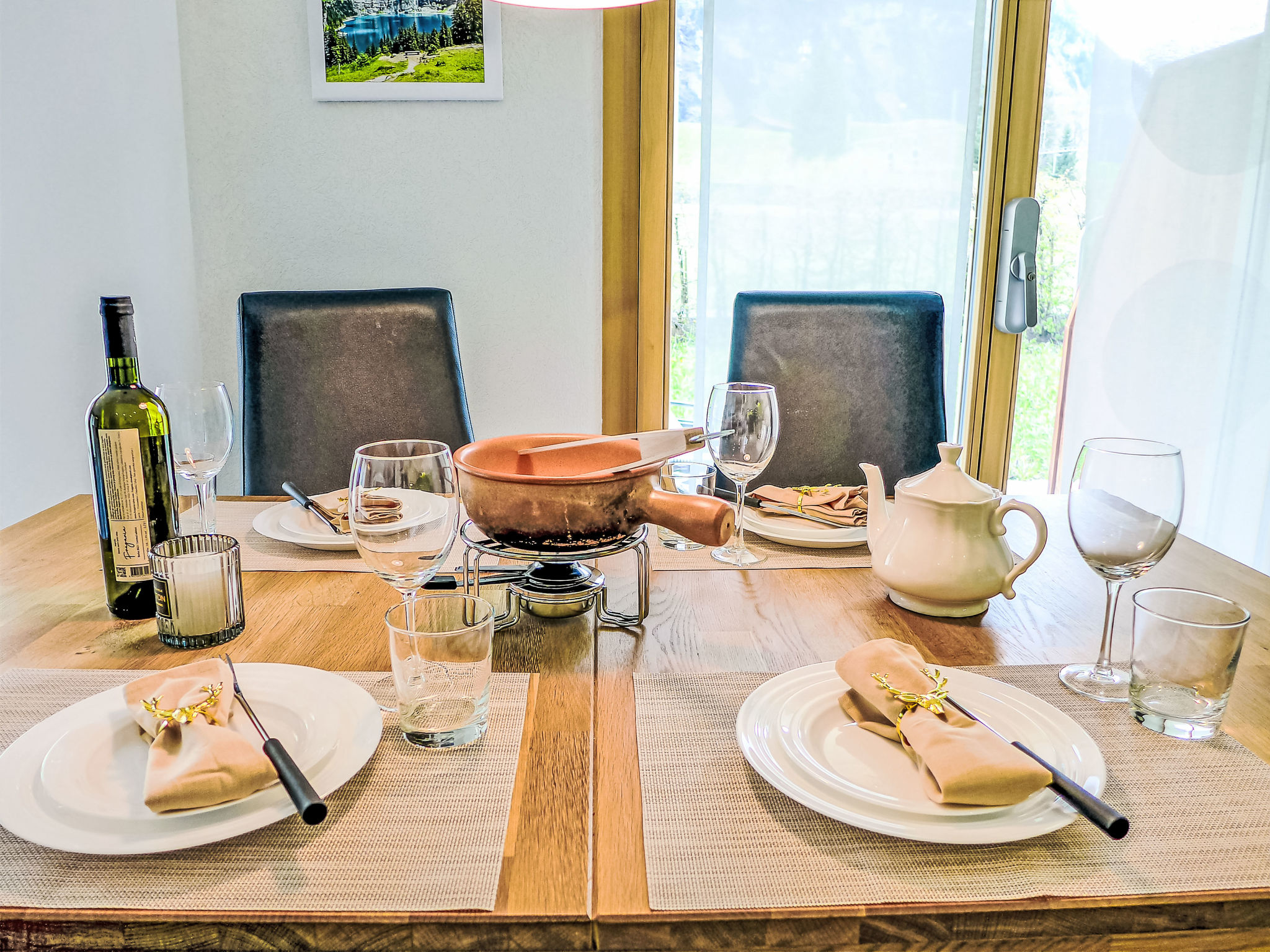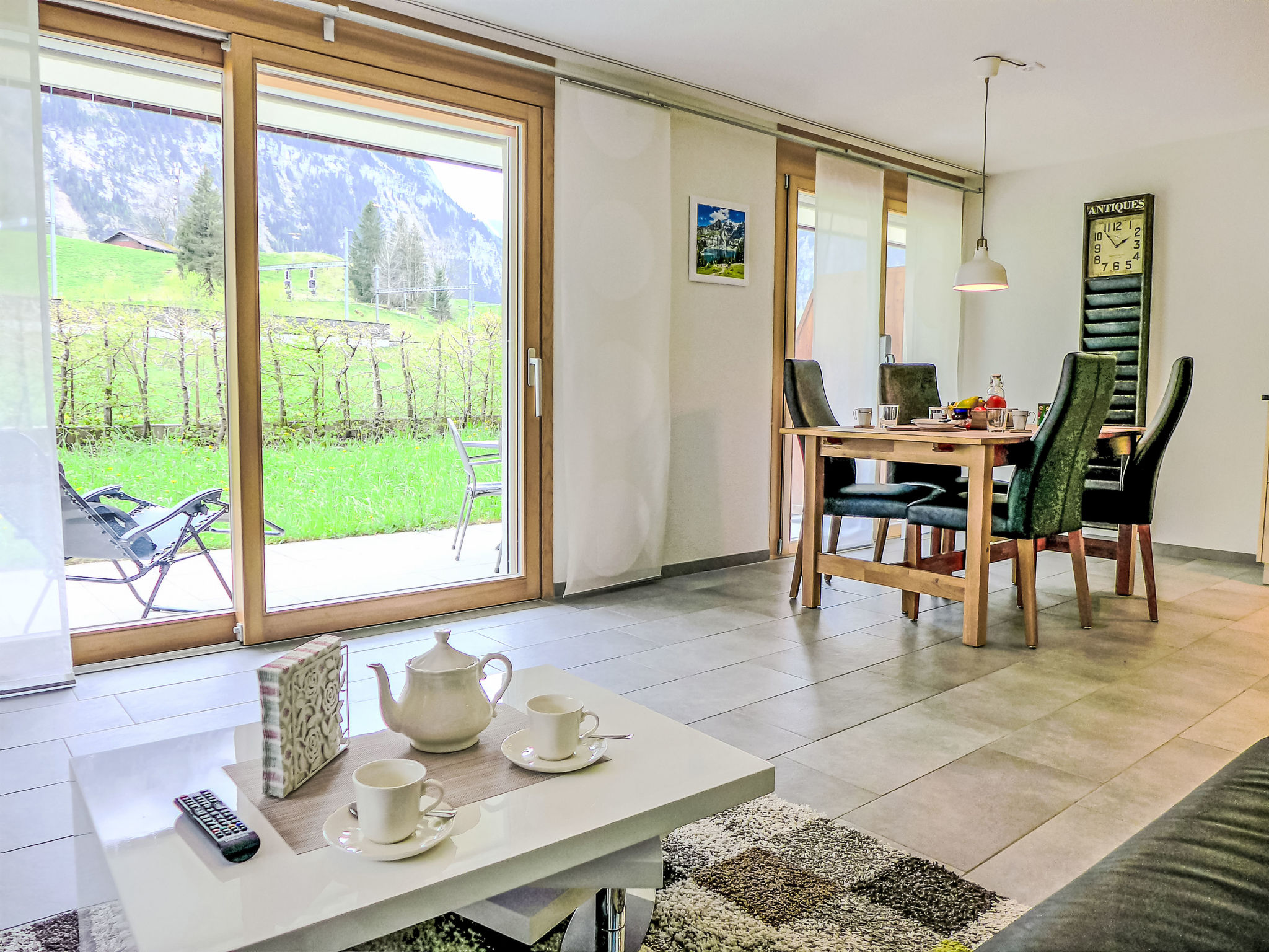 "Bergluft", 2-Zimmer-Wohnung im Erdgeschoss. Geräumig und hell, sehr komfortabel und gemütlich eingerichtet: offenes Wohn-/Schlafzimmer mit 1 Diwanbett (140 cm, Länge 200 cm), Schwedenofen, Digital-TV, Flachbildschirm, Radio und elektrischem Rollladen. Ausgang zur Terrasse. 1 Zimmer mit 1 Doppelbett (160 cm, Länge 200 cm). Offene Küche (Backofen, Geschirrspüler, 4 Glaskeramikplatten, Toaster, Wasserkocher, elektrische Kaffeemaschine, Kapseln für die Kaffeemaschine (Nespresso) extra, Racletteofen, Fondue Set (Käse)) mit Esstisch. Dusche/WC. Fussbodenheizung. Grosse Terrasse, Ostlage und Südlage. Terrassenmöbel. Herrliche Panoramasicht auf die Berge und die Landschaft. Zur Verfügung: Bügeleisen, Haartrockner, Holz (gratis). Internet (Wireless LAN, gratis). Parkplatz (überdacht, 1 Auto). Bitte beachten: Nichtraucher-Unterkunft. Rauchmelder, Feuerlöscher. Das private Sprudelbad auf der Terrasse ist separat buchbar.