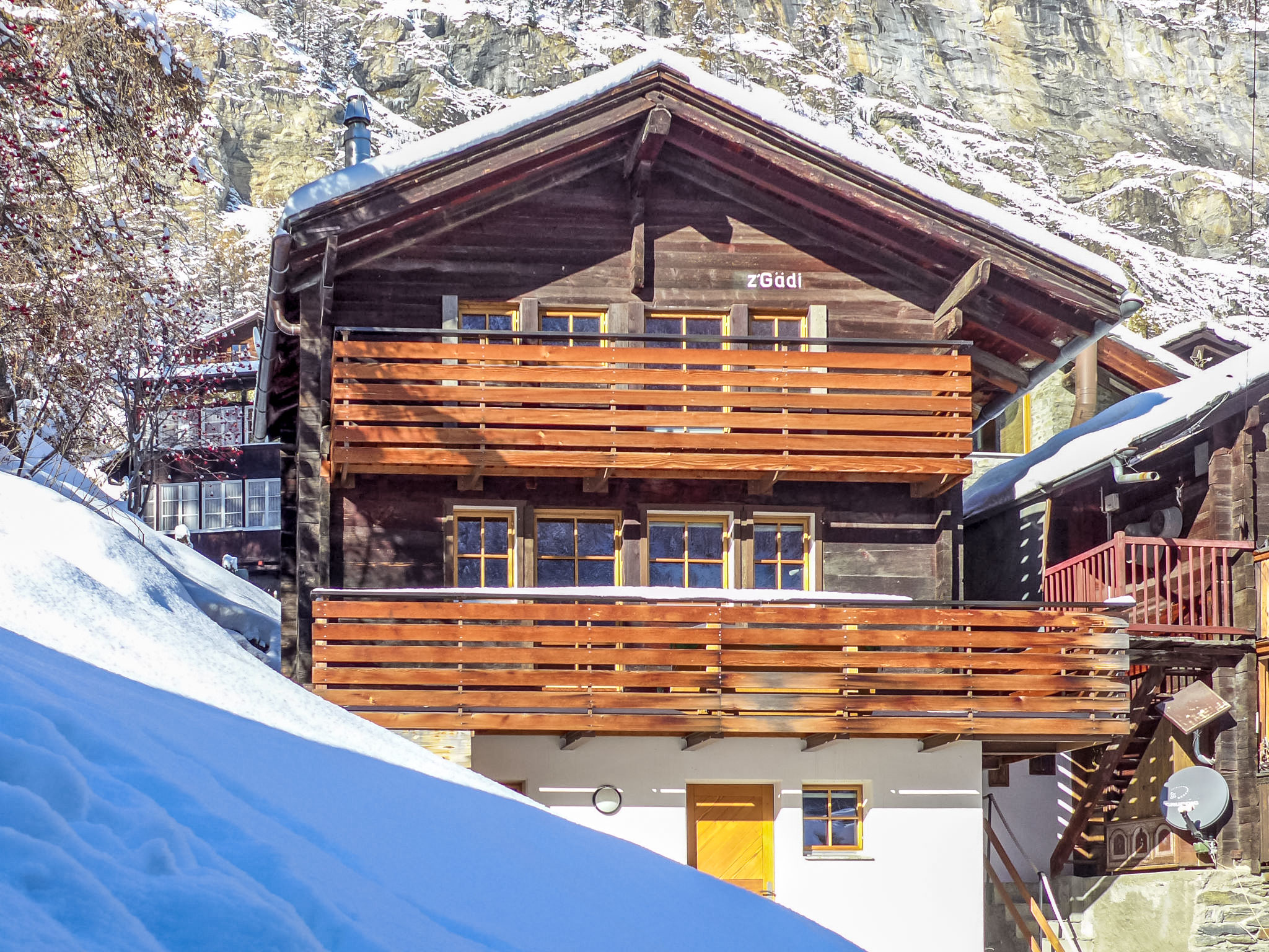 Gemütliches, einfaches Mehrfamilienhaus "Gädi", auf 3 Stockwerken, renoviert im Jahre 2009. Im Ortszentrum von Zermatt, zentrale Lage am Hang. Im Hause: Skiraum, Zentralheizung. Steile, schmale Zufahrt bis 30 m zum Grundstück. Supermarkt 200 m, Restaurant 50 m, Bäckerei 30 m, Bushaltestelle "Bahnhof" 300 m, Bahnstation "Bahnhof Zermatt" 300 m. Bergeisenbahn 300 m, Skiverleih, Skibushaltestelle 300 m, Skischule, Kinderskischule 100 m. Nahe gelegene Sehenswürdigkeiten: Matterhorn Museum 100 m. Bitte beachten: kein Fahrstuhl vorhanden. Taxi kann nicht bis zum Haus fahren. Die Schlüsselübergabe findet bei der Agentur Interhome in Zermatt statt.