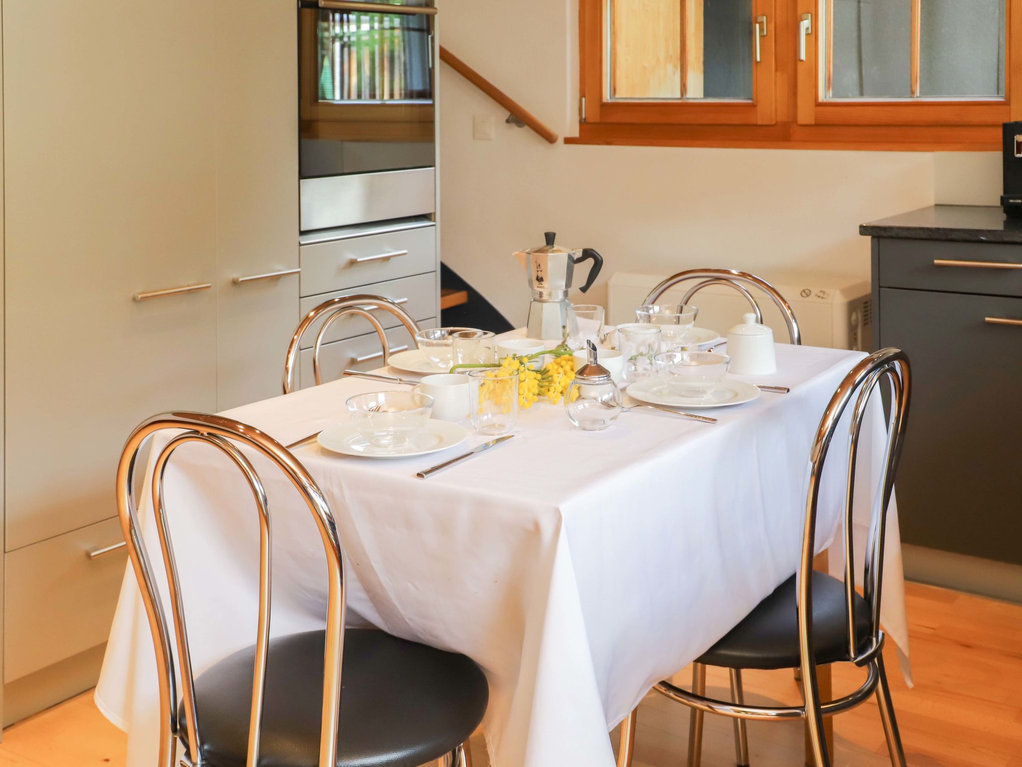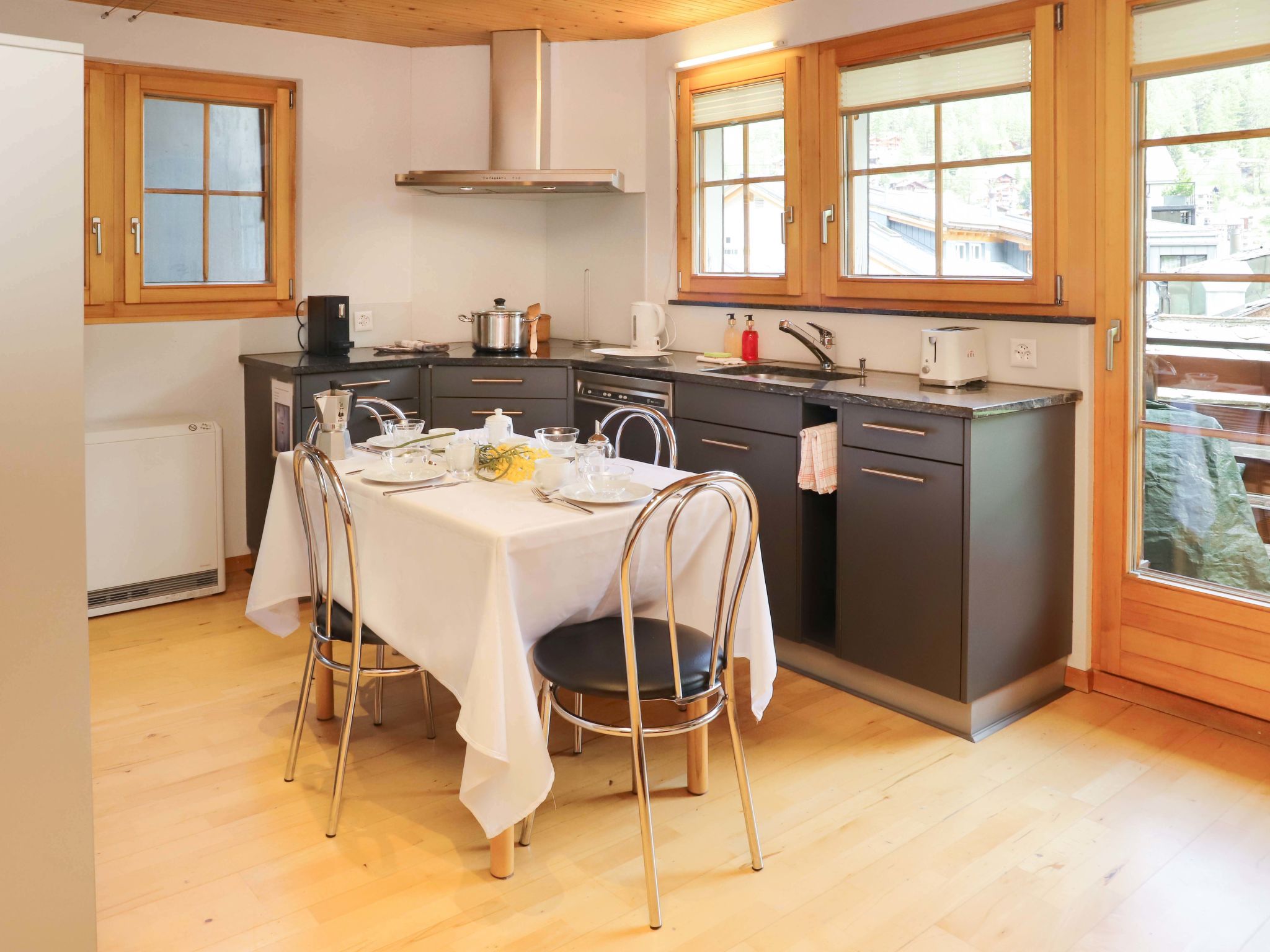 3-Zimmer-Haus 90 m2 auf 3 Stockwerken. Hell, modern und gemütlich eingerichtet: Eingang mit Bad/WC. Obergeschoss: offenes Wohnzimmer mit TV und Holzofen. Ausgang zum Balkon, Richtung Osten. Offene Küche (Backofen, Geschirrspüler, 4 Glaskeramikplatten, Toaster, Wasserkocher, Tiefkühler, elektrische Kaffeemaschine, Racletteofen, Fondue Set (Chinoise, Käse)) mit Esstisch. 2. Obergeschoss: 1 Doppelzimmer mit 2 Betten (90 cm, Länge 200 cm). 1 Doppelzimmer mit 1 Doppelbett (2 x 90 cm, Länge 200 cm). Balkon. Balkonmöbel. Sicht auf die Berge und die Ortschaft. Zur Verfügung: Waschmaschine, Wäschetrockner, Haartrockner. Internet (Wireless LAN, gratis). Bitte beachten: für Kleinkinder nicht geeignet. Nichtraucher-Unterkunft, Nichtraucher-Haus.
