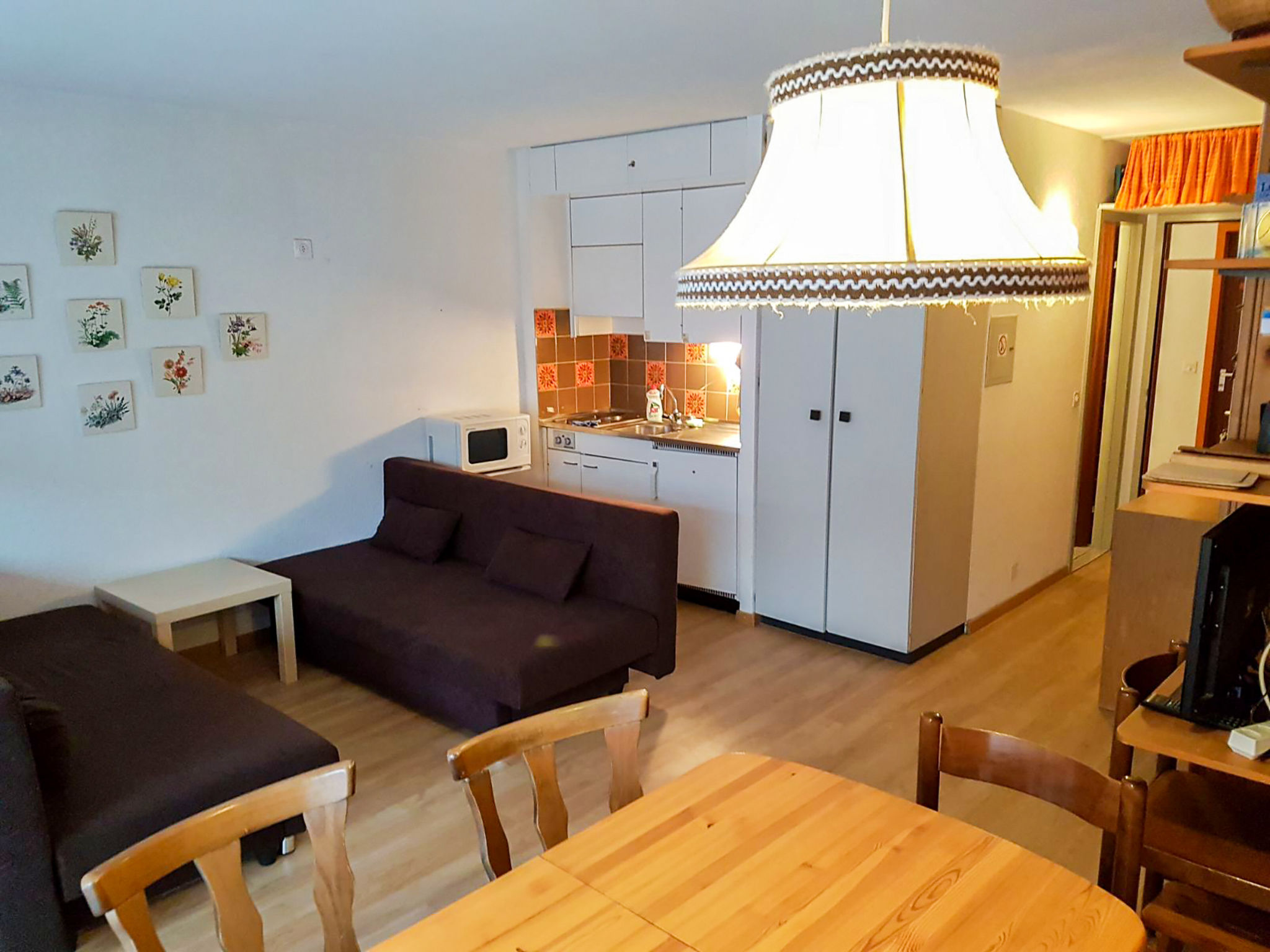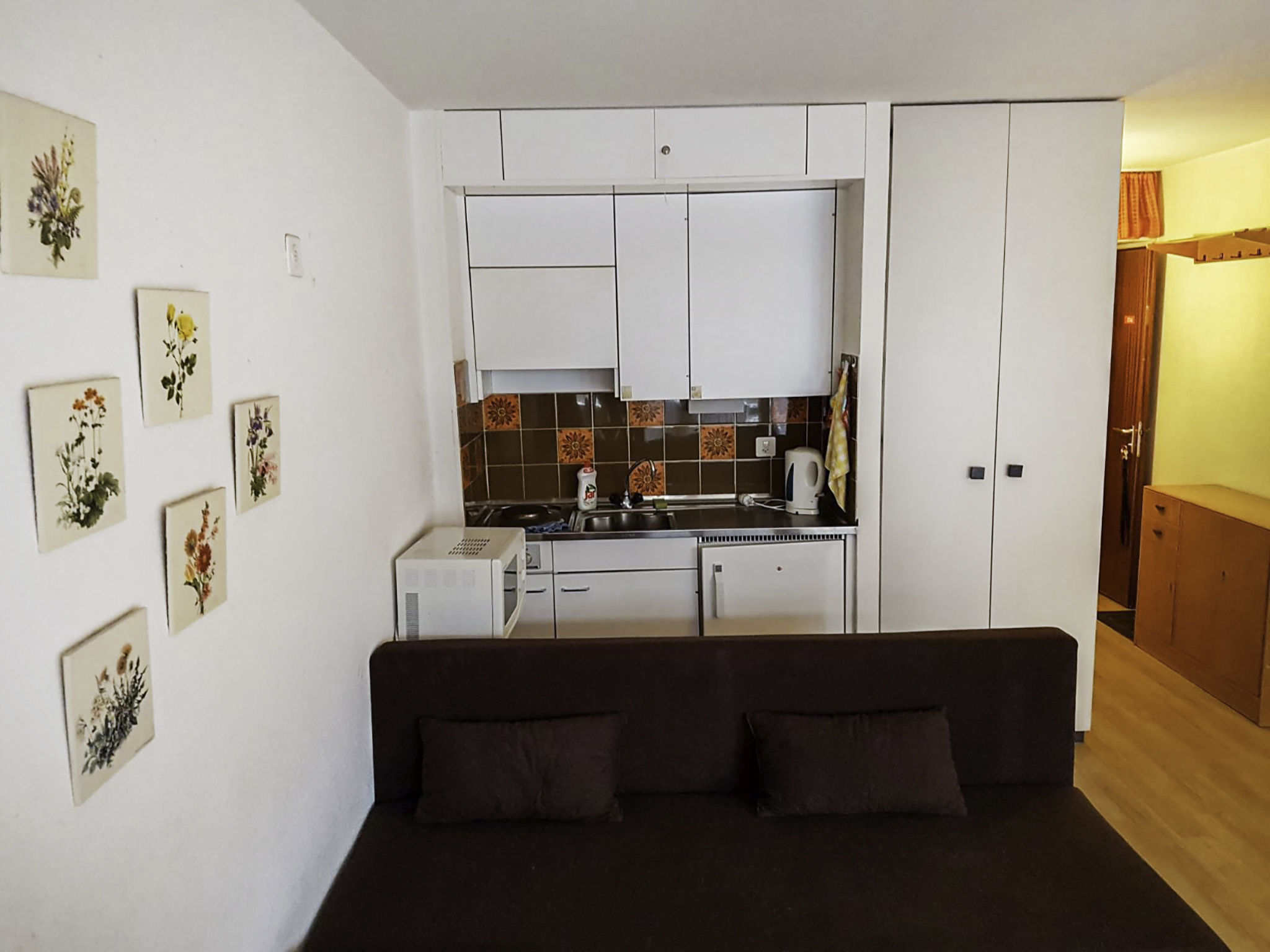 "Greppon 111", 1-Zimmer-Studio 28 m2 im 4. Stock. Komfortabel und geschmackvoll eingerichtet: Wohn-/Esszimmer mit 1 Diwanbett (160 cm, Länge 190 cm), 1 Wandklappbett (90 cm, Länge 190 cm), TV. Ausgang zum Balkon. Offene Küche (Geschirrspüler, 3 Glaskeramikplatten). Bad/WC. Balkon, Ostlage. Sehr schöne Sicht auf die Berge und die Landschaft. Bitte beachten: Nichtraucher-Unterkunft.