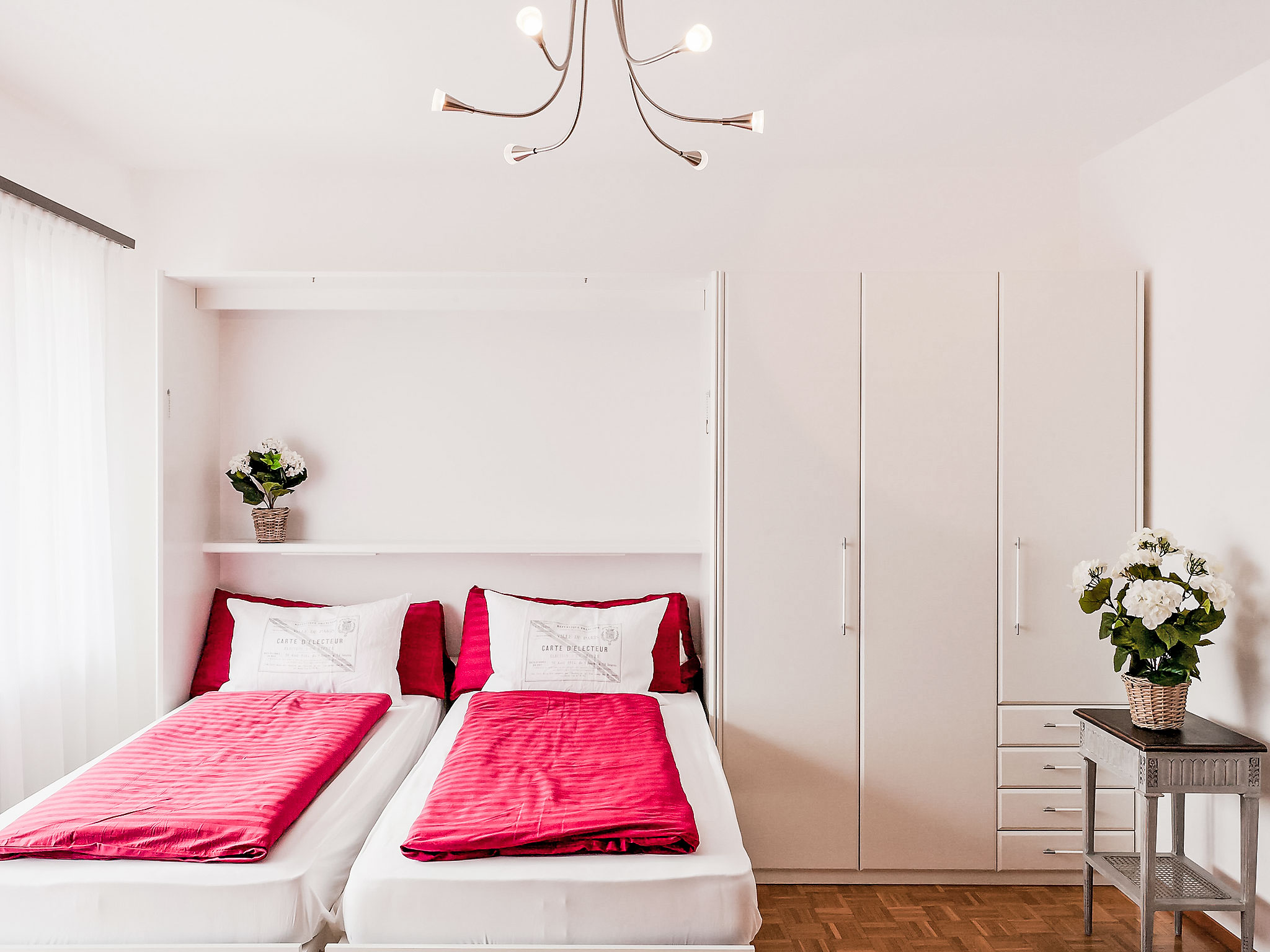 "Double Room", 1-Zimmer-Wohnung 35 m2 im 3. Stock, Südlage. Zweckmässig eingerichtet: Wohn-/Esszimmer mit 2 Wandschrankbetten (90 cm, Länge 200 cm), Sat-TV und Radio. Küche (4 Kochplatten, Backofen, Geschirrspüler, elektrische Kaffeemaschine, Kapseln für die Kaffeemaschine (Nespresso) extra). Bad/WC. Warmluftheizung. Balkon. Terrassenmöbel. Zur Verfügung: Internet (Wireless LAN, gratis). Bitte beachten: Nichtraucher-Unterkunft. Maximal 1 Haustier/Hund erlaubt. NL-00004999