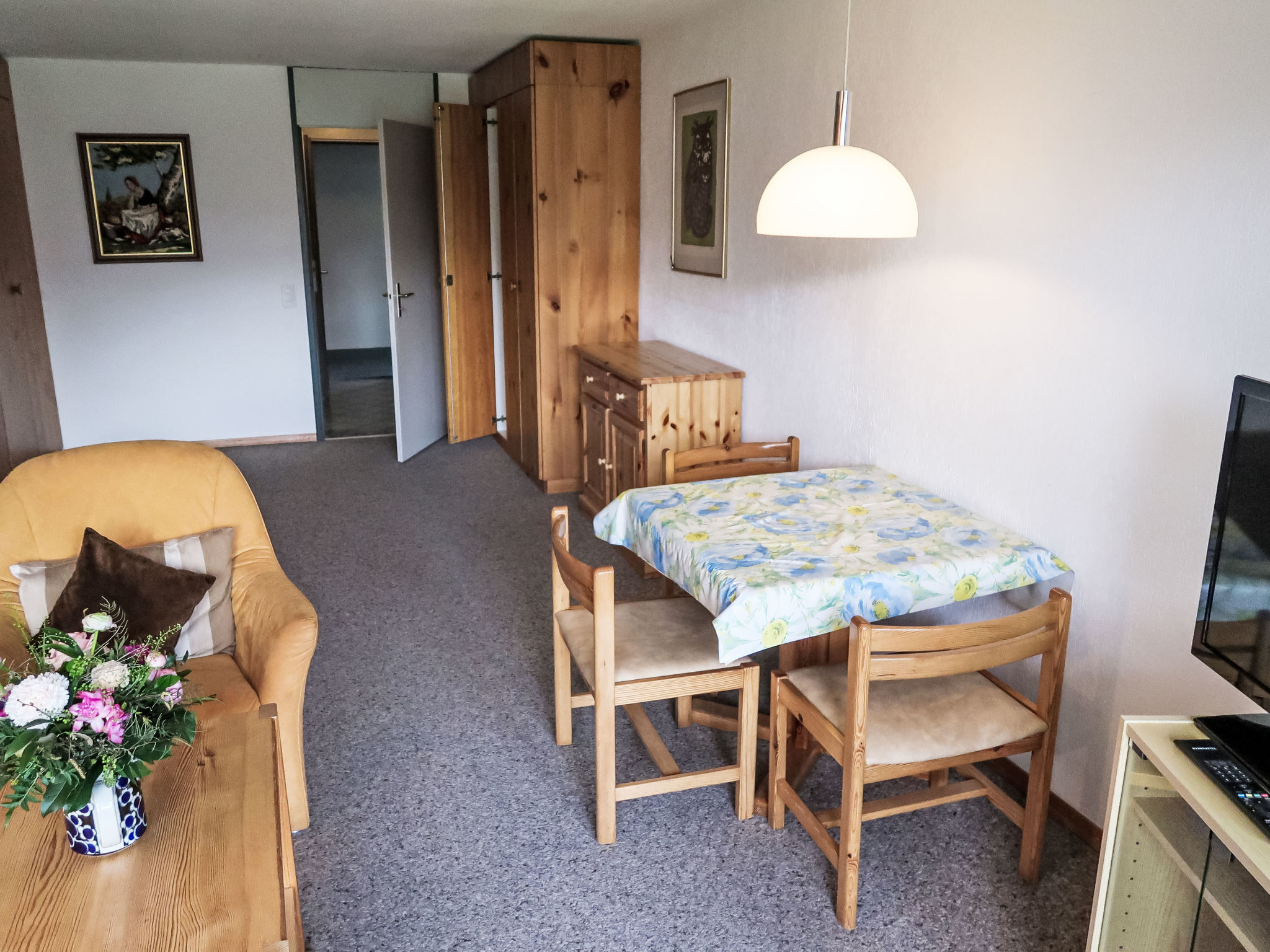 "Apt B 093", 1-Zimmer-Wohnung 39 m2 im 9. Stock. Teilweise renoviert im Jahre 2023, gemütlich eingerichtet: Wohn-/Esszimmer mit 2 Wandschrankbetten und Sat-TV (Flachbildschirm). Kochnische im Eingang (Geschirrspüler, 2 Glaskeramikplatten, Mikrowelle). Bad/WC. Balkon, Südlage. Balkonmöbel. Schöne Sicht auf die Berge, die Landschaft und Medelsergletscher. Zur Verfügung: Internet (Wireless LAN, gratis). Garage beim Haus. Maximal 1 Haustier/Hund erlaubt.