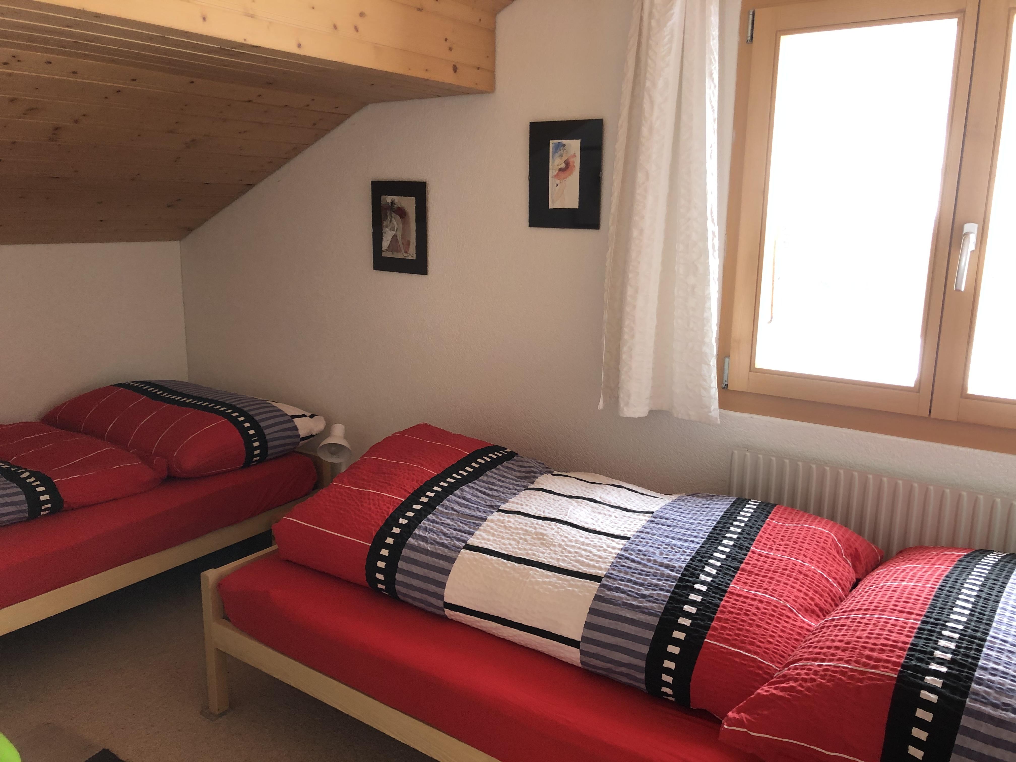 Helle Wohnung im Dachstock. Eigener Zugang und kleiner Balkon mit Abendsonne. Neues Badezimmer. Gut eingerichtete Küche mit Abwaschmaschine. Offene Küche und Wohnraum. Ein Schlafzimmer mit Doppelbett, zweites Zimmer mit zwei Einzelbetten. Bett-, Küchen- und Badwäsche inklusive.