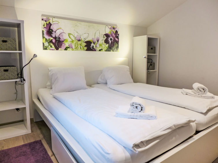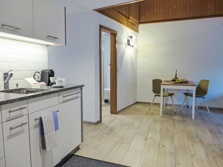 2-Zimmer-Wohnung 50 m2 im 1. Stock, Südlage. Vollständig renoviert im Jahre 2021, modern und gemütlich eingerichtet: Wohn-/Esszimmer mit Kabel-TV (Flachbildschirm). 1 Doppelzimmer (2 x 90 cm, Länge 200 cm). Offene Küche (Backofen, Geschirrspüler, 4 Glaskeramikplatten, Toaster, Wasserkocher, elektrische Kaffeemaschine, Kapseln für die Kaffeemaschine (Nespresso) extra, Racletteofen, Fondue Set (Käse)). Dusche/WC. Natursteinboden. Eingeschränkte Sicht auf die Berge. Zur Verfügung: Internet (Wireless LAN, gratis). Parkplatz beim Haus. Bitte beachten: eigener Eingang.
