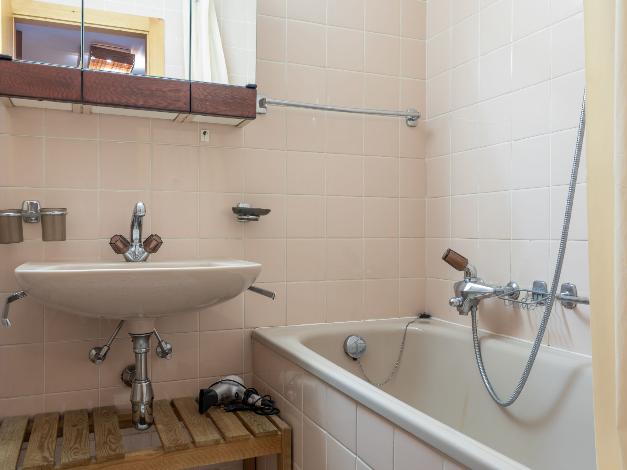 "Dents Rousses H2", 2-Zimmer-Wohnung 45 m2 im 2. Stock. Einfach eingerichtet: Eingang mit 1 x 2 Etagenbetten (80 cm, Länge 190 cm). Wohn-/Esszimmer mit Kabel-TV. Ausgang zum Balkon, Richtung Süden. 1 Zimmer mit 1 Doppelbett (2 x 90 cm, Länge 200 cm). Kochnische (3 Kochplatten, Backofen, Geschirrspüler, Toaster, Wasserkocher). Bad/WC. Balkon, Südlage. Zur Verfügung: Haartrockner. Internet (WLAN). Garage Nr. 7, Höhe 210 cm, Breite 200 cm. Bitte beachten: Nichtraucher-Haus, Parkplatz nur für kleine Wagen. Kamin ausser Betrieb. Anstelle eines abgeschlossenen Schlafzimmers befinden sich manche Schlafplätze in einem offenen Bereich (Galerie, Nische etc.).