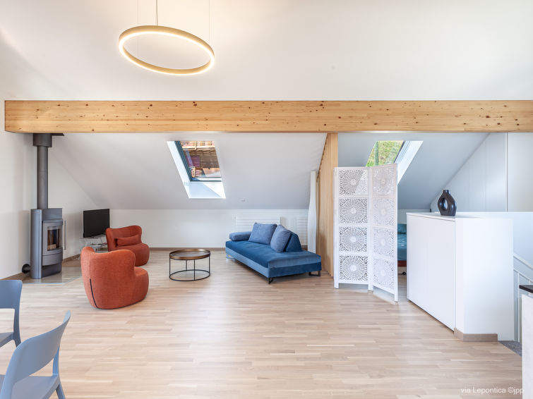 1-Zimmer-Loft 73 m2, im Dachgeschoss, Südostlage. Objekt geeignet für 2 Erwachsene. Geräumig und hell, teilweise abgeschrägt, vollständig renoviert, modern und geschmackvoll eingerichtet: offenes Wohn-/Esszimmer mit Panoramafenster mit Schwedenofen, Esstisch und TV mit 1 Doppelbett (1 x 160 cm, Länge 200 cm). Abgeschrägte, offene Küche (Backofen, Geschirrspüler, 4 Induktionskochplatten, Toaster, Wasserkocher, elektrische Kaffeemaschine, Kapseln für die Kaffeemaschine (Nespresso) extra). Dusche, sep. WC. Heizung. Holzdielenboden. Grosser Balkon, Südlage. Balkonmöbel. Sehr schöne Sicht auf die Berge, das Tal und die Ortschaft. Zur Verfügung: Haartrockner, Holz (extra). Internet (Wireless LAN, gratis). Bitte beachten: Nichtraucher-Unterkunft. Rauchmelder, kein Fahrstuhl. NL-00007423