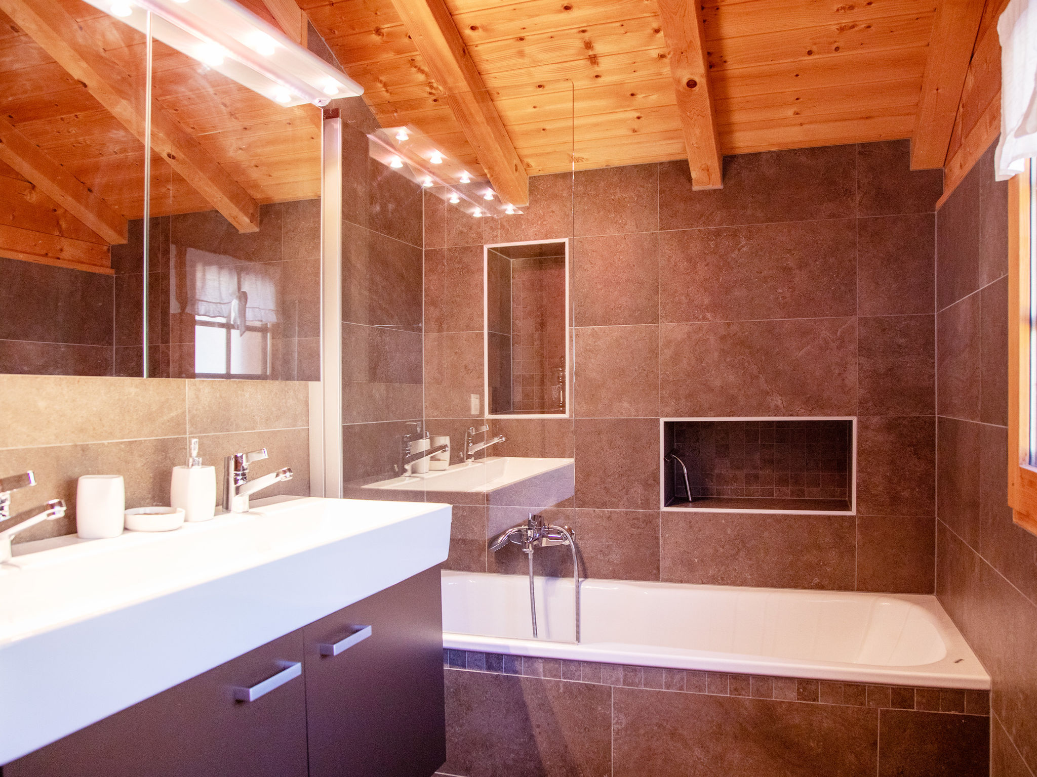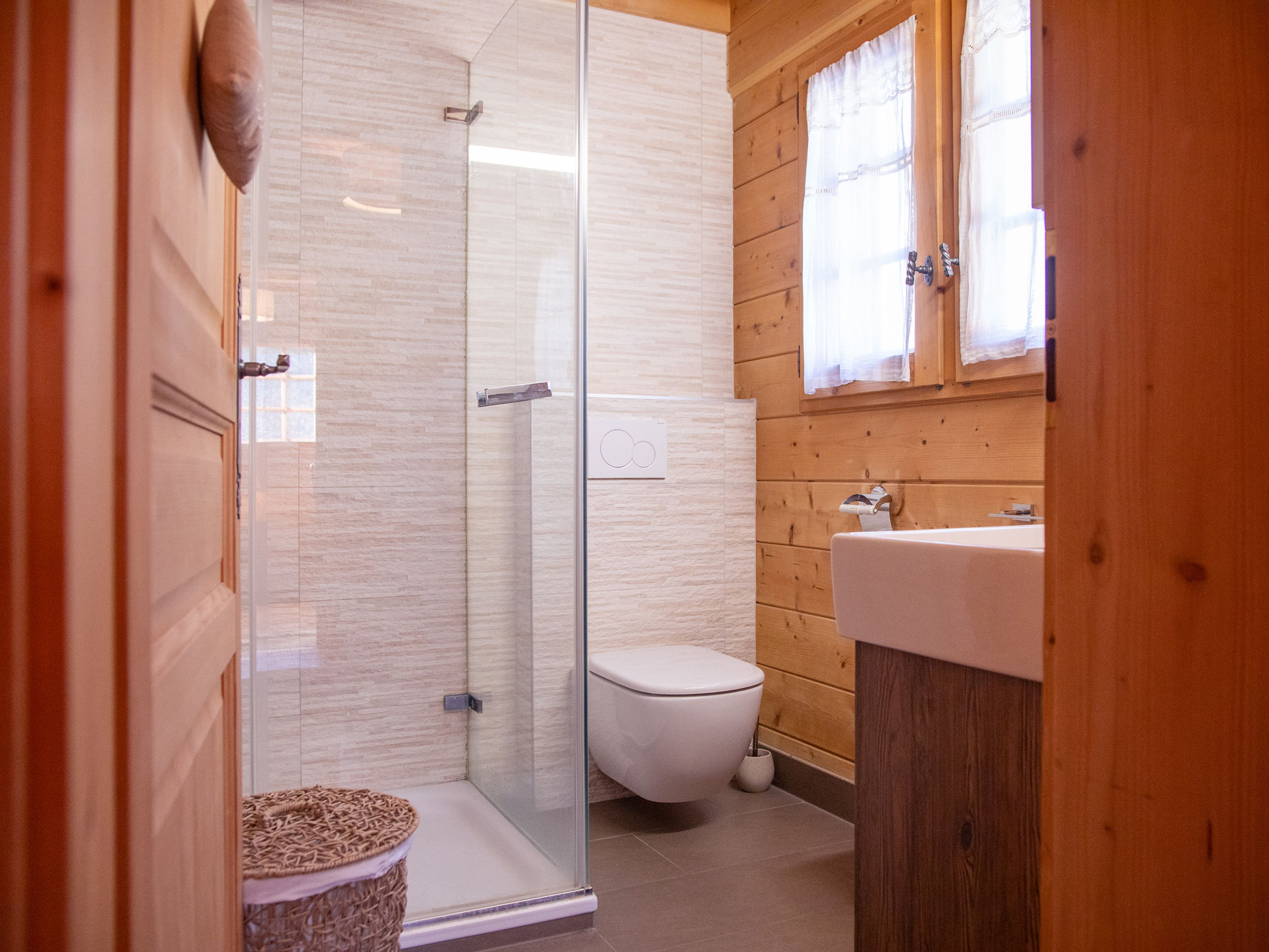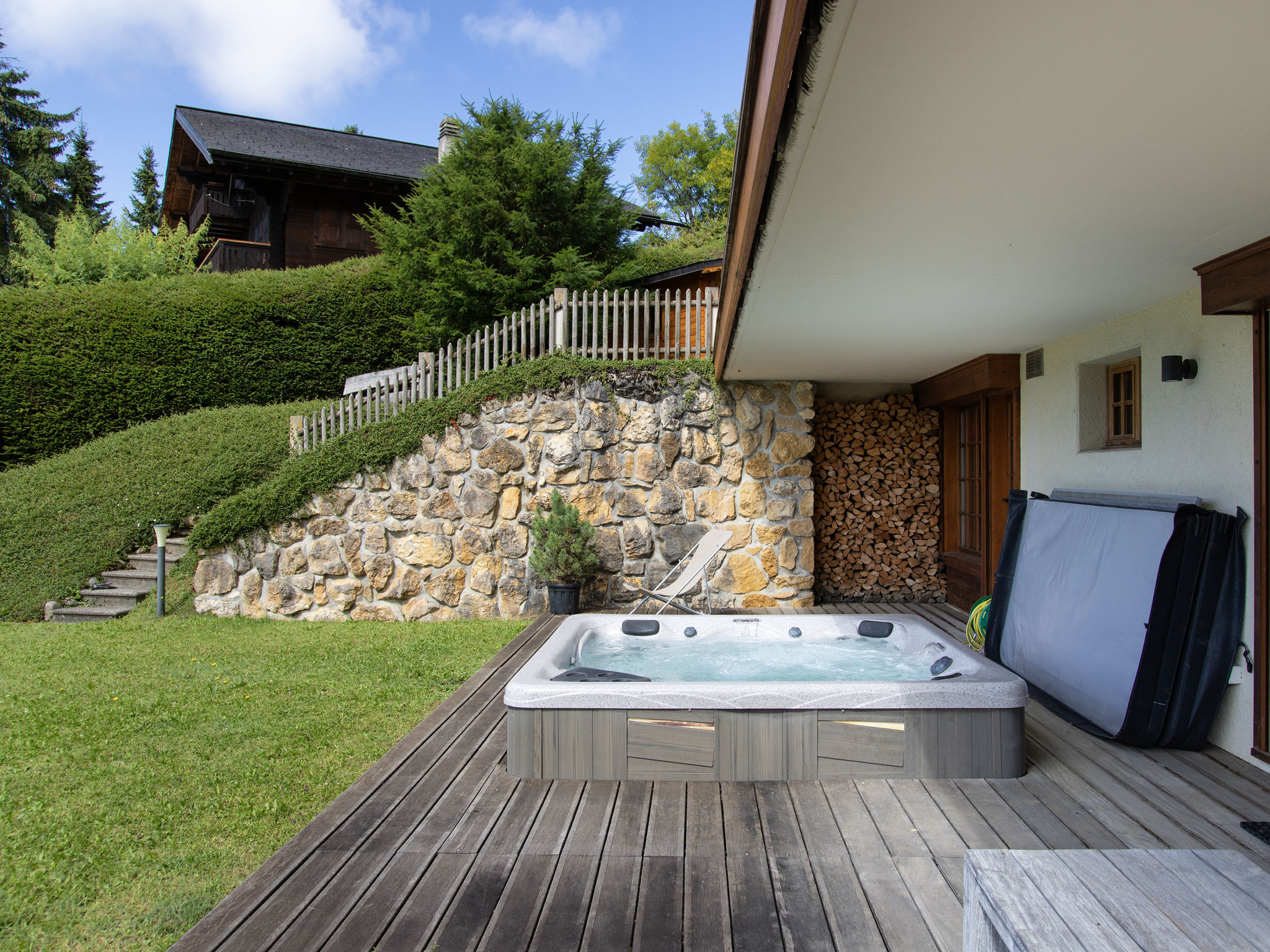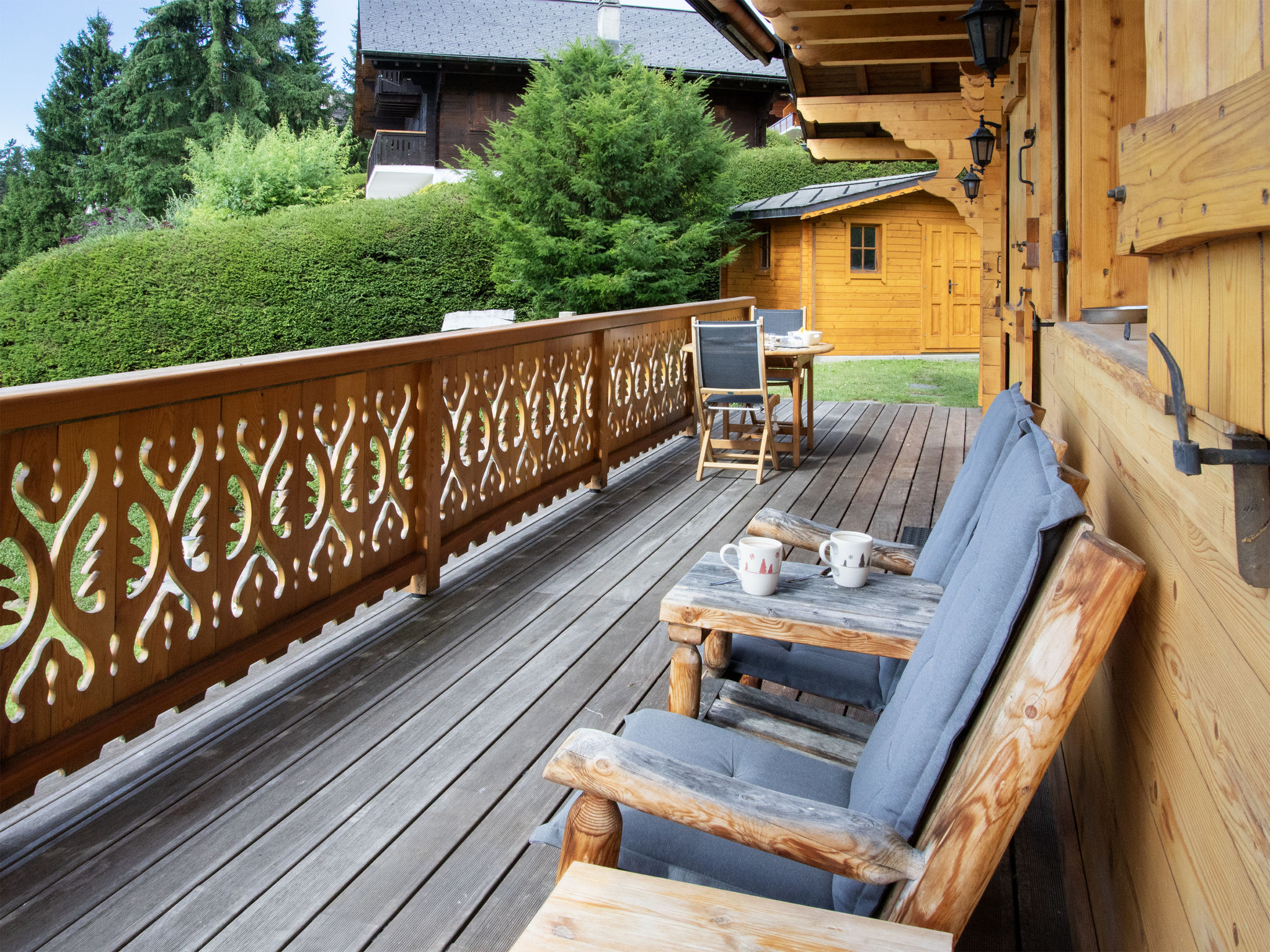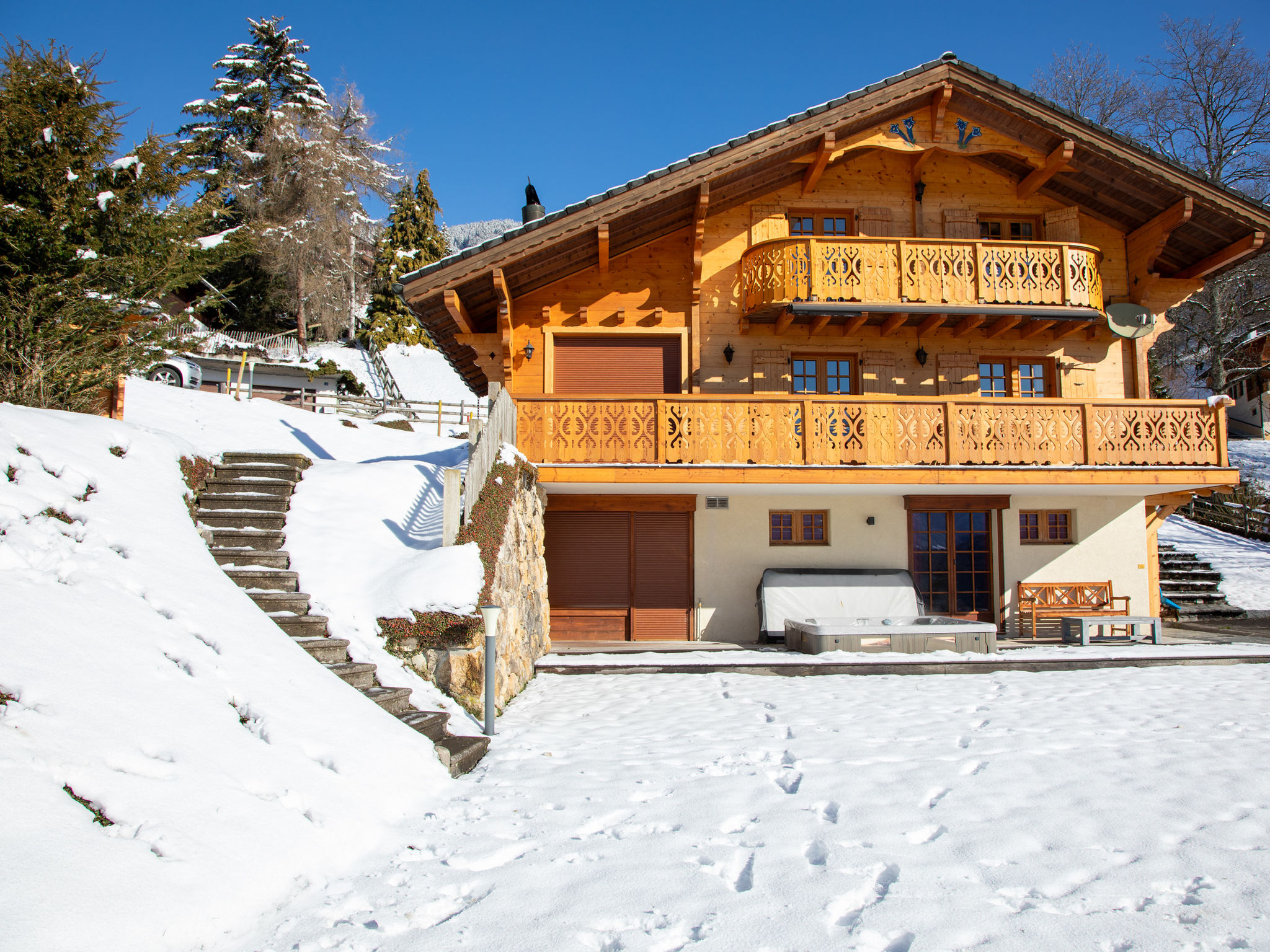 "Chalet Nirvana", 7-Zimmer-Chalet 200 m2 auf 3 Stockwerken, Südlage. Objekt geeignet für 6 Erwachsene + 2 Kinder. Sehr komfortabel und geschmackvoll eingerichtet: Wohn-/Esszimmer mit offenem Kamin, Esstisch und TV (Flachbildschirm). Ausgang zum Balkon. Salon. Offene Küche (Backofen, Geschirrspüler, 6 Induktionskochplatten, Toaster, Wasserkocher, Tiefkühler, elektrische Kaffeemaschine, Kapseln für die Kaffeemaschine (Nespresso) extra, Dampfgarer, Racletteofen). Dusche/WC. Unteres Geschoss: Salon mit TV (Flachbildschirm). Ausgang zum Garten, Richtung Süden. 1 Zimmer, ohne Schrank mit 1 Doppelbett (1 x 160 cm). Ausgang zum Garten, Richtung Süden. Dusche/WC. Obergeschoss: 1 Zimmer mit 1 Doppelbett (1 x 180 cm). Ausgang zum Balkon, Richtung Süden. 1 Kinderzimmer mit 2 Betten (90 cm, Länge 190 cm). 1 Zimmer mit 1 franz. Bett (1 x 160 cm). Ausgang zum Balkon, Richtung Süden. Bad/WC. Grosser Balkon, Südlage, kleiner Balkon, Südlage, grosser, Garten, Südlage. Balkonmöbel, Gartengrill, Liegestühle. Sehr schöne Sicht auf die Berge. Zur Verfügung: Waschmaschine, Wäschetrockner, Haartrockner. Internet (WLAN, gratis). Parkplatz, Garage (1 Auto). E-Ladestation. Bitte beachten: Nichtraucher-Haus.