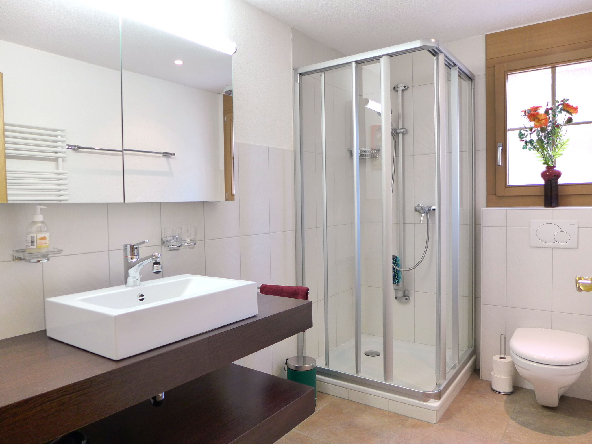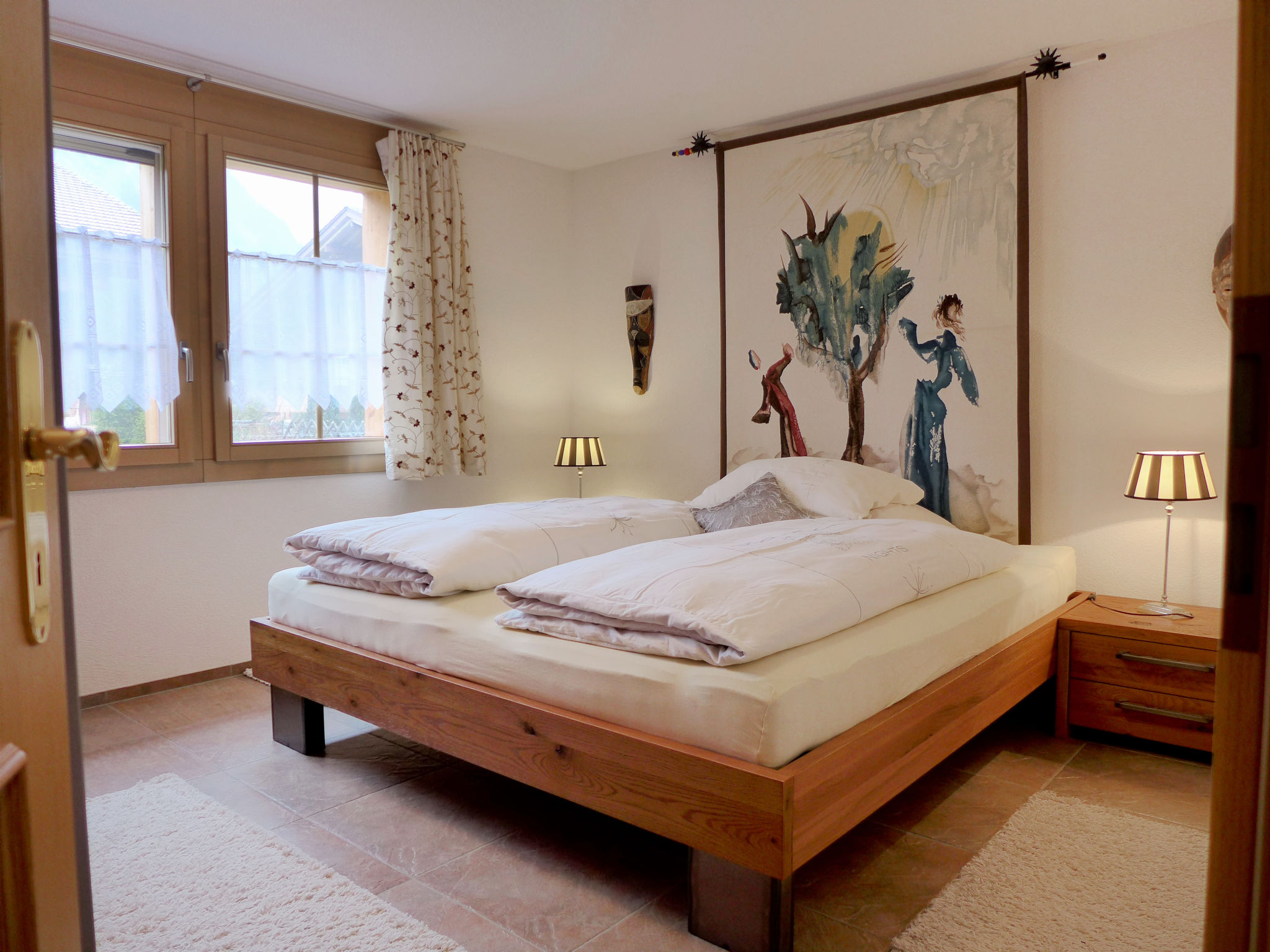 "Laerchehus West", 3-Zimmer-Wohnung 80 m2, im Erdgeschoss, Südwestlage. Geräumig und hell, komfortabel und geschmackvoll eingerichtet: offenes Wohn-/Esszimmer mit Esstisch, Digital-TV, Radio, CD, DVD und DVD Sammlung vorhanden. Ausgang zur Terrasse. 1 Zimmer mit 1 Doppelbett (180 cm, Länge 200 cm). 1 Zimmer mit 2 Betten (90 cm, Länge 200 cm). Grosse, offene Küche (Backofen, Geschirrspüler, 4 Glaskeramikplatten, Toaster, Wasserkocher, Mikrowelle, Tiefkühler, elektrische Kaffeemaschine, Kapseln für die Kaffeemaschine (Nespresso) extra, Racletteofen, Fondue Set (Käse)) mit Küchenblock. Dusche/WC. Fussbodenheizung. Grosse Terrasse 30 m2, Südlage und Westlage. Terrassenmöbel. Herrliche Sicht auf die Berge und die Landschaft. Zur Verfügung: Bügeleisen, Fliegengitter, Haartrockner. Internet (WLAN, gratis). Parkplatz (überdacht). Bitte beachten: Nichtraucher-Unterkunft.