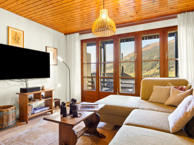 "Aragon B48", 1-Zimmer-Wohnung 38 m2 im 1. Stock. Zweckmässig und gemütlich eingerichtet: Wohn-/Schlafzimmer mit 2 Wandklappbetten und Kabel-TV (Flachbildschirm), Radio. Ausgang zum Balkon. Offene Küche (3 Kochplatten, Backofen) mit Esstisch. Bad/WC. Balkon. Balkonmöbel. Schöne Sicht auf die Berge, das Tal und die Landschaft. Zur Verfügung: Babybett (extra). Internet (Wireless LAN, gratis). Garage Nr. 15. Bitte beachten: Nichtraucher-Unterkunft. Maximal 1 Haustier/Hund erlaubt.