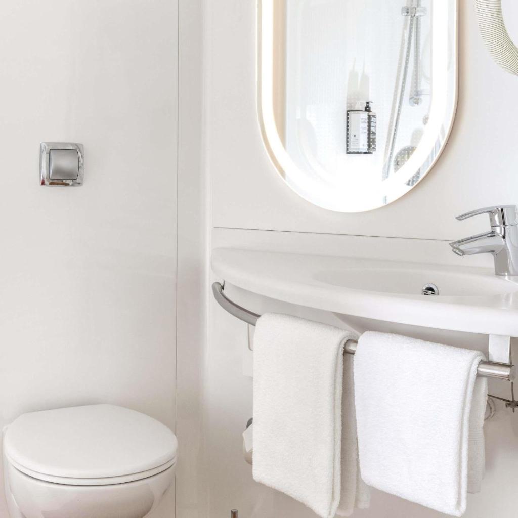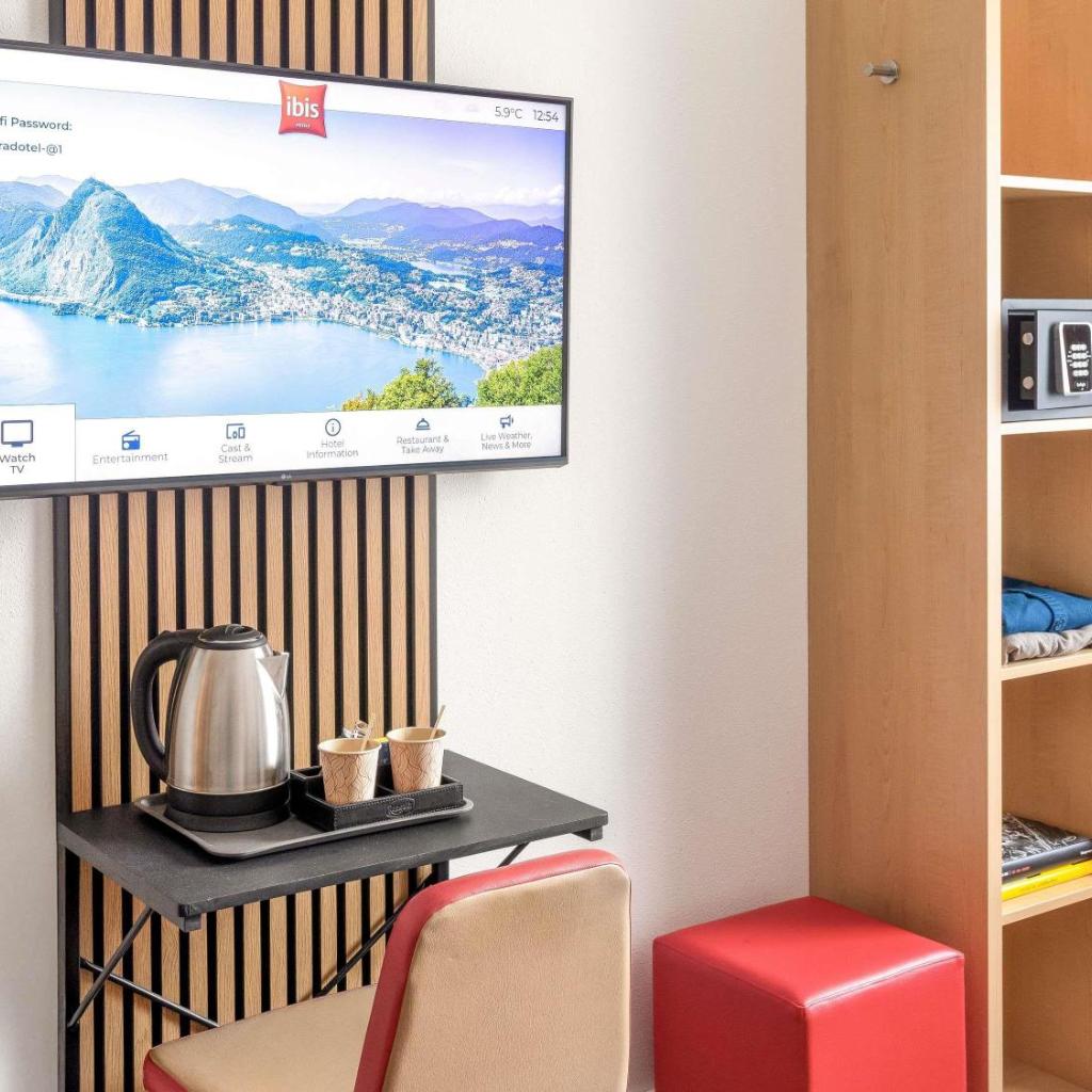 Die modernen, klimatisierten Zimmer im Lugano-Paradiso ibis verfügen über einen Flachbild-Kabel-TV, einen Sitzbereich, feuerfeste Böden und ein Badezimmer mit einem Haartrockner.
