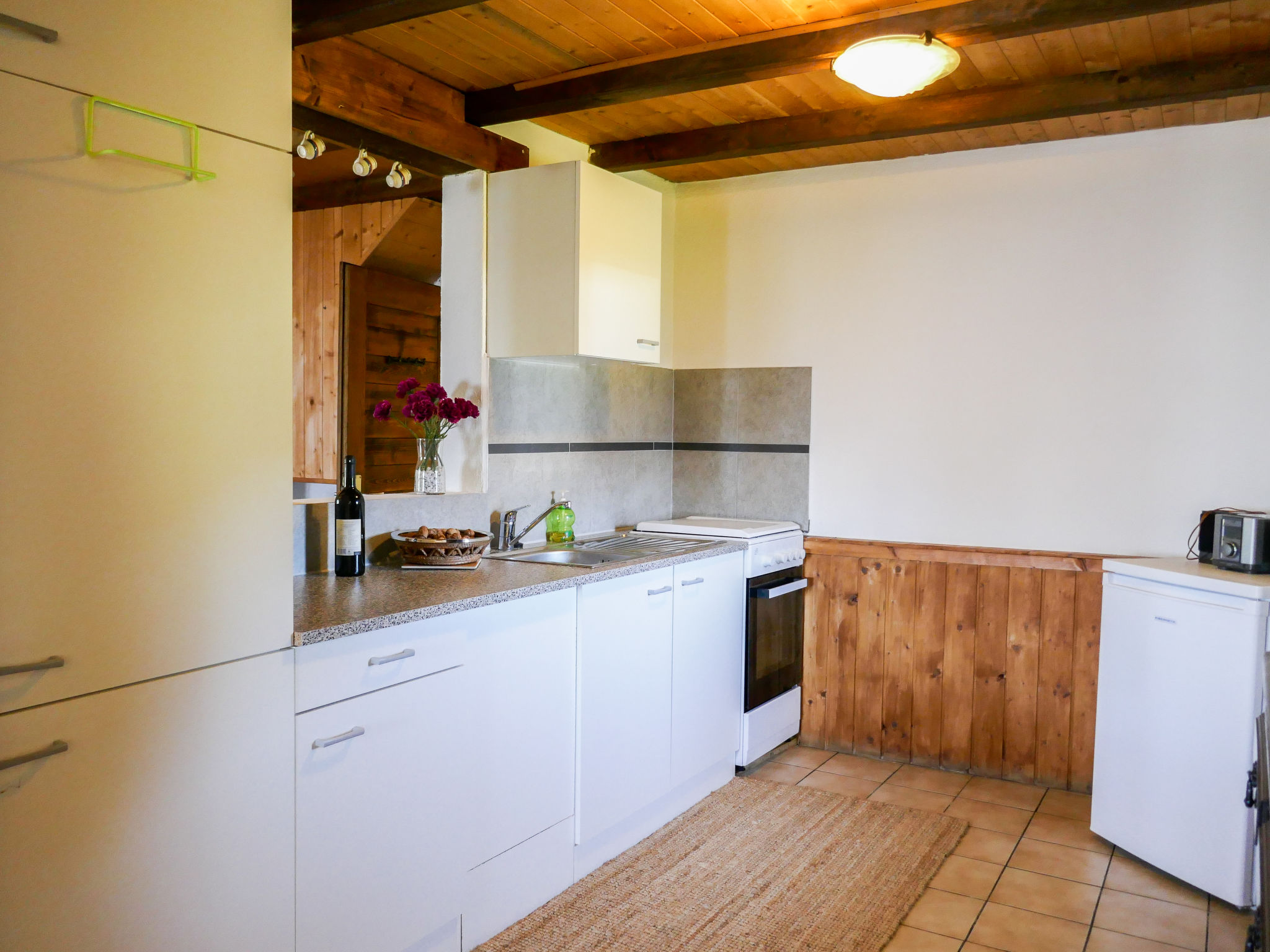 "Baita Ficc", 2-Zimmer-Landhaus 58 m2 auf 2 Stockwerken, Südlage. Teilweise abgeschrägt, zweckmässig und rustikal eingerichtet: offenes grosses Wohn-/Esszimmer mit offenem Kamin, Essecke und Sat-TV (Flachbildschirm). Ausgang zum Garten, zur Terrasse. Offene Küche (Gasherd, 4 Flammen) mit Holzofen. Dusche/WC. Holzheizung. Solarstrom. Obergeschoss: 1 abgeschrägtes, offenes grosses Zimmer mit 1 Bett (90 cm, Länge 200 cm), 1 franz. Bett (1 x 160 cm, Länge 190 cm), 1 Doppelbett (1 x 160 cm, Länge 200 cm). Terrassenmöbel, Liegestühle (2). Herrliche Panoramasicht auf die Berge, das Tal und die Landschaft. Zur Verfügung: Kinderhochstuhl, Babybett bis 2 Jahre (extra). Bitte beachten: Nichtraucher-Haus. Maximal 1 Haustier/Hund erlaubt. Feuerlöscher. Die Stromversorgung erfolgt über ein Solarpanel und Generator. Herd und Warmwasserboiler wird mit Gas betrieben. Elektrogeräte über 250W können nicht betrieben werden. Wichtiger Hinweis zu beachten: Bergstraße 20 km von Malvaglia in Echtzeit 40 Minuten. NL-00003849