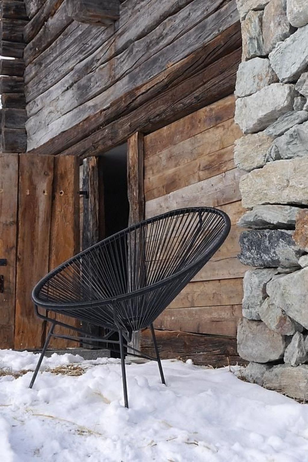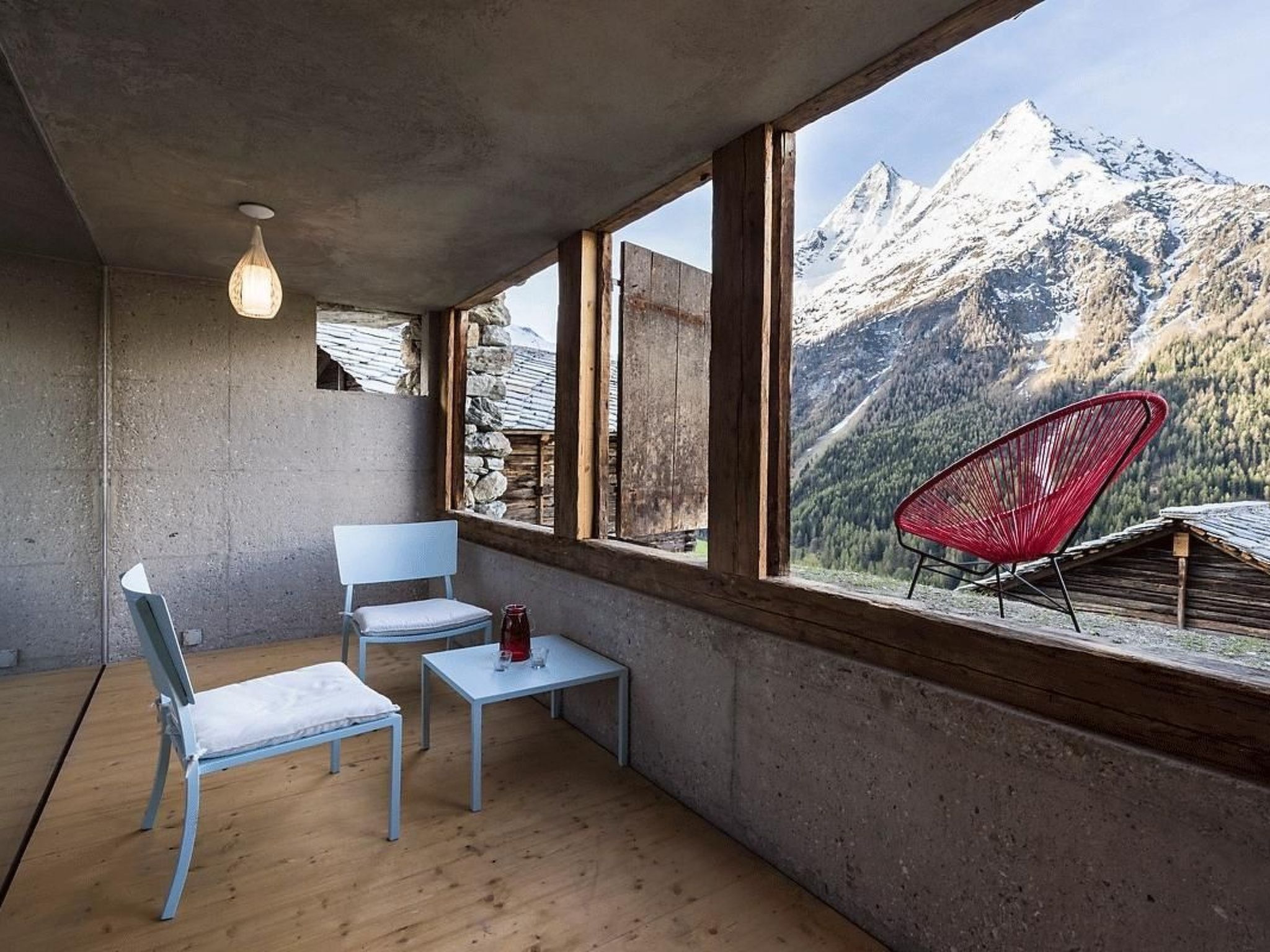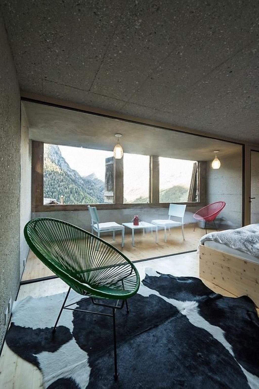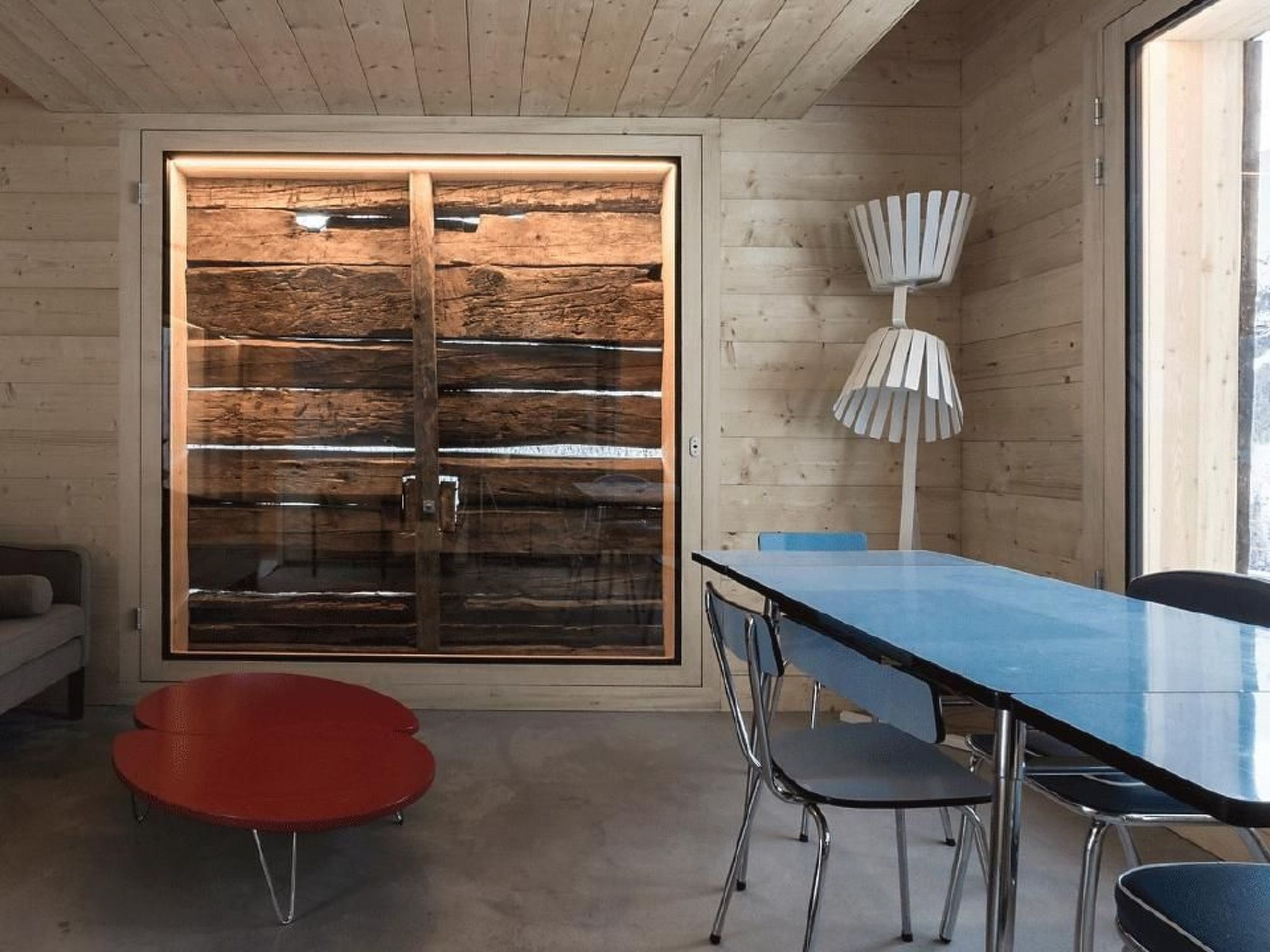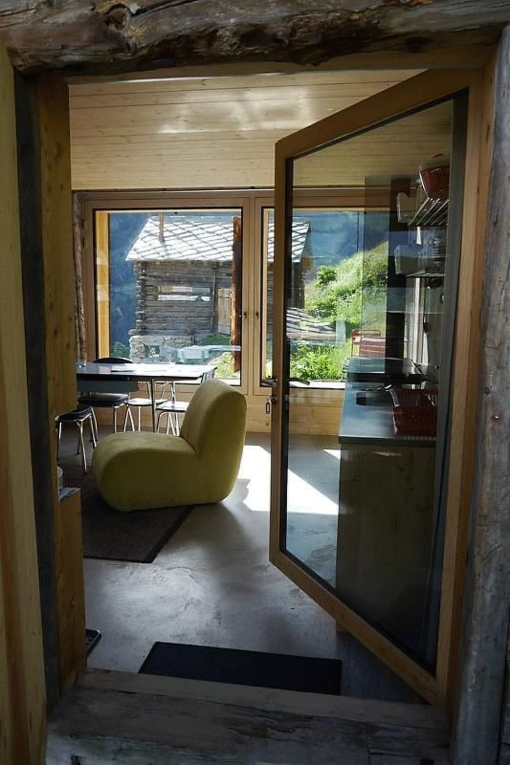 Die ehemalige Scheune beherbergt den Hauptwohnbereich, der aus einer Einbauküche, einem Esstisch und einem Entspannungsbereich besteht. Der Wohnbereich umfasst auch den Holzofen, mit dem das gesamte Maiensäss im Geist vergangener Zeiten beheizt werden kann. Große Öffnungen an den Seiten ermöglichen den Blick auf das Tal in einem entschieden modernen Ambiente, diese Öffnungen bestehen aus