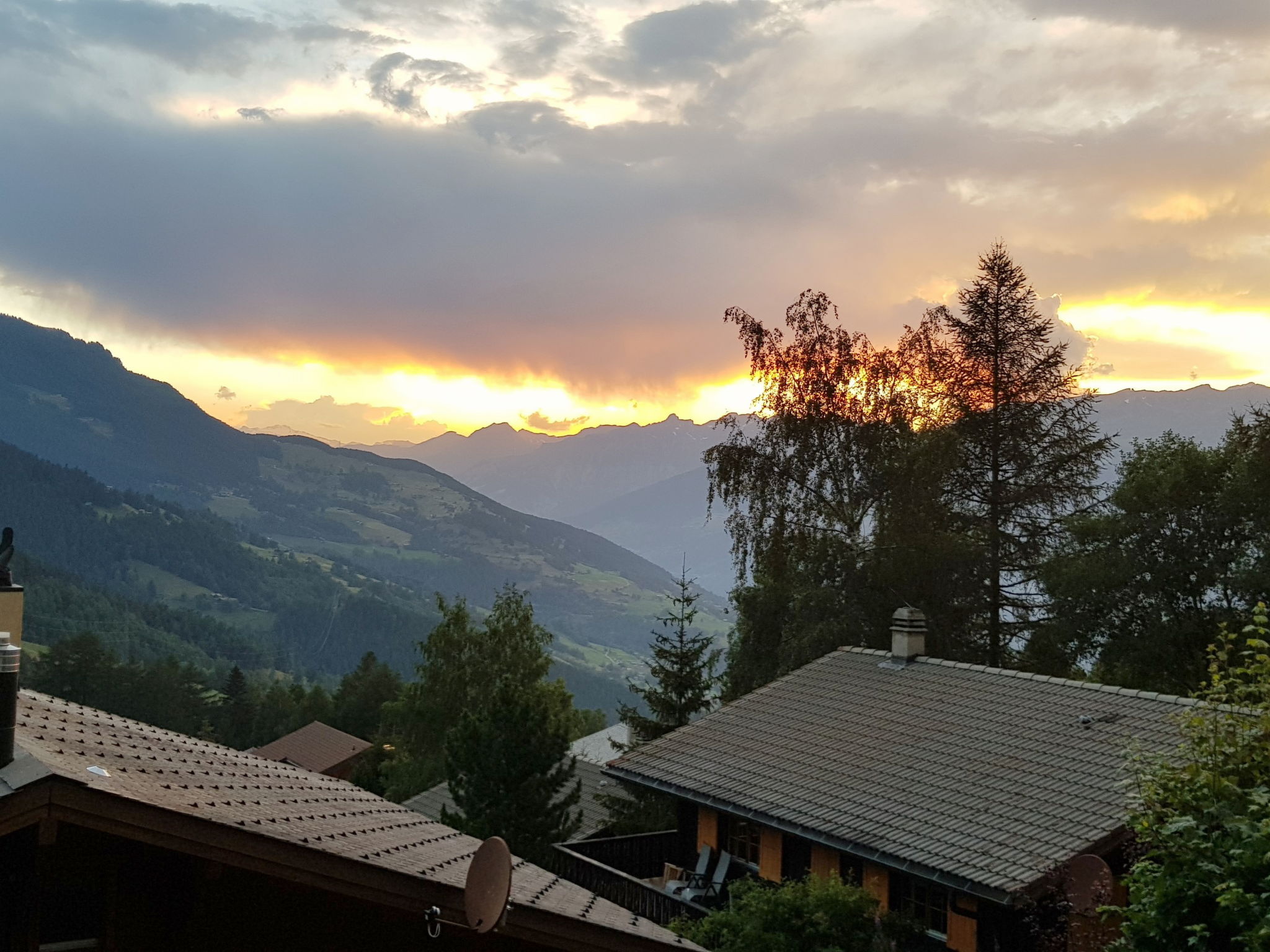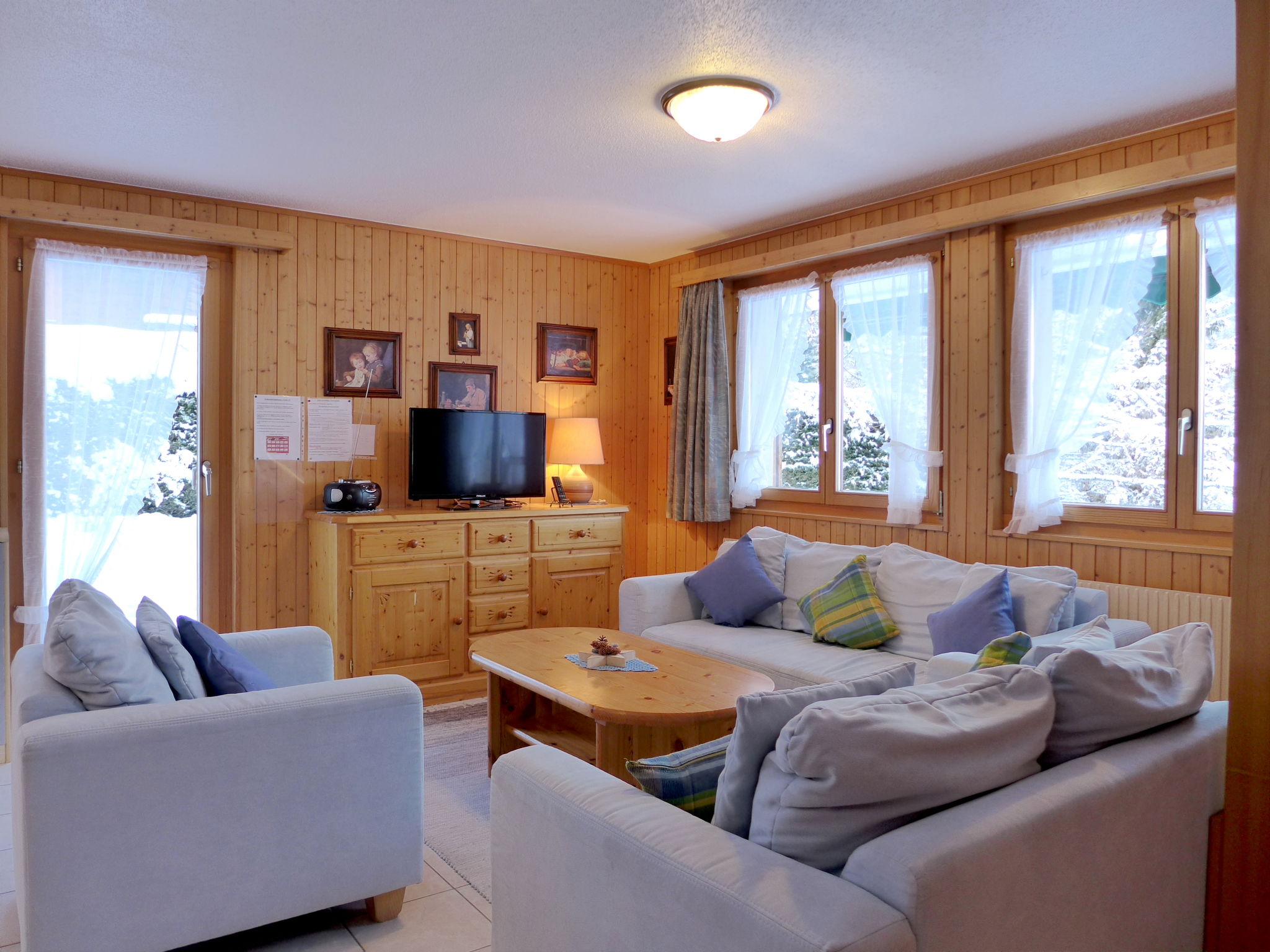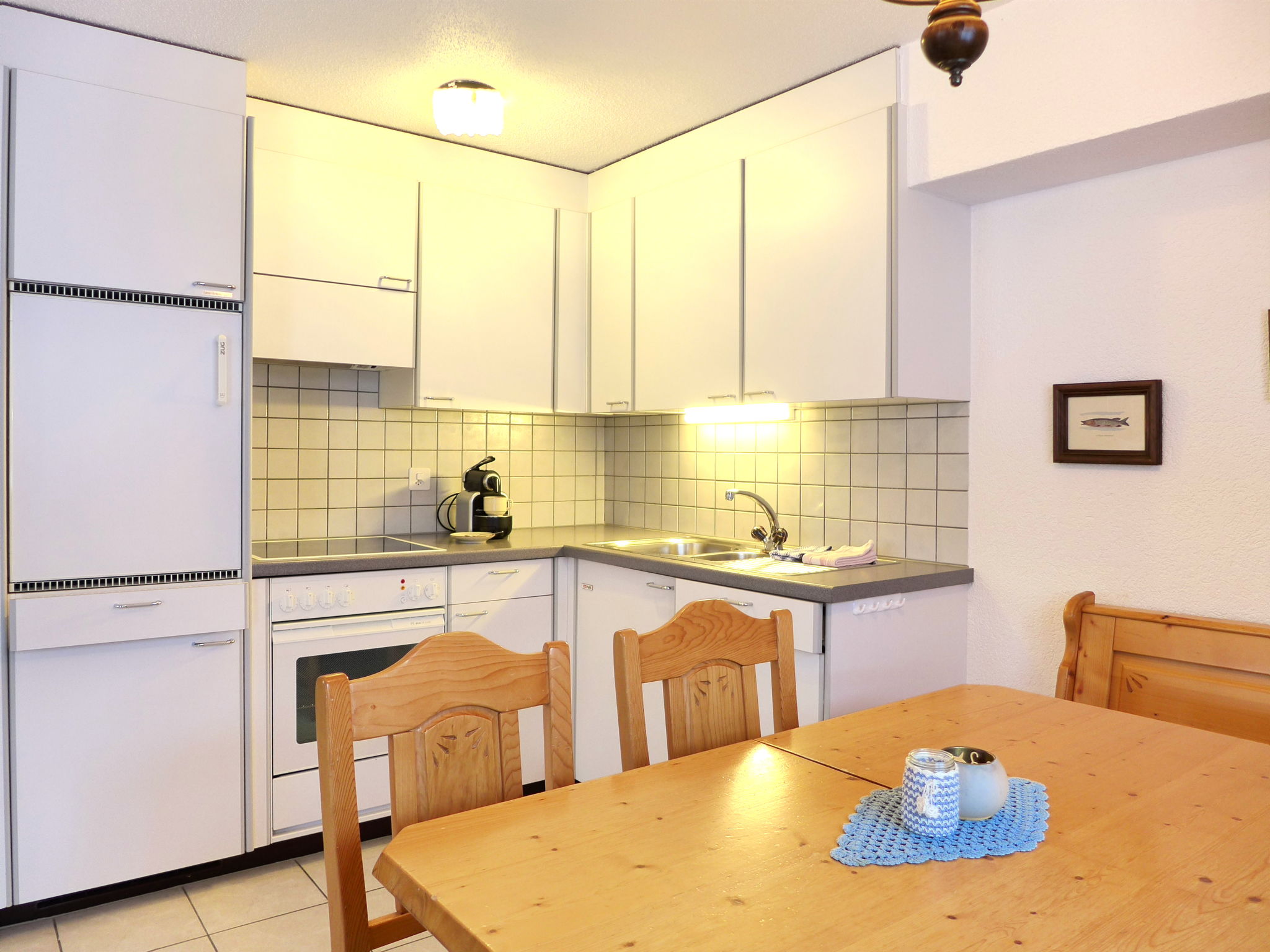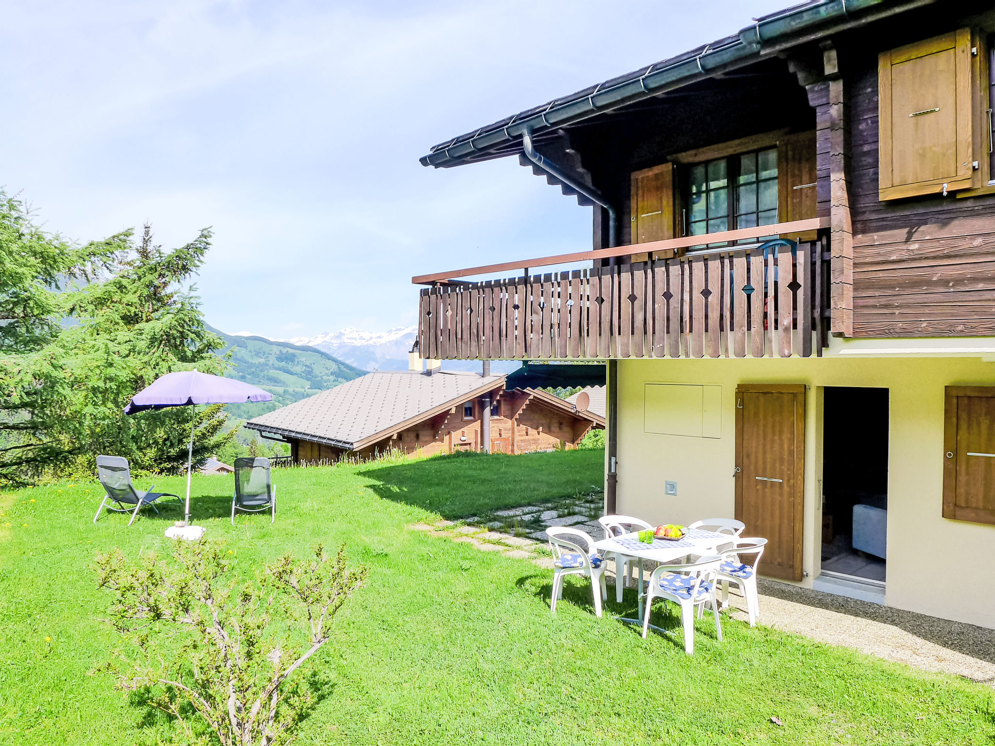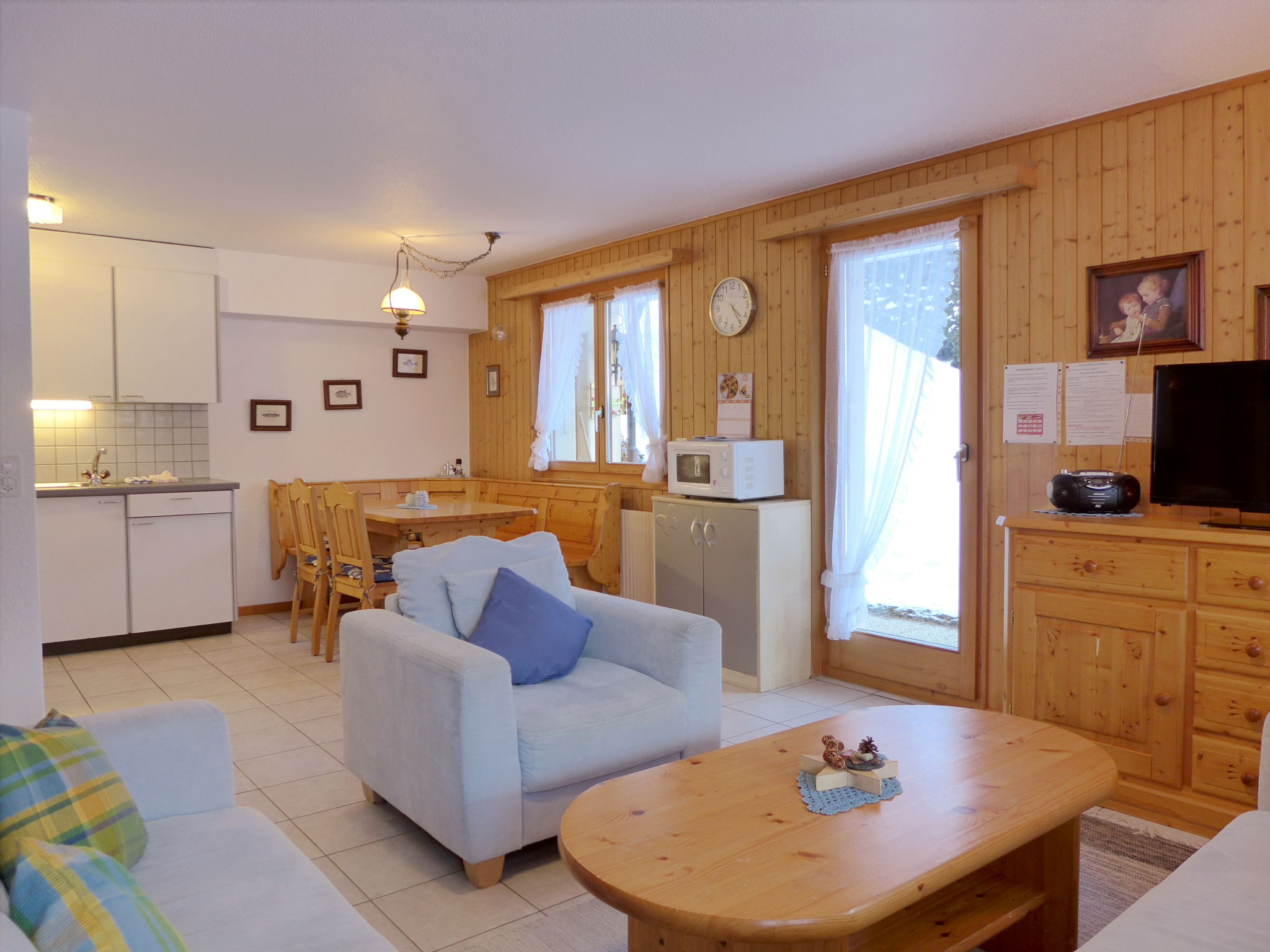 3-Zimmer-Wohnung im Erdgeschoss. Geräumig und hell, sehr komfortabel und gemütlich eingerichtet: offenes Wohn-/Esszimmer mit offenem Kamin, Essecke und Digital-TV. Ausgang zur Terrasse. 1 Zimmer mit 1 Doppelbett (2 x 90 cm, Länge 200 cm). 1 Kinderzimmer mit 1 Bett (80 cm, Länge 190 cm), 1 x 2 Etagenbetten (80 cm, Länge 190 cm). Offene Küche (4 Glaskeramikplatten, Toaster, Wasserkocher, Mikrowelle, elektrische Kaffeemaschine, Kapseln für die Kaffeemaschine (Nespresso) extra, Racletteofen, Fondue Set (Käse)). Dusche/WC. Grosse Terrasse, Gartensitzplatz. Terrassenmöbel, Liegestühle. Herrliche Panoramasicht auf die Berge und die Landschaft. Zur Verfügung: Waschmaschine, Holz (extra). Internet (WLAN, gratis). Garage in 400 m. Bitte beachten: Nichtraucher-Haus. 1 kleines Haustier/Hund erlaubt. Rauchmelder, Feuerlöscher.
