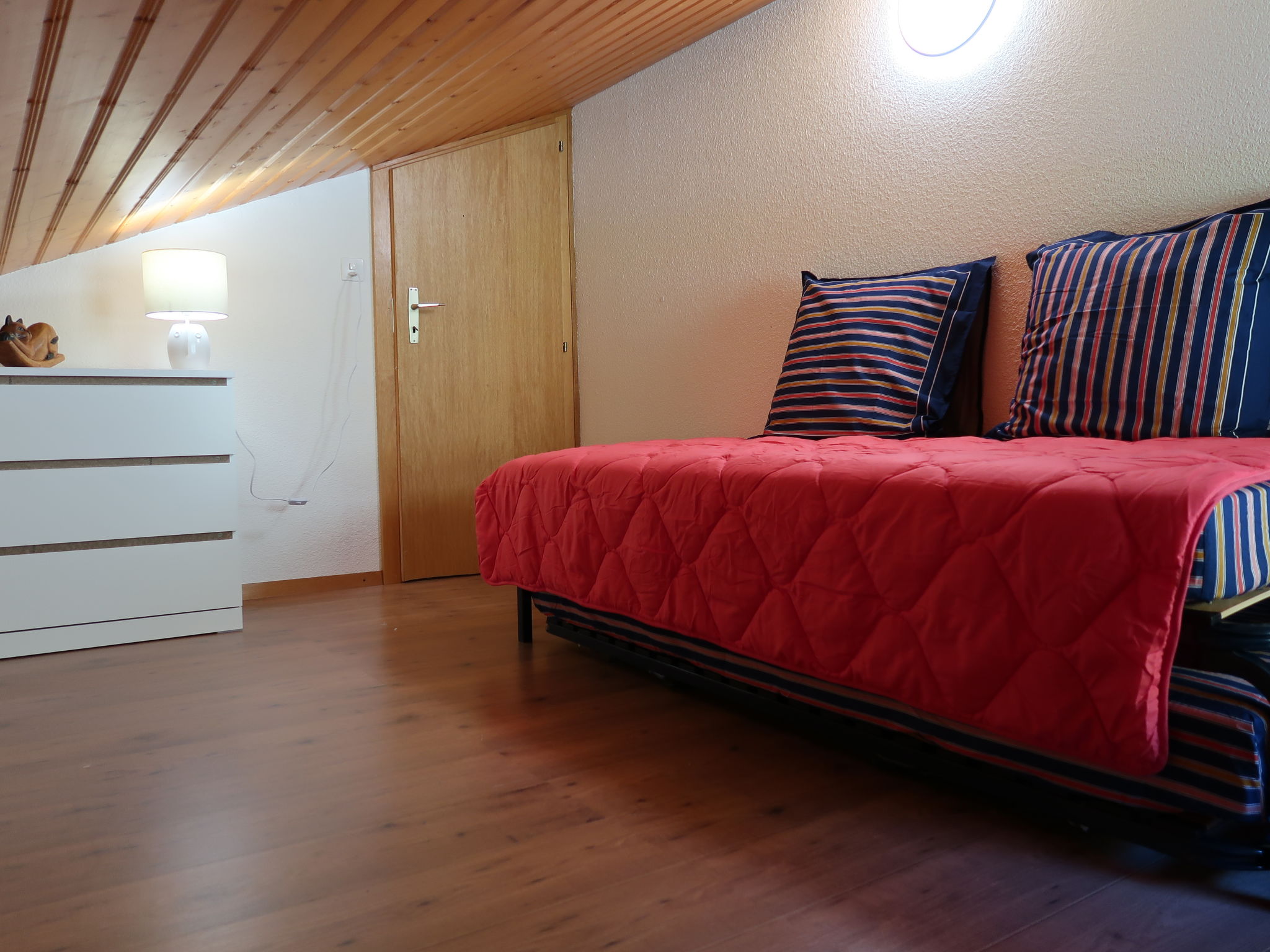 "Cassiopée 26", 3-Zimmer-Attikawohnung 56 m2 im 3. Stock, Südlage. Objekt geeignet für 2 Erwachsene + 1 Kind. Hell, geschmackvoll und mit viel Holz eingerichtet: Wohn-/Esszimmer mit offenem Kamin (nur Deko), Essecke und TV. Ausgang zum Balkon. 1 Zimmer mit 1 Doppelbett (140 cm, Länge 200 cm). 1 abgeschrägtes kleines Kinderzimmer, Deckenhöhe 35 - 170 cm mit 1 Ausziehbett (2 Pers. 2 x 80 cm, Länge 200 cm). Offene Küche (Geschirrspüler, 4 Glaskeramikplatten, Toaster, Wasserkocher, Mikrowelle, Tiefkühler, elektrische Kaffeemaschine, Kapseln für die Kaffeemaschine (Nespresso), Racletteofen, Fondue Set (Käse)). Bad, sep. WC. G-Heizung. Balkon 8 m2, Südlage. Herrliche Sicht auf die Berge und das Tal. Zur Verfügung: Haartrockner. Internet (Wireless LAN, gratis). Bitte beachten: Nichtraucher-Unterkunft.