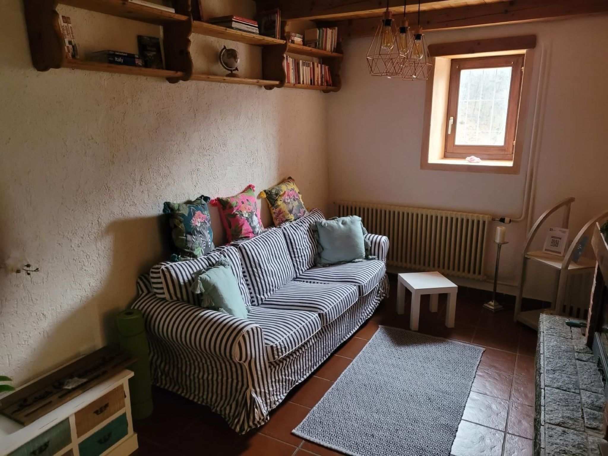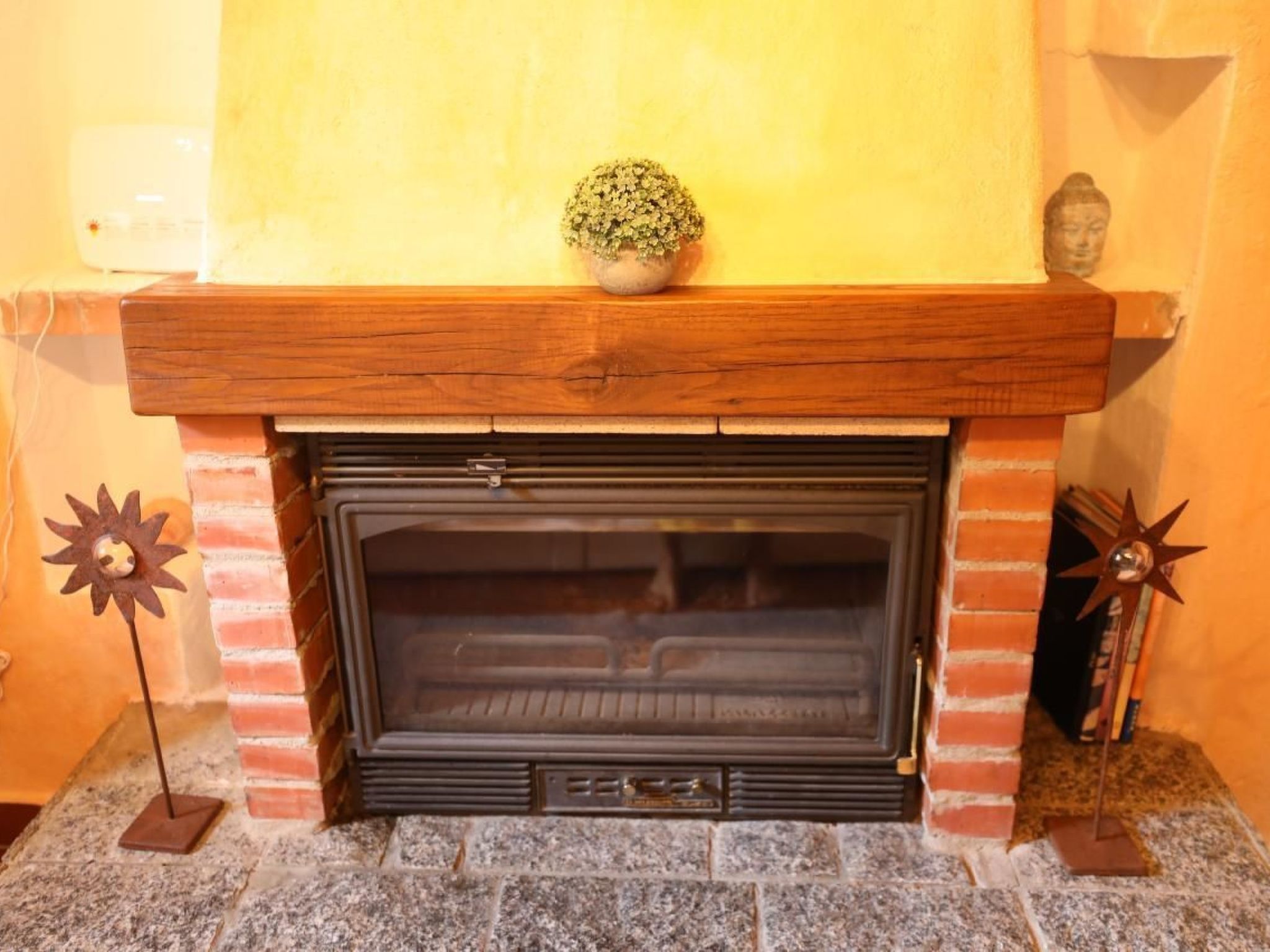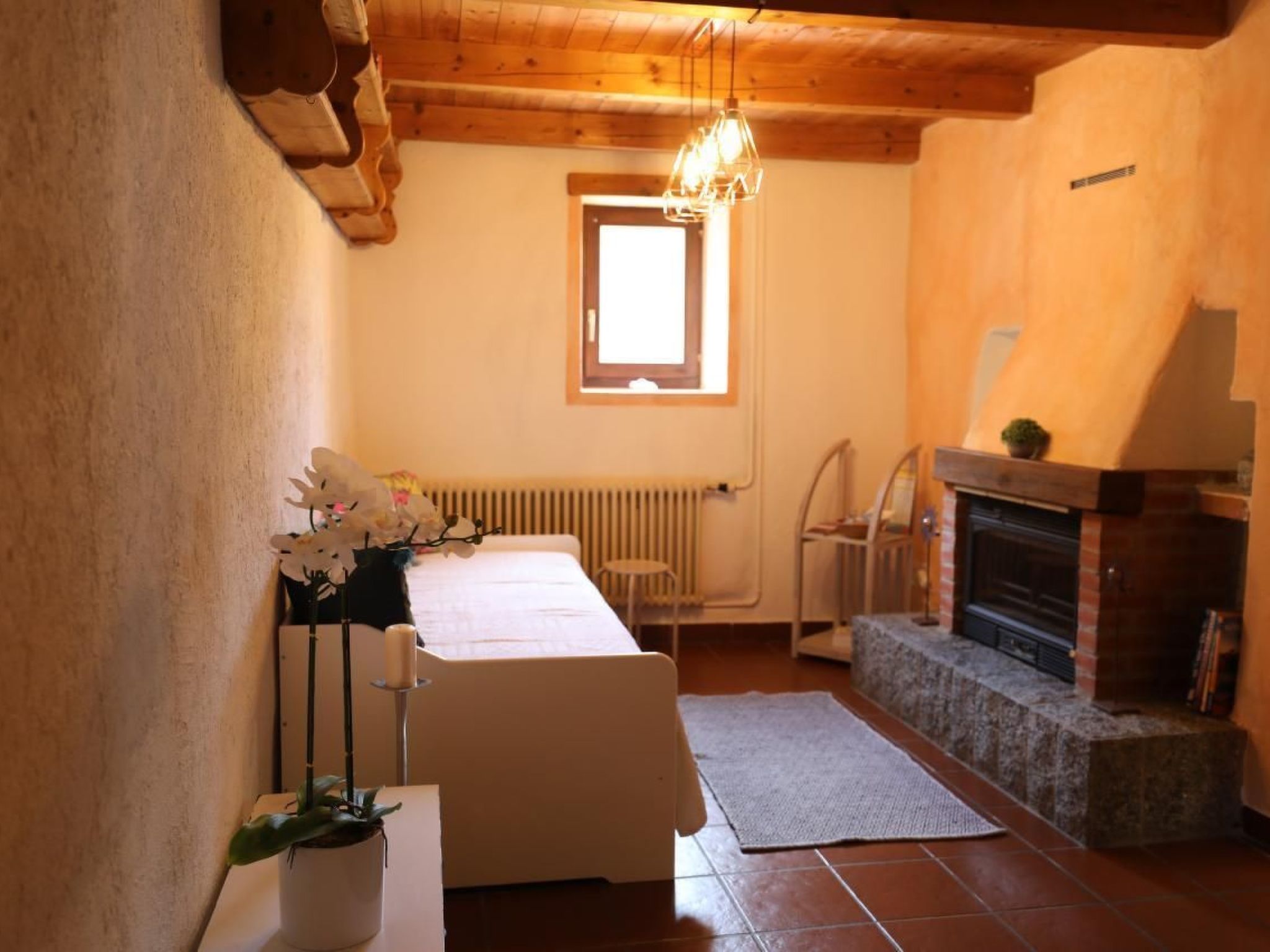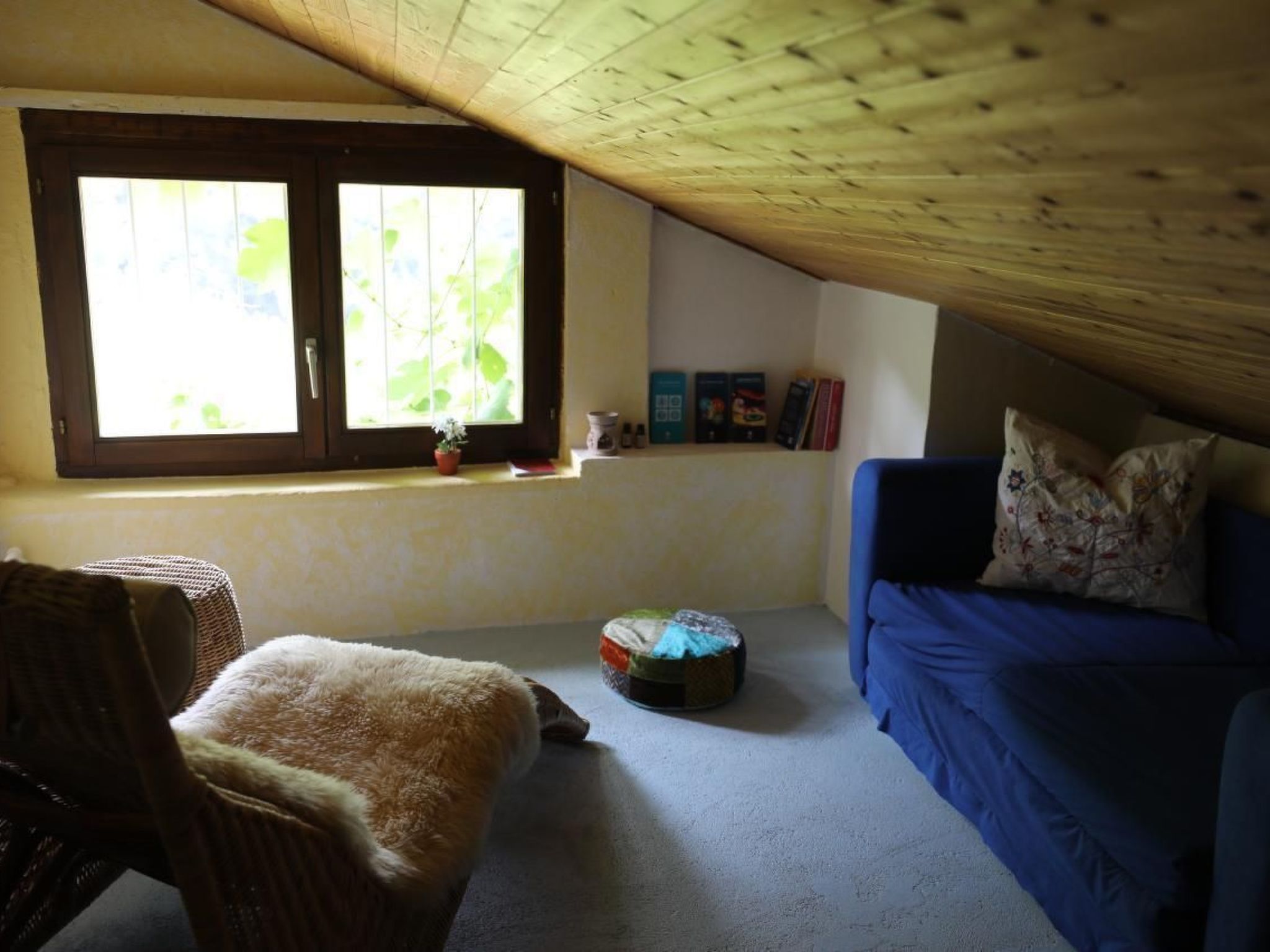 Im Inneren erwartet Sie eine exklusive Gestaltung, die bis zu 4 Gästen Komfort bietet. Eine steile Steintreppe führt Sie in den ersten Stock zum gemütlichen Wohnzimmer mit einem offenen Cheminée, angrenzend an eine voll ausgestattete Küche. Ein Badezimmer befindet sich ebenfalls auf dieser Ebene. Eine weitere Treppe bringt Sie zum geräumigen Schlafzimmer im zweiten Stock, zusammen mit einem kleinen Raum, ideal zum Lesen oder Meditieren, ausgestattet mit zwei Einzelbetten und einer kleinen Bibliothek.