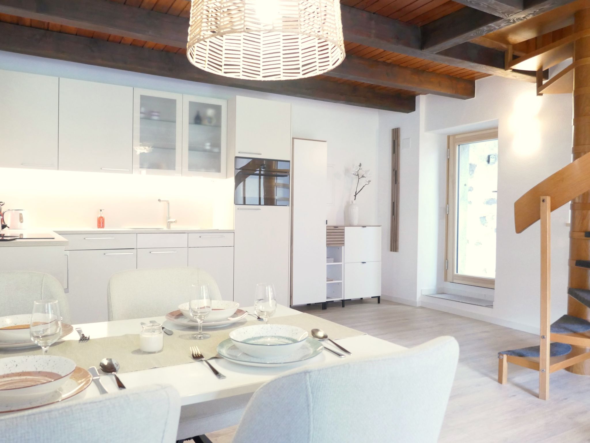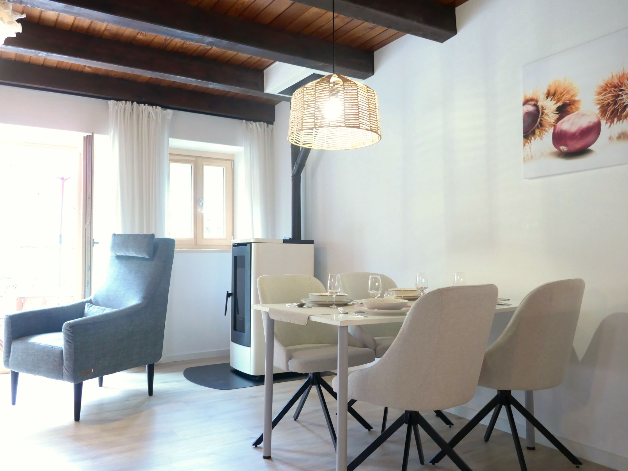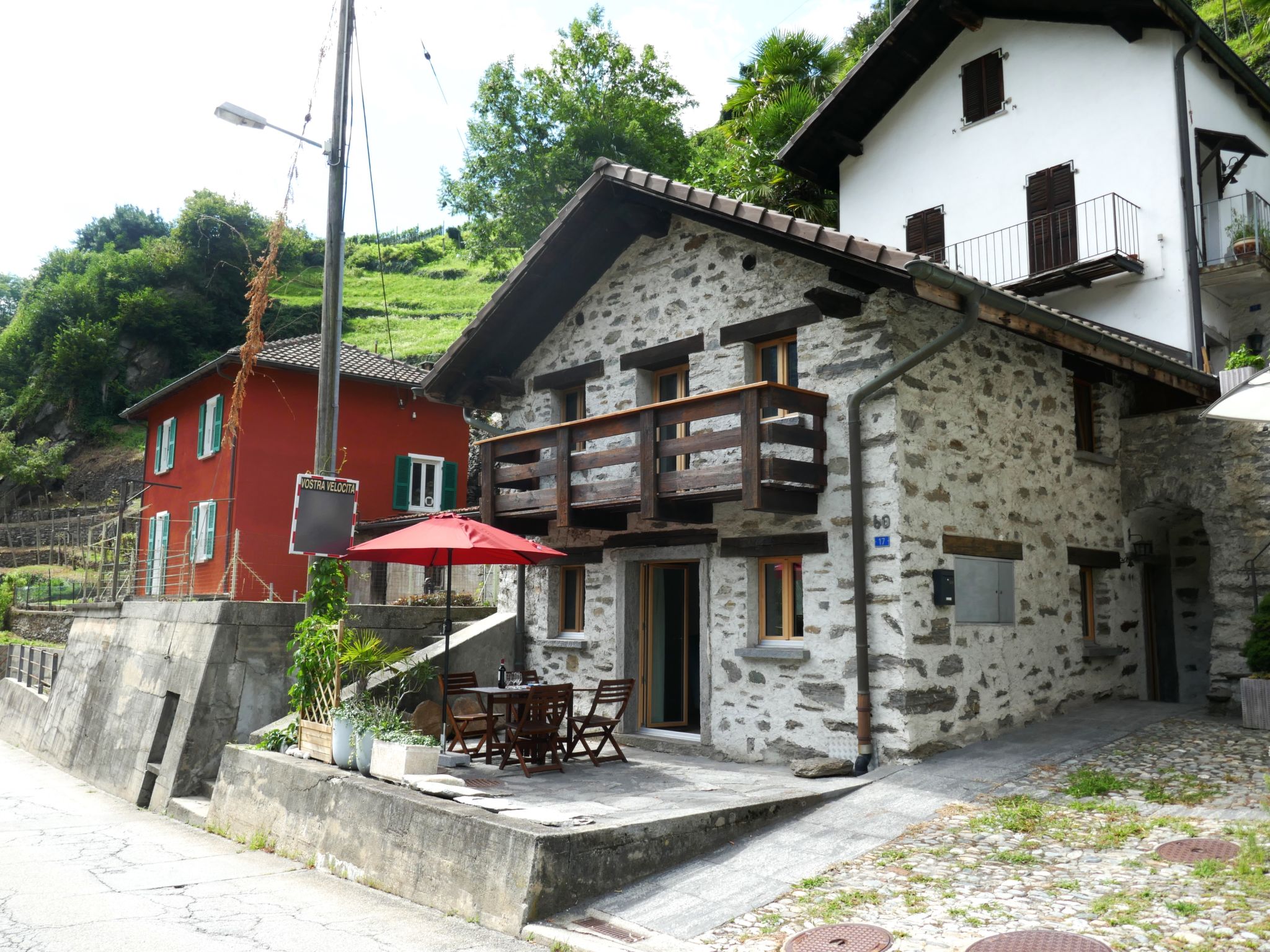 "Rustico Emilio", 3-Zimmer-Haus 64 m2. Objekt geeignet für 2 Erwachsene + 2 Kinder. Teilweise renoviert im Jahre 2025, schön und gemütlich eingerichtet: offenes Wohn-/Esszimmer mit Esstisch, Radio und Heizofen. Ausgang zur Terrasse. Grosse, offene Küche (Backofen, Geschirrspüler, 4 Induktionskochplatten, Wasserkocher, elektrische Kaffeemaschine, Kapseln für die Kaffeemaschine (Nespresso) extra, Fondue Set (Käse)). Obergeschoss: (Wendeltreppe) 1 Doppelzimmer, Deckenhöhe 240 - 400 cm mit 1 Doppelbett (1 x 160 cm, Länge 200 cm). Ausgang zum Balkon, Richtung Süden und Richtung Westen. (Wendeltreppe) 1 Zimmer mit 1 x 2 Etagenbetten (90 cm, Länge 190 cm). Dusche/WC. Holzheizung. Balkon, Terrasse 16 m2. Terrassenmöbel. Schöne Sicht auf die Berge, die Landschaft und die Ortschaft. Zur Verfügung: Waschmaschine, Bügeleisen, Fliegengitter, Kinderhochstuhl, Babybett bis 2 Jahre (extra), Haartrockner. Internet (WLAN, gratis). Bitte beachten: geeignet für Familien. Nichtraucher-Haus.