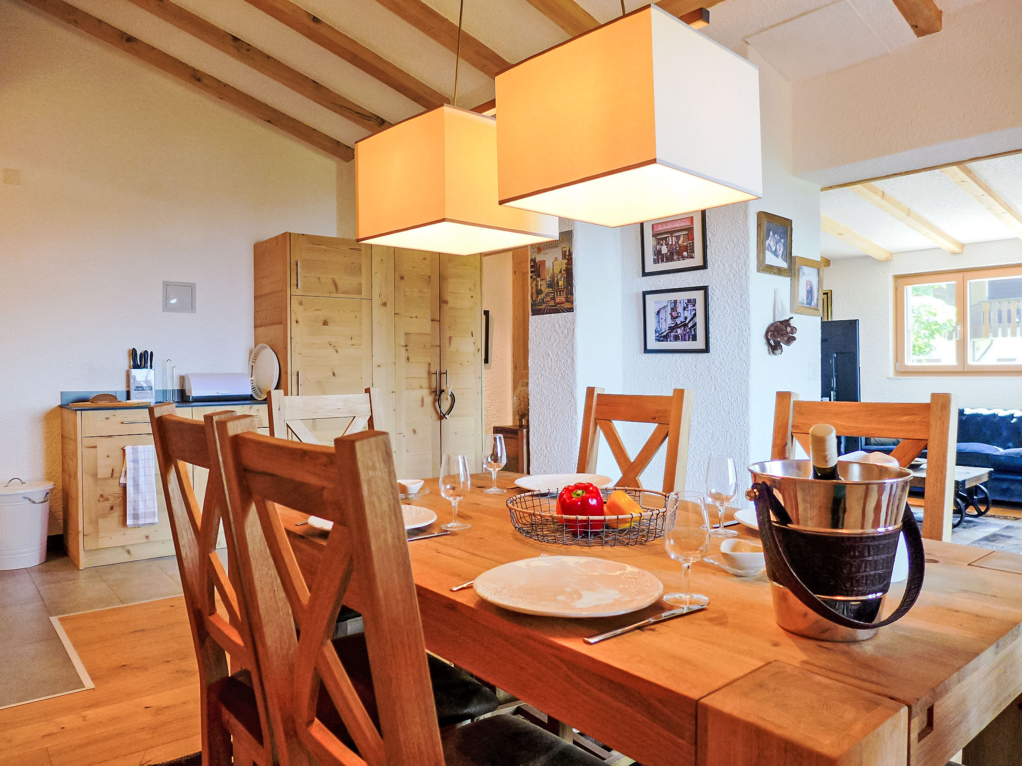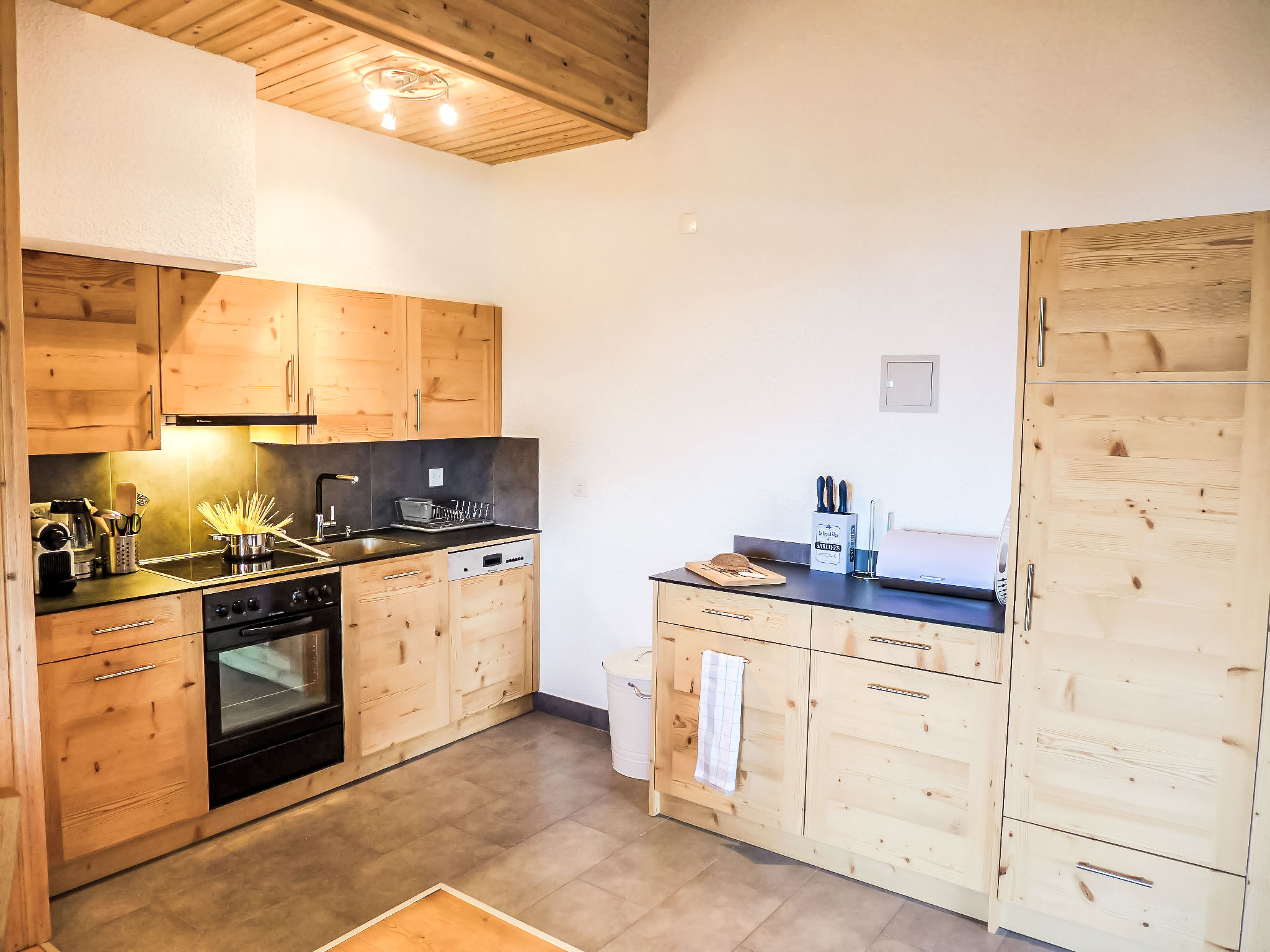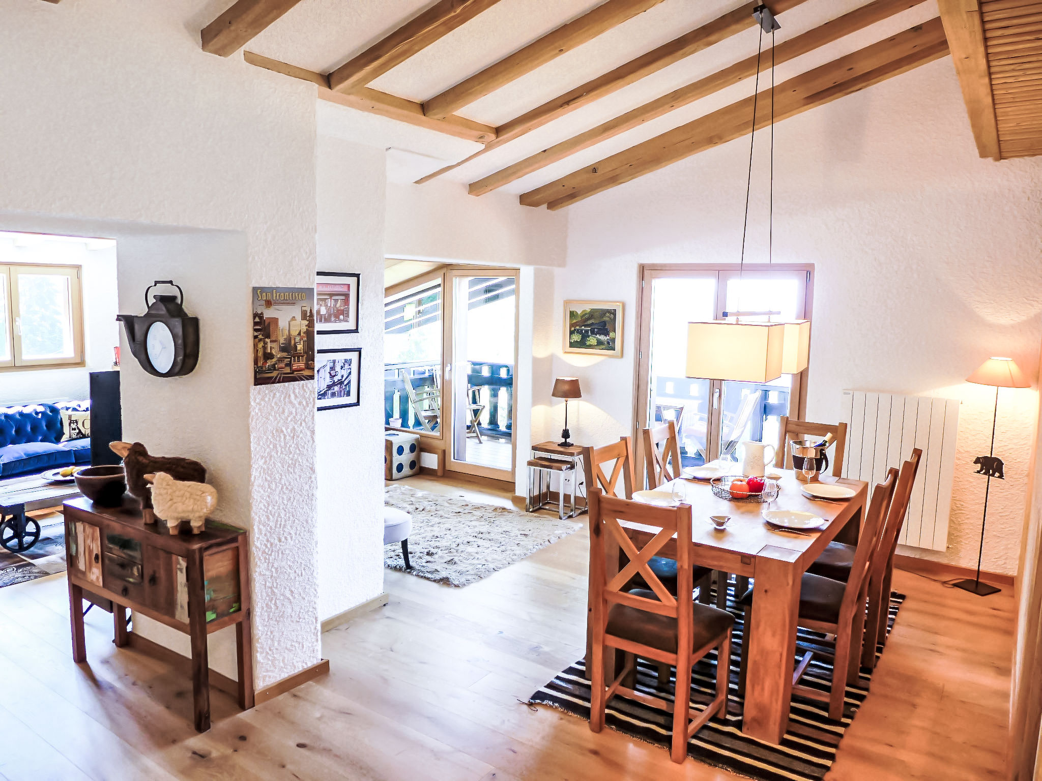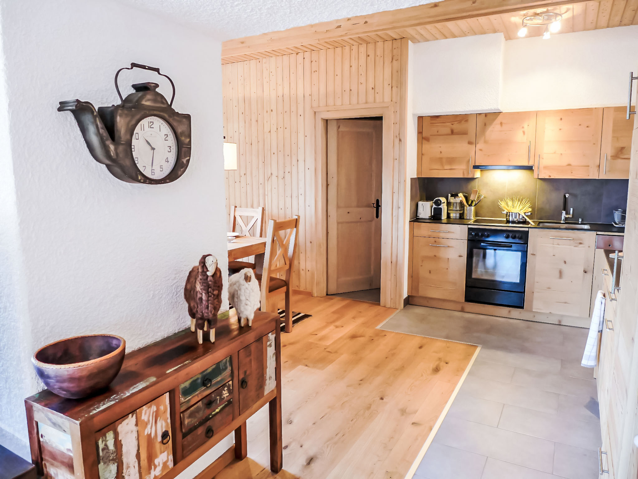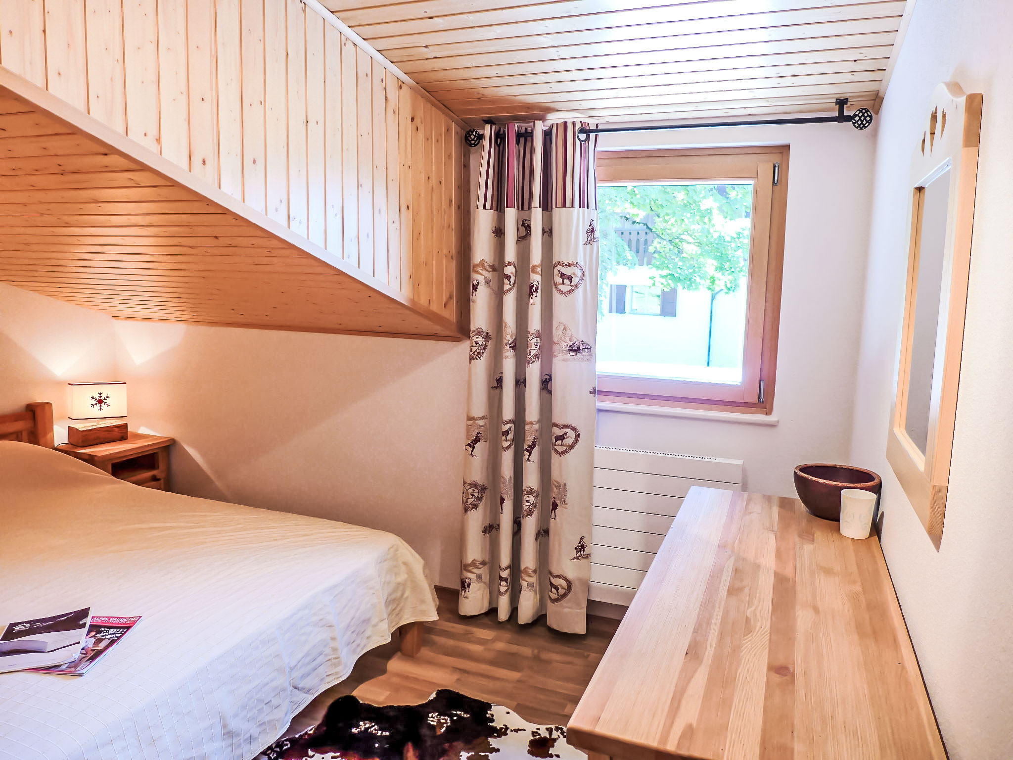 "Regina B9", 3-Zimmer-Attikawohnung 80 m2 im 2. Stock, Südlage. Geräumig, abgeschrägt, vollständig renoviert im Jahre 2017, schön und geschmackvoll eingerichtet: abgeschrägtes grosses Wohn-/Esszimmer, Deckenhöhe 200 - 400 cm mit offenem Kamin, Esstisch und TV. Ausgang zum Balkon, Richtung Süden. 1 Doppelzimmer, Deckenhöhe 130 - 200 cm mit 1 franz. Bett (1 x 180 cm, Länge 200 cm). 1 Zimmer mit 1 x 2 Etagenbetten (90 cm, Länge 200 cm). Offene Küche (Backofen, Geschirrspüler, 4 Glaskeramikplatten, Toaster, Wasserkocher, Mikrowelle, elektrische Kaffeemaschine, Kapseln für die Kaffeemaschine (nespresso) extra, Racletteofen, Fondue Set (Käse)). Bad/WC, Dusche/WC. Balkon 10 m2, Südlage. Balkonmöbel. Schöne Panoramasicht auf die Berge und das Tal. Zur Verfügung: Waschmaschine, Wäschetrockner, Haartrockner. Internet (Wireless LAN). Parkplatz, Garage Nr. b9. Bitte beachten: Nichtraucher-Unterkunft.