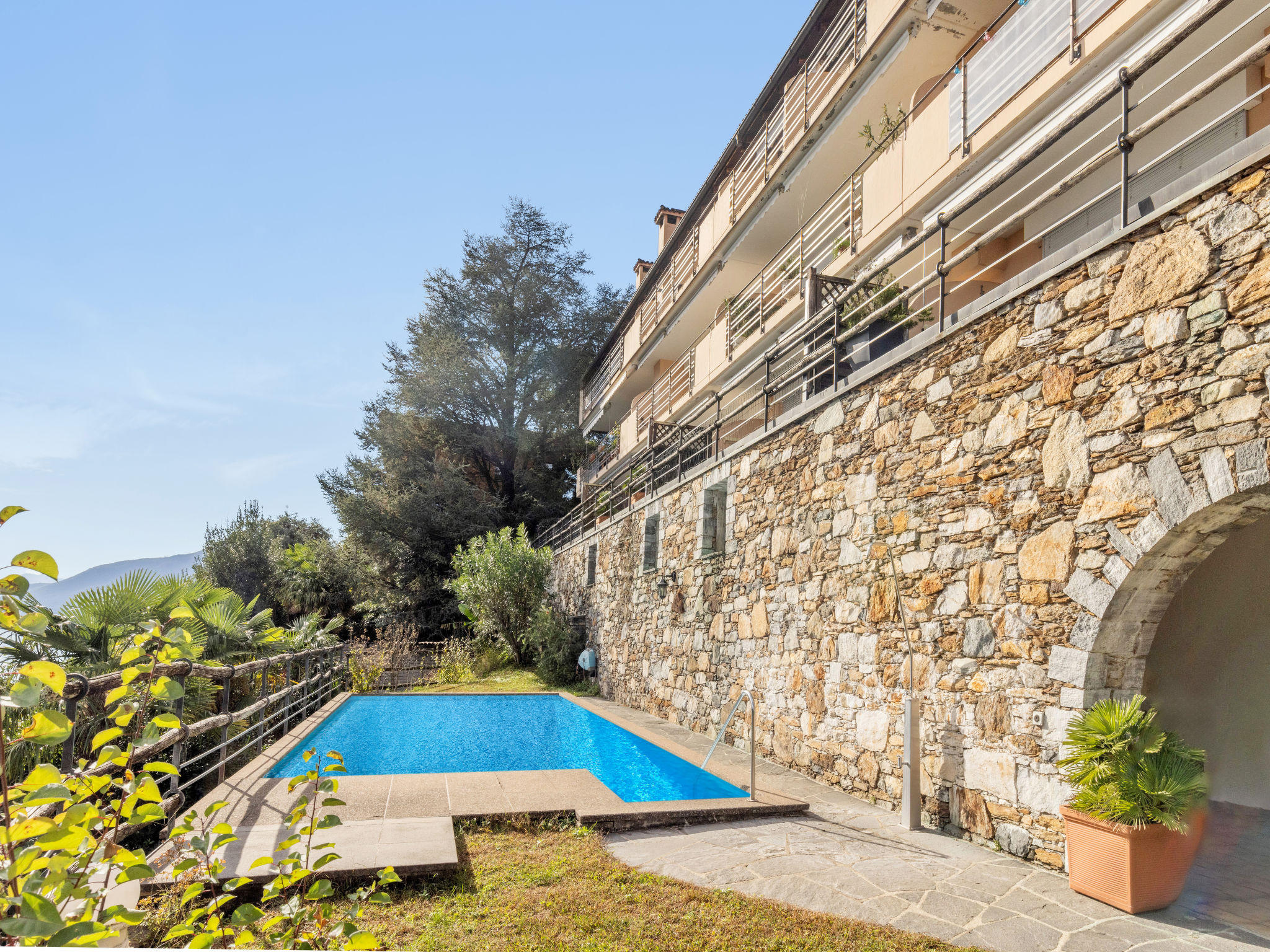 Brissago 10 km von Locarno und Ascona: Schönes Appartementhaus "Calebris", auf 4 Stockwerken. Am Ortsrand, 500 m vom Zentrum von Brissago, ruhige, sonnige Lage am Hang, 600 m vom See, in einer Sackgasse. Zur Mitbenutzung: Grundstück, Schwimmbad eckig (4 x 9 m, 110 - 135 cm tief, saisonale Verfügbarkeit: 01.Jun. - 15.Okt.) mit Innentreppe. 20 m lange schmale Zufahrt bis zum Haus. Lebensmittelgeschäft 500 m, Supermarkt 8 km, Restaurant 50 m, Bäckerei 550 m, Zentrum zu Fuss in 10 Minuten erreichbar, Bushaltestelle "Brissago Nevedone" 120 m, Bahnstation "Locarno" 10.5 km, Fähre "Brissago NLM" 850 m, Freibad 1.5 km, Hallenbad 11 km, See Lago Maggiore. Sporthafen 600 m, Golfplatz (18 Loch) 10 km, Tennis 500 m, Minigolf 10 km.