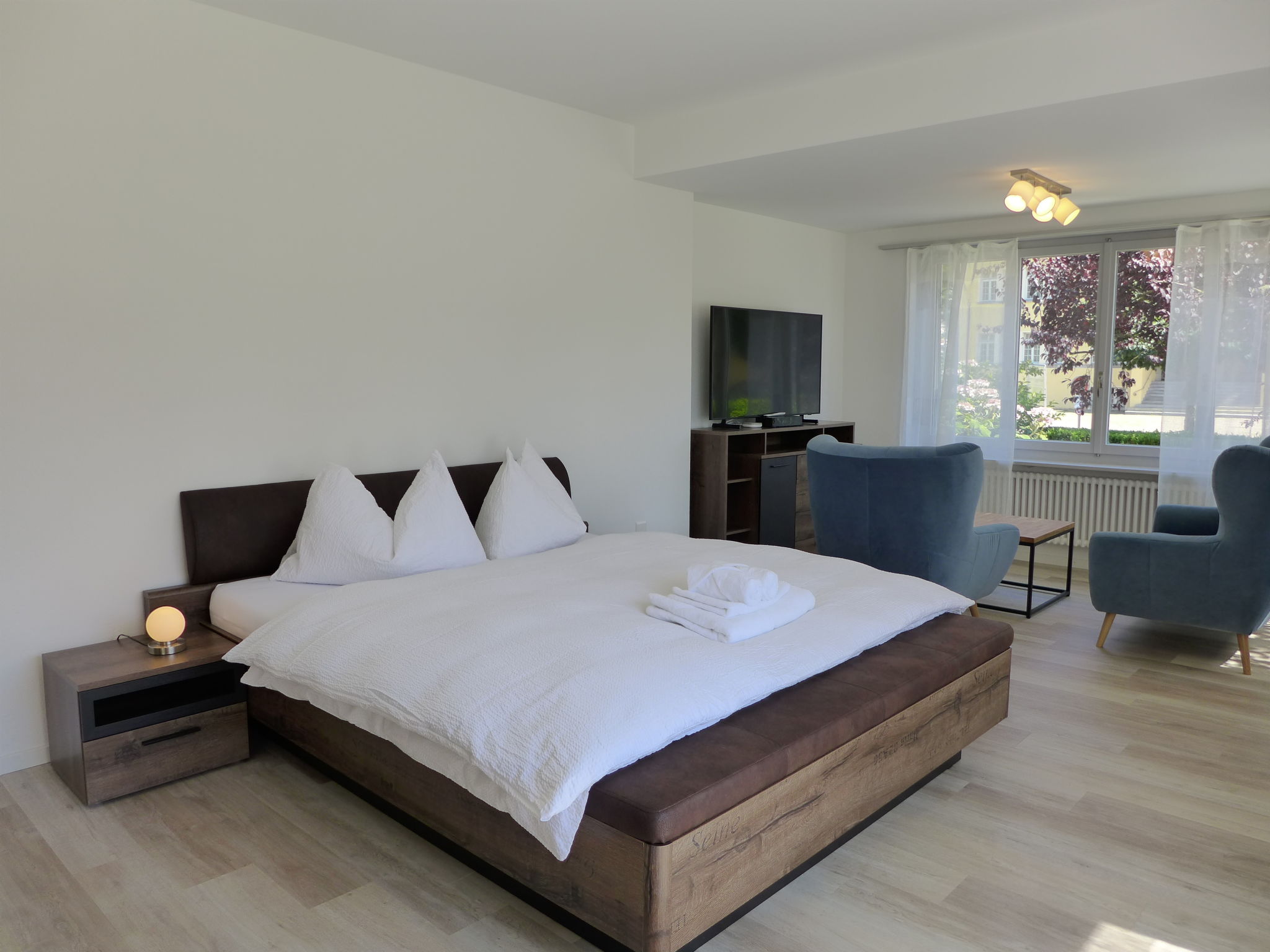 "Henry's 100", 4-Zimmer-Wohnung 100 m2, im erhöhten Erdgeschoss. Geräumig und hell, vollständig renoviert im Jahre 2022, sehr komfortabel und modern eingerichtet: grosses Wohn-/Schlafzimmer mit 1 Doppelbett (180 cm, Länge 200 cm), Kabel-TV. 1 Zimmer mit 1 Doppelbett (160 cm, Länge 200 cm), Kabel-TV. 2 Zimmer, jedes Zimmer mit 1 Bett (120 cm, Länge 200 cm), Kabel-TV. Wohnküche (Geschirrspüler, 4 Induktionskochplatten, Toaster, Wasserkocher, Mikrowelle, elektrische Kaffeemaschine, Kapseln für die Kaffeemaschine (Dolce Gusto) extra) mit Esstisch. Ausgang zum Garten. 2 Duschen/WC. Parkettboden. Eingeschränkte Sicht auf die Berge und die Ortschaft. Zur Verfügung: Haartrockner. Internet (Wireless LAN, gratis). Parkplatz (1 Auto). Bitte beachten: Nichtraucher-Haus. Feuerlöscher.