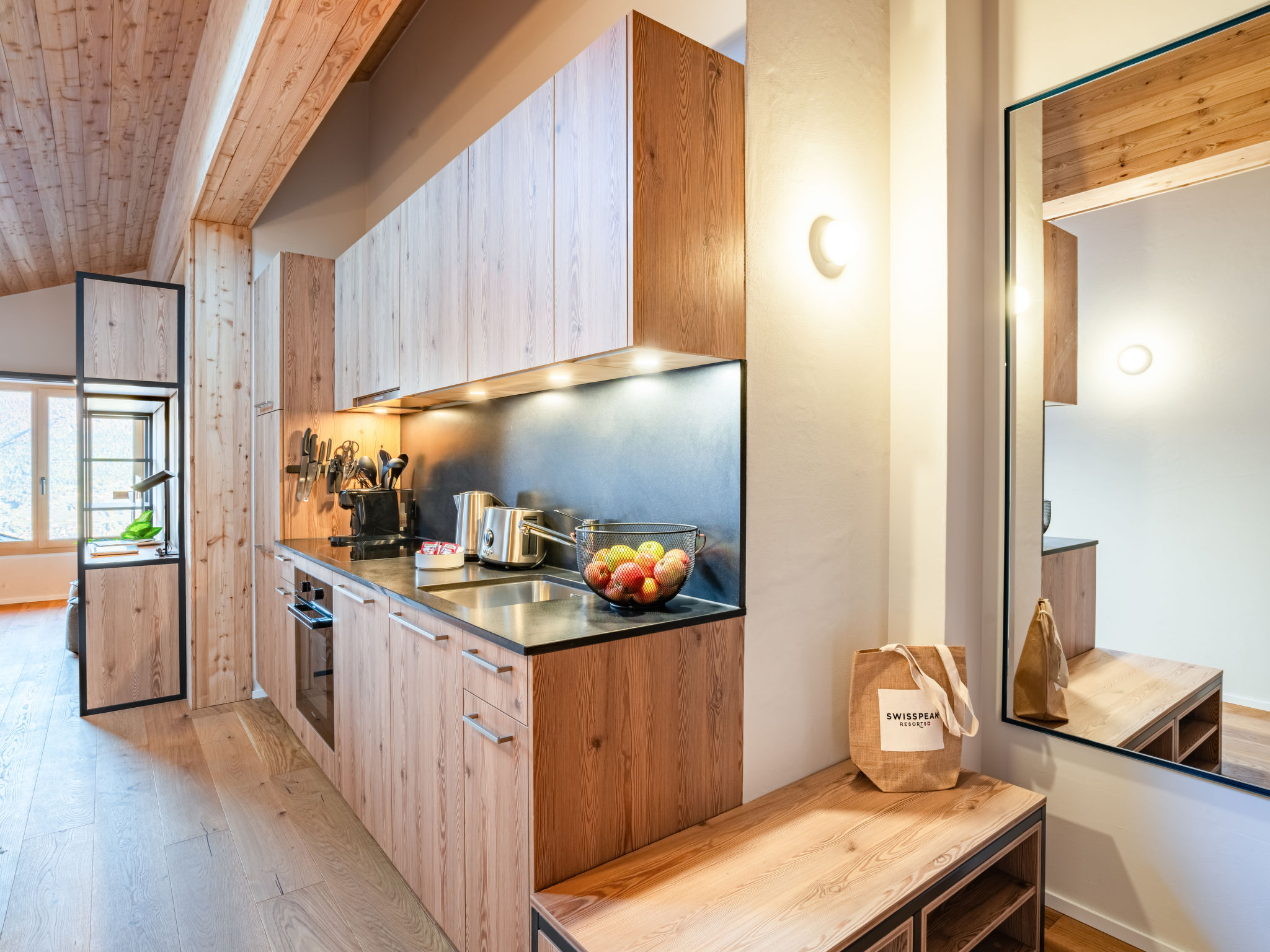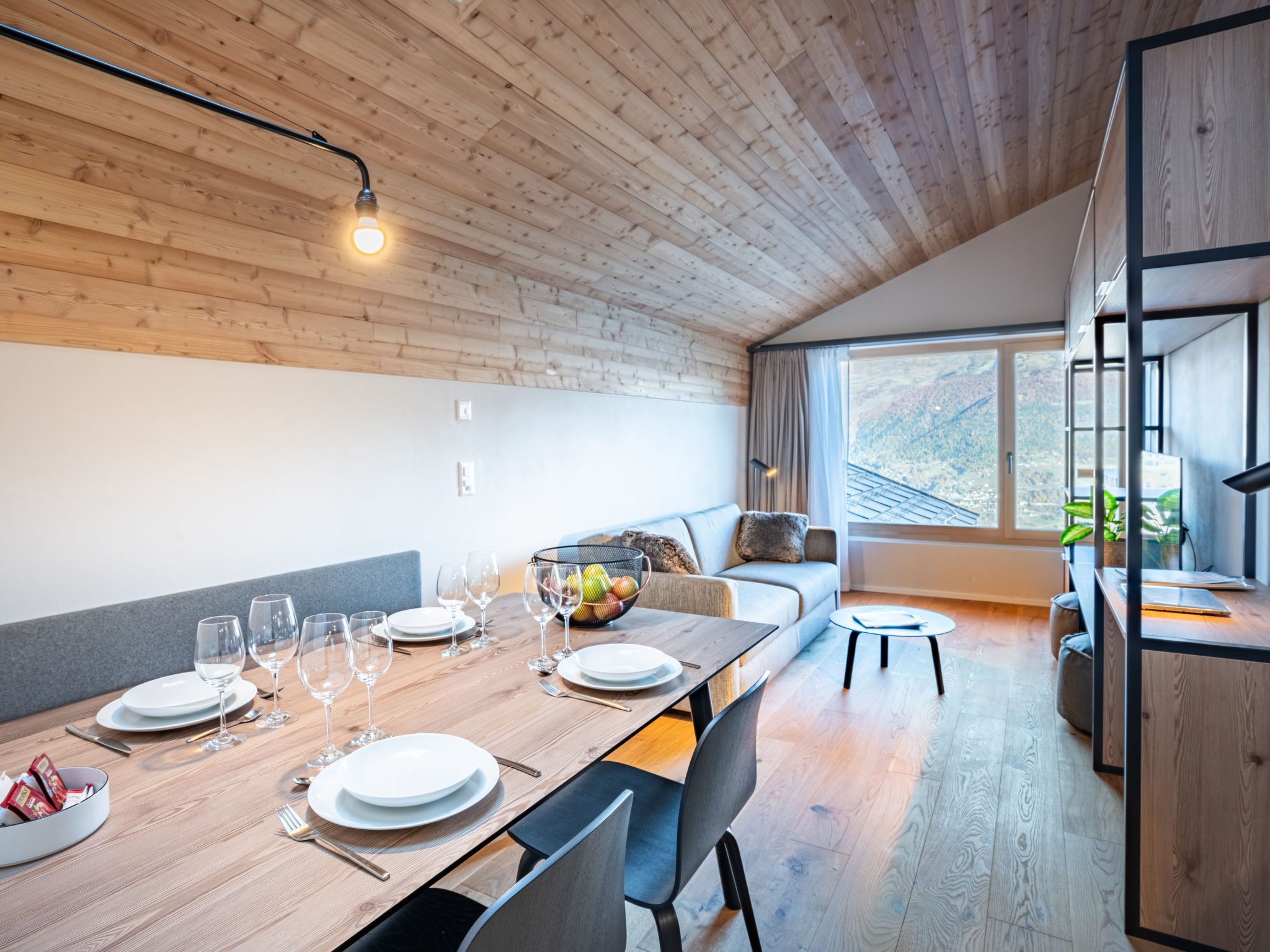 "2 room apartment STANDARD", 2-Zimmer-Wohnung 43 bis 57 m2. Komfortabel und modern eingerichtet: Wohn-/Esszimmer mit 1 Doppeldiwanbett (160 cm), TV und Internationale TV-Sender (Flachbildschirm). 1 Zimmer mit 1 Doppelbett (2 x 90 cm). Offene Küche (Backofen, Geschirrspüler, 4 Glaskeramikplatten, elektrische Kaffeemaschine, Kapseln für die Kaffeemaschine (Malongo), Racletteofen, Fondue Set (Chinoise, Käse)). Dusche/WC. Balkon, Terrasse. Sehr schöne Panoramasicht auf die Berge. Zur Verfügung: Internet (WLAN, gratis). Bitte beachten: Nichtraucher-Haus. Maximal 1 Haustier/Hund erlaubt. Beim Mietobjekt handelt es sich um ein Typenhaus bzw. Um eine Typenwohnung.