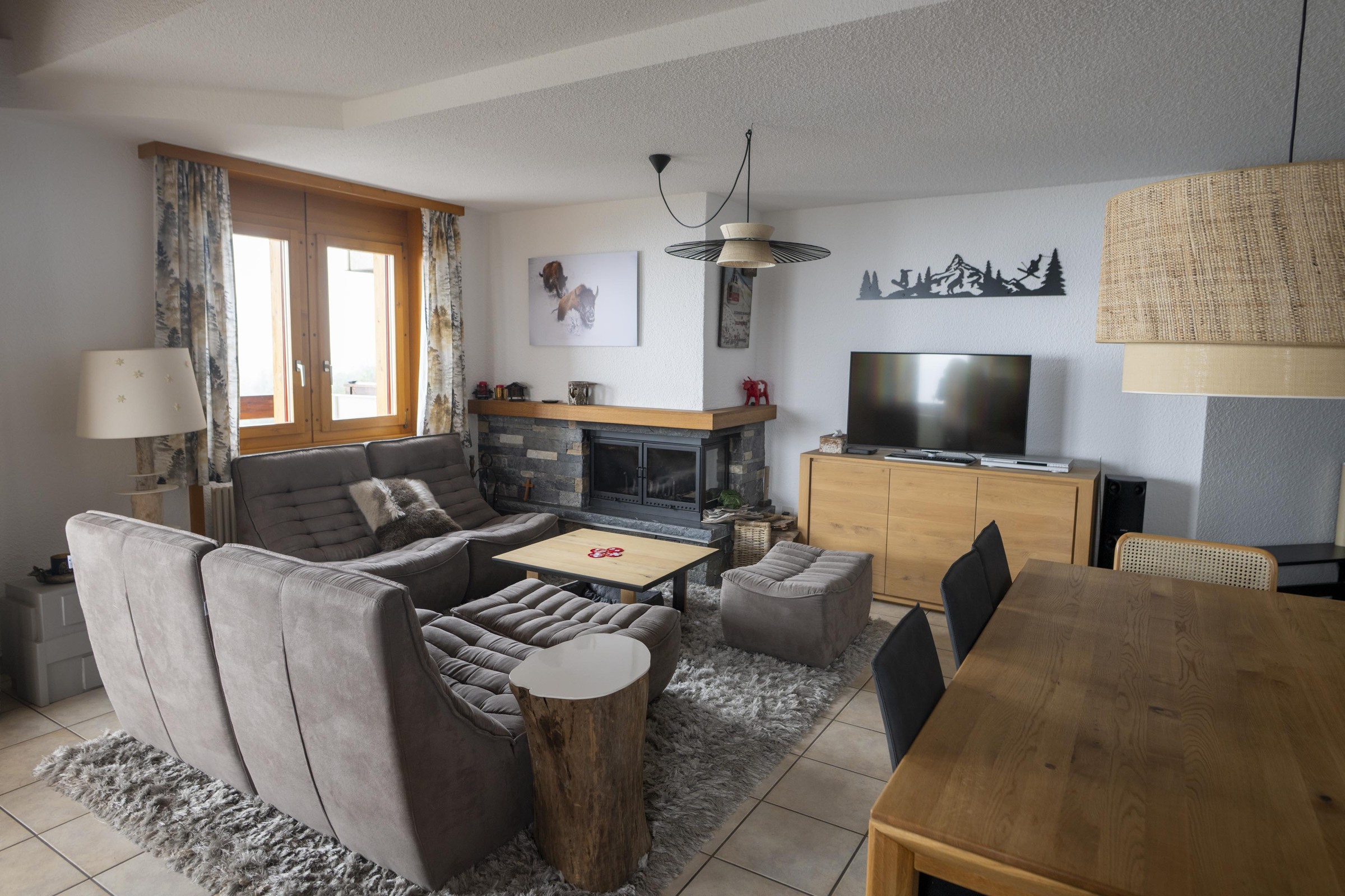 Wunderschöne, kürzlich geschmackvoll renovierte Maisonette-Wohnung im Bergchalet-Stil in einer angenehmen, sehr ruhigen Wohnanlage in idealer Lage im Zentrum von Anzère. Diese Wohnung verbindet Bergcharme mit modernem Komfort. Dieser gemütliche Raum erstreckt sich über zwei Etagen und ist mit sichtbaren Balken im Wohnbereich und in den 3 Schlafzimmern ausgestattet. Das Wohnzimmer verbindet einen großen Wohn- und Essbereich, der durch große Fensterfronten lichtdurchflutet ist. Es verfügt über einen offenen Kamin für lange Winterabende. Die moderne, neue und perfekt ausgestattete Küche rundet diesen gemütlichen Raum ab.Die Wohnung verfügt über vier Schlafzimmer mit Fenstern: eines mit einem Doppelbett und drei mit zwei Einzelbetten (die leicht zusammengestellt werden können), sodass Familien und Freunde in geselliger Atmosphäre untergebracht werden können (ein Klappbett für Kinder ist verfügbar). Drei Schlafzimmer sind mit Verdunkelungsrollos ausgestattet, eines mit einer Verdunkelungsjalousie. Alle bieten dank ihrer bodentiefen Fenster eine atemberaubende Aussicht. Für Ihren Komfort stehen Ihnen außerdem drei ausgestattete Badezimmer zur Verfügung, eines mit Badewanne und zwei mit Dusche. Eine große, vollständig überdachte Terrasse in Südostlage bietet einen atemberaubenden 240°-Panoramablick auf das Rhonetal und die Alpen und ist ideal, um die Sonne und die Alpenlandschaft zu genießen. Abgerundet wird diese außergewöhnliche Immobilie durch eine geschlossene Garage, einen Skiraum und einen Aufzug.
