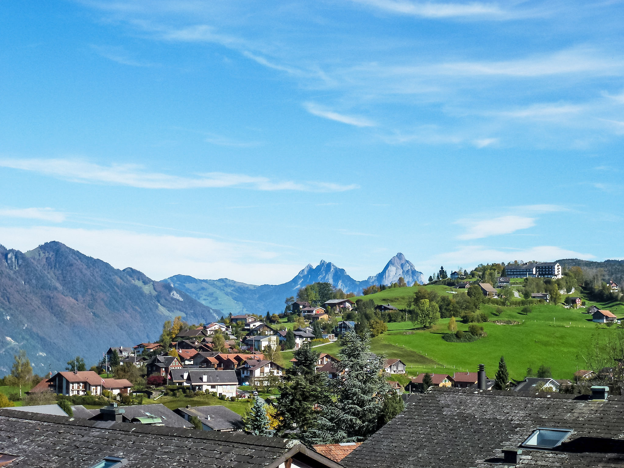 "Flodana", 3-Zimmer-Wohnung 58 m2 im 1. Stock, Südlage. Schön und geschmackvoll eingerichtet: offenes grosses Wohn-/Esszimmer mit 1 Diwanbett, Schwedenofen, Esstisch, Essecke und Kabel-TV (Flachbildschirm). Ausgang zum Balkon. 1 abgeschrägtes Doppelzimmer mit 1 franz. Bett (160 cm, Länge 200 cm). 1 abgeschrägtes Kinderzimmer mit 2 Betten (90 cm, Länge 200 cm). Offene Küche (Backofen, Geschirrspüler, 4 Glaskeramikplatten, Mikrowelle, Grill, elektrische Kaffeemaschine, Racletteofen, Fondue Set (Käse)). Ausgang zum Balkon. Bad/WC. 2 Balkone. Terrassenmöbel, Liegestühle (2), Sitzplatz. Herrliche Panoramasicht auf den See, die Berge, das Tal, die Landschaft und auf den Vierwaldstättersee. Zur Verfügung: Bügeleisen, Kinderhochstuhl, Babybett bis 2 Jahre (extra), Haartrockner. Internet (Wireless LAN, gratis). Parkplatz (1 Auto) beim Haus. Bitte beachten: Nichtraucher-Unterkunft.
