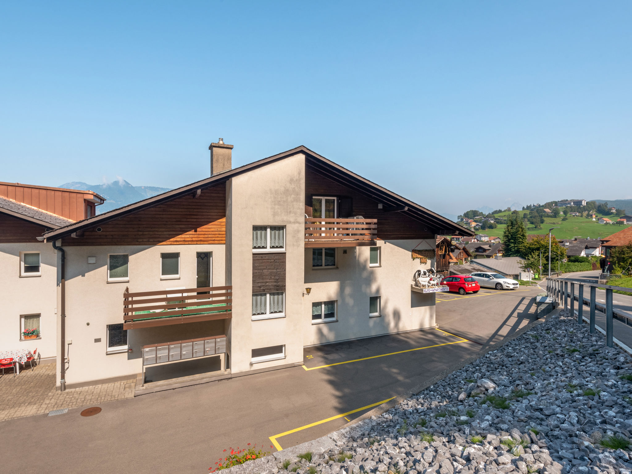 Emmetten 28 km von Luzern: Modernes, schönes, komfortables Mehrfamilienhaus "ELFE Apartments", 780 m.ü.M., auf 3 Stockwerken, umgeben von Bäumen. 3 Häuser in der Residenz. Oberhalb von Beckenried, am Ortsrand, 400 m vom Zentrum von Emmetten, im Bezirk Vierwaldstättersee, ruhige, erhöhte Lage, exzellente Lage: Absolut zentral und dennoch ruhig, 6 km vom See, 300 m vom Skigebiet, im Grünen. Zur Mitbenutzung: Grundstück. Im Hause: Einstellraum für Fahrräder, Skiraum, Zentralheizung, Waschmaschine (zur Mitbenutzung, extra), Trockenraum. Zufahrt bis zum Haus. Im Winter 4x4 empfohlen. Parkplatz (beschränkte Anzahl) beim Haus, im Winter 30 m Gemeinschaftsgarage (extra) beim Haus. Einkaufsgeschäft 500 m, Lebensmittelgeschäft, Restaurant 300 m, Bäckerei 500 m, Bushaltestelle 500 m, Bahnstation "Stans SBB" 12 km, Freibad 6 km, See Vierwaldstätersee 6 km. Minigolf 6 km, Wanderwege ab Haus 1 m, Bergeisenbahn 300 m. Nahe gelegene Sehenswürdigkeiten: Rigi, Pilatus, Stanserhorn (Cabriobahn), Bürgerstock, Niederbauen, Glasi, Hergiswil, Bike-Arena, Emmetten, Tritt - Hütte 1600 m.ü.M. Bekannte Skigebiete sind gut erreichbar: Stockhütte 7 km, Klewenalp 19 km, Seelisberg 8 km. Bekannte Seen in der Umgebung sind gut erreichbar: Vierwaldstättersee 4 km, Urnersee, Seelisbergsee. Wandergebiete: Route 1 Klewenalp-Stockhütte ca. 2h, Route 2 Panoramarundwanderweg ca. 1,5h, Route 6 Klewenalp-Gitschenen ca. 3,5h. Bitte beachten: Fahrzeug empfohlen. Geeignet für Familien, geeignet für Senioren. Bei guter Schneelage Zufahrt mit den Skiern bis zum Haus. Autobahn 5 km vom Haus. Das Foto ist nur ein Hausbeispiel. Weitere Unterkünfte sind buchbar. Ferienwohnung Ref. CH6376.400 befindet sich auf dem gleichen Grundstück.