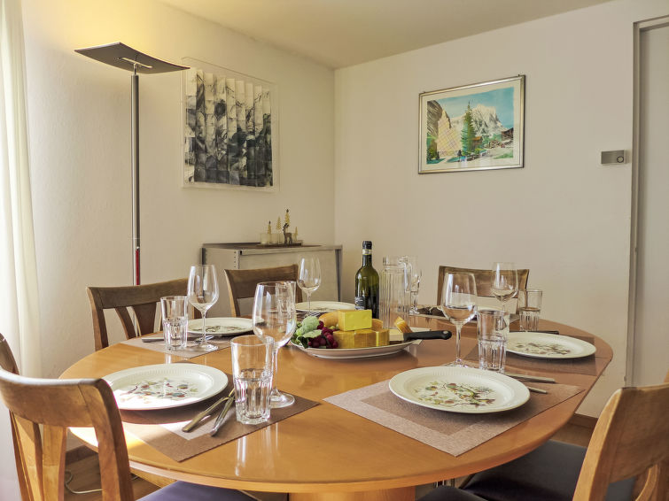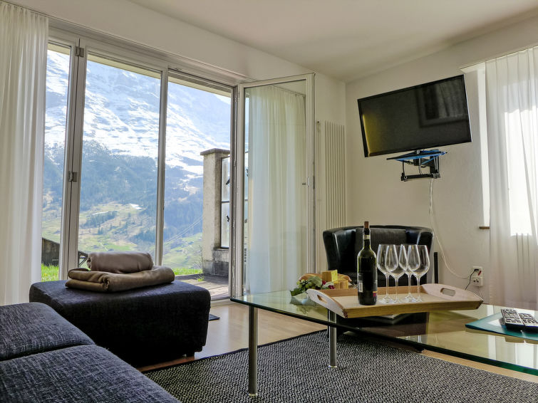 4-Zimmer-Wohnung 86 m2, im Erdgeschoss, Südlage. Zweckmässig und gemütlich eingerichtet: Wohn-/Esszimmer 28 m2 mit Sat-TV (Flachbildschirm), Radio und CD. Ausgang zur Terrasse. 2 Zimmer, jedes Zimmer mit 2 Betten (90 cm, Länge 200 cm). 1 Zimmer mit 1 Ausziehbett (2 Pers. 2 x 90 cm, Länge 200 cm). Wohnküche (Backofen, Geschirrspüler, 4 Glaskeramikplatten, Toaster, Wasserkocher, elektrische Kaffeemaschine, Kapseln für die Kaffeemaschine (Dolce Gusto) extra, Racletteofen, Fondue Set (Käse)). Bad/WC. Grosse Terrasse, Südlage. Terrassenmöbel. Herrliche Sicht auf die Berge, das Tal und Eigernordwand. Zur Verfügung: Haartrockner. Internet (Wireless LAN, gratis). Parkplatz beim Haus. Bitte beachten: Nichtraucher-Unterkunft. Feuerlöscher.