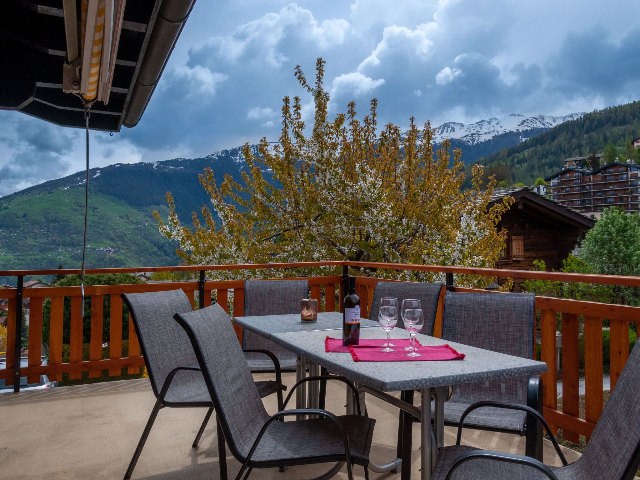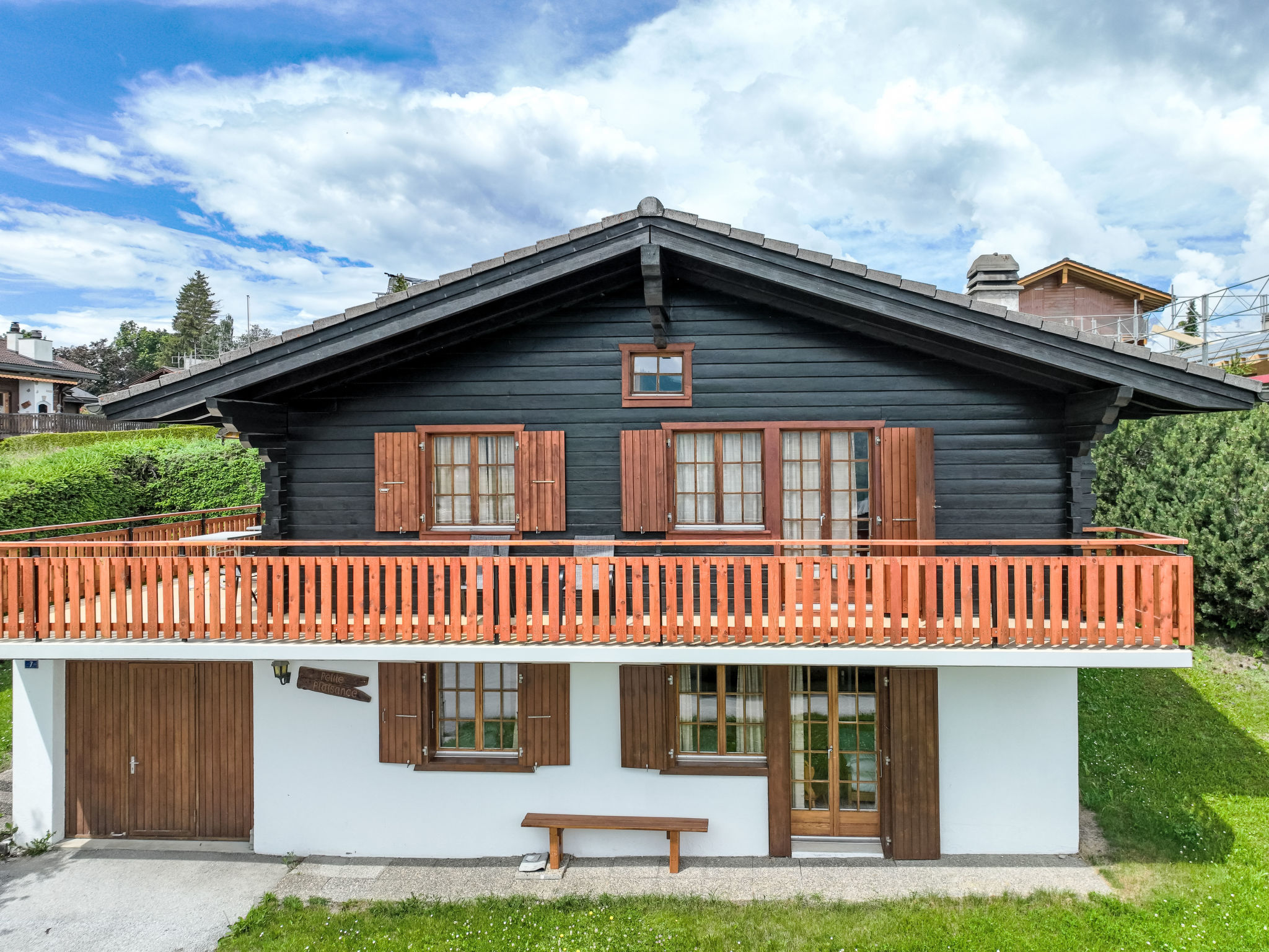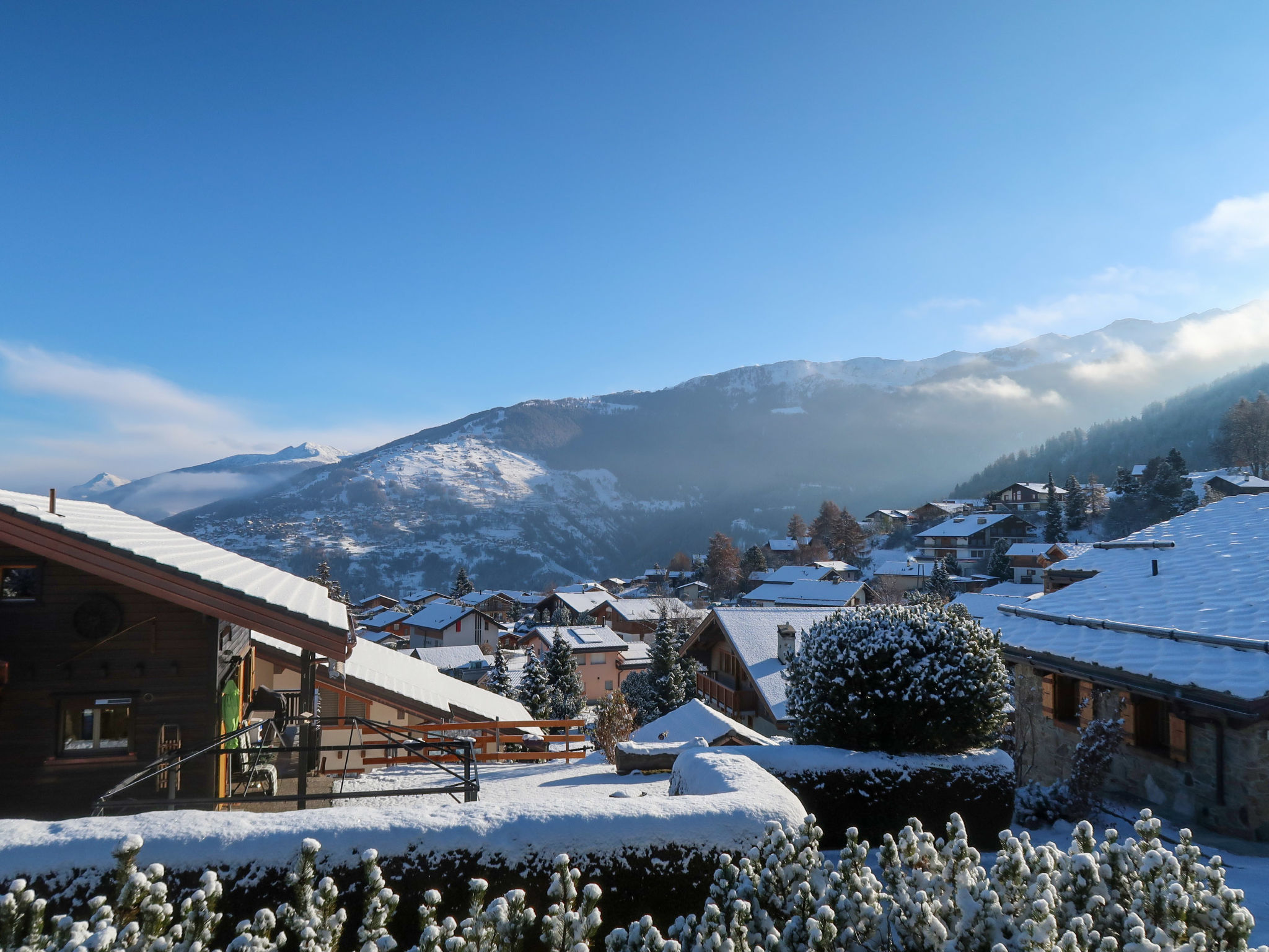 "Petite Plaisance", 4-Zimmer-Chalet 95 m2. Zweckmässig und schön eingerichtet: Eingang. Wohn-/Esszimmer mit offenem Kamin und Kabel-TV. Ausgang zur Terrasse. Offene Küche (Backofen, Geschirrspüler, 4 Induktionskochplatten, Toaster, Wasserkocher, Mikrowelle, elektrische Kaffeemaschine, Kapseln für die Kaffeemaschine (nespresso) extra, Racletteofen, Fondue Set (Käse)). Sep. WC. E-Heizung. Unteres Geschoss: 1 Zimmer mit 2 Betten (90 cm, Länge 200 cm). 1 Zimmer mit 2 Betten (90 cm, Länge 200 cm), Bad/WC und Doppelwaschbecken. Ausgang zum Gartensitzplatz. 1 Zimmer mit 2 Betten (90 cm, Länge 200 cm). Sitzbad, sep. WC. Dachgeschoss: abgeschrägte, offene Galerie, Deckenhöhe 80 - 120 cm. Balkon, Ostlage, grosse Terrasse, Südlage und Ostlage, Garten, Westlage. Terrassenmöbel, Gartengrill. Sehr schöne Sicht auf die Berge und das Tal. Zur Verfügung: Waschmaschine, Wäschetrockner, Kinderhochstuhl, Babybett. Internet (WLAN). Parkplatz, Garage, Höhe 190 cm, Breite 230 cm. Bitte beachten: Nichtraucher-Unterkunft. Maximal 1 Haustier/Hund erlaubt.