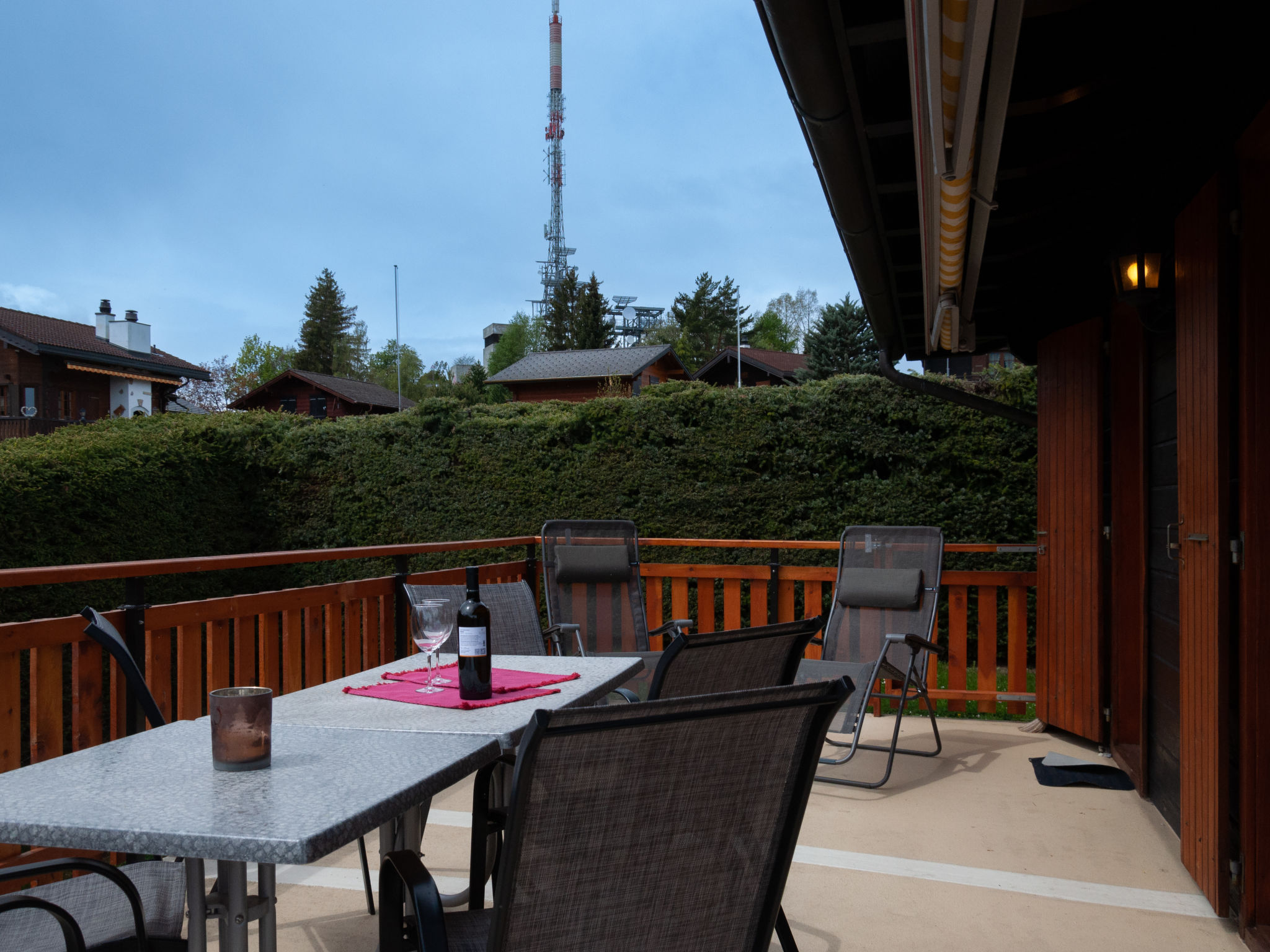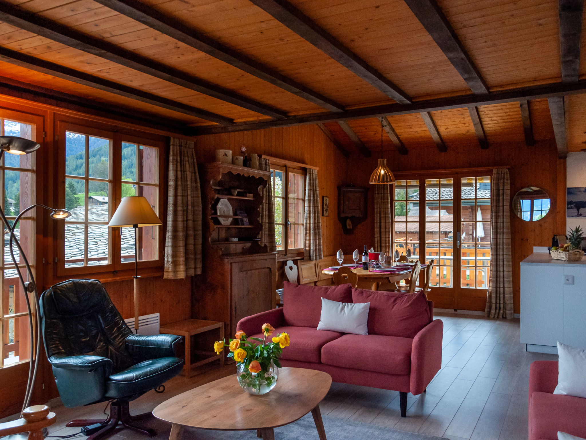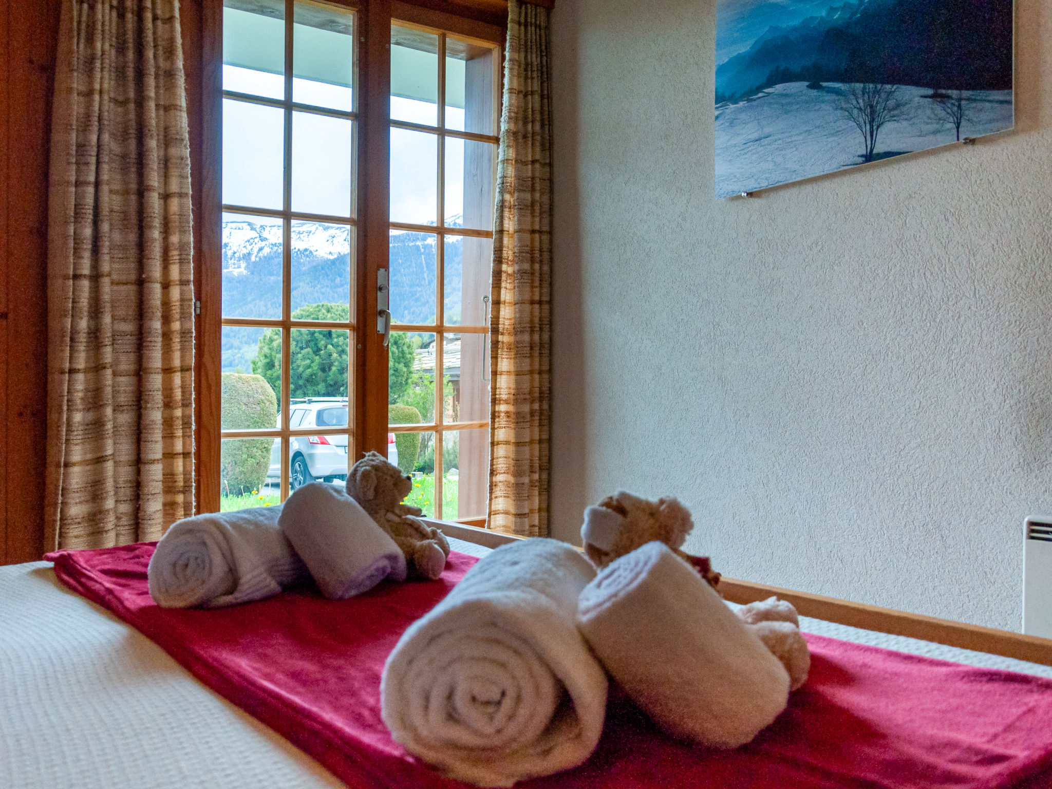 "Petite Plaisance", 4-Zimmer-Chalet 95 m2. Zweckmässig und schön eingerichtet: Eingang. Wohn-/Esszimmer mit offenem Kamin und Kabel-TV. Ausgang zur Terrasse. Offene Küche (Backofen, Geschirrspüler, 4 Induktionskochplatten, Toaster, Wasserkocher, Mikrowelle, elektrische Kaffeemaschine, Kapseln für die Kaffeemaschine (nespresso) extra, Racletteofen, Fondue Set (Käse)). Sep. WC. E-Heizung. Unteres Geschoss: 1 Zimmer mit 2 Betten (90 cm, Länge 200 cm). 1 Zimmer mit 2 Betten (90 cm, Länge 200 cm), Bad/WC und Doppelwaschbecken. Ausgang zum Gartensitzplatz. 1 Zimmer mit 2 Betten (90 cm, Länge 200 cm). Sitzbad, sep. WC. Dachgeschoss: abgeschrägte, offene Galerie, Deckenhöhe 80 - 120 cm. Balkon, Ostlage, grosse Terrasse, Südlage und Ostlage, Garten, Westlage. Terrassenmöbel, Gartengrill. Sehr schöne Sicht auf die Berge und das Tal. Zur Verfügung: Waschmaschine, Wäschetrockner, Kinderhochstuhl, Babybett. Internet (WLAN). Parkplatz, Garage, Höhe 190 cm, Breite 230 cm. Bitte beachten: Nichtraucher-Unterkunft. Maximal 1 Haustier/Hund erlaubt.