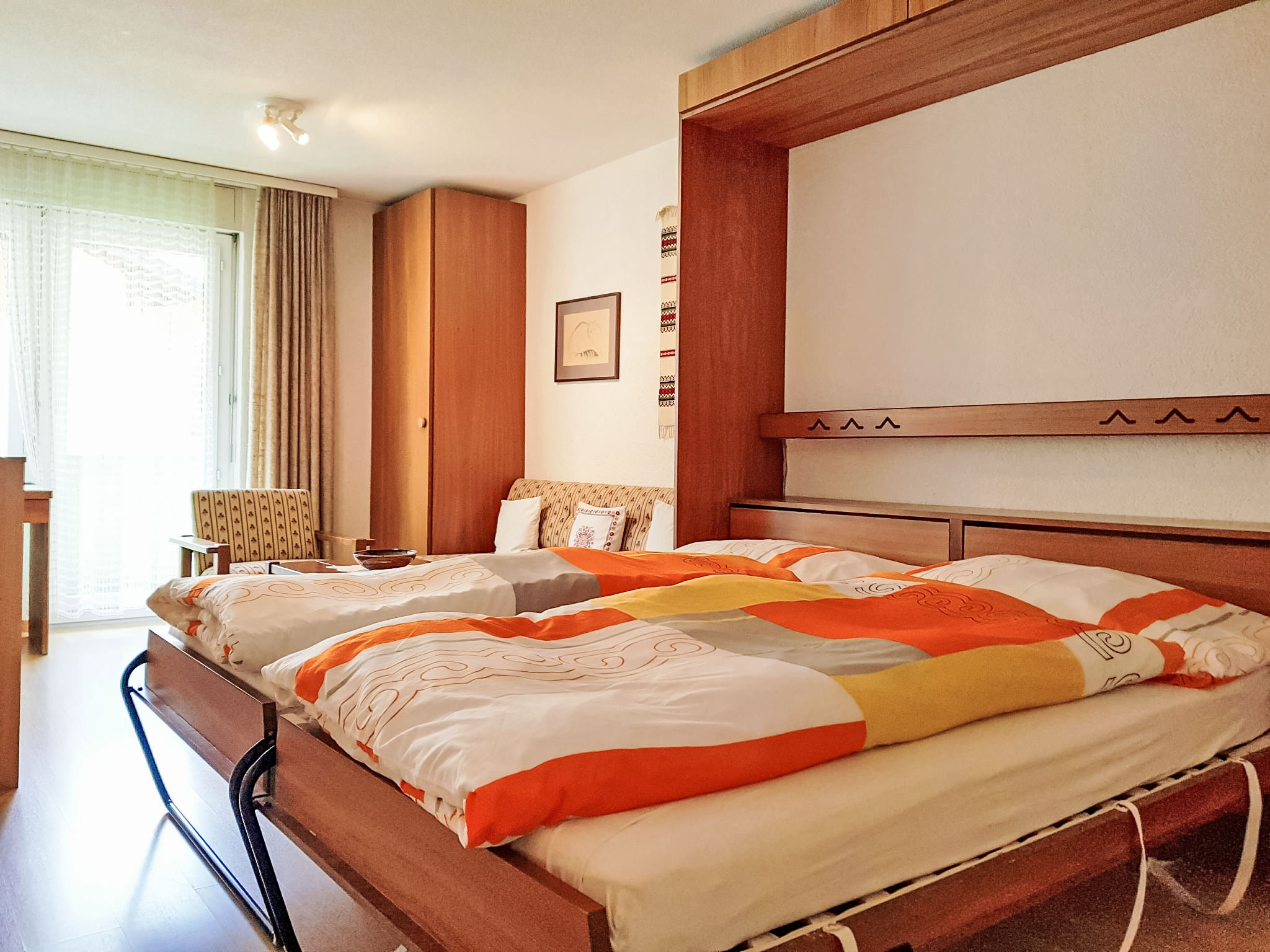 "Castor 202", 1-Zimmer-Wohnung 30 m2. Wohn-/Esszimmer mit 1 Doppelwandschrankbett (2 x 90 cm, Länge 200 cm), Sat-TV und Radio. Kochnische (3 Kochplatten, Backofen, elektrische Kaffeemaschine). Dusche/WC. Balkon, Südlage. Zur Verfügung: Internet (Wireless LAN, gratis). Bitte beachten: Nichtraucher-Unterkunft. Maximal 1 Haustier/Hund erlaubt.