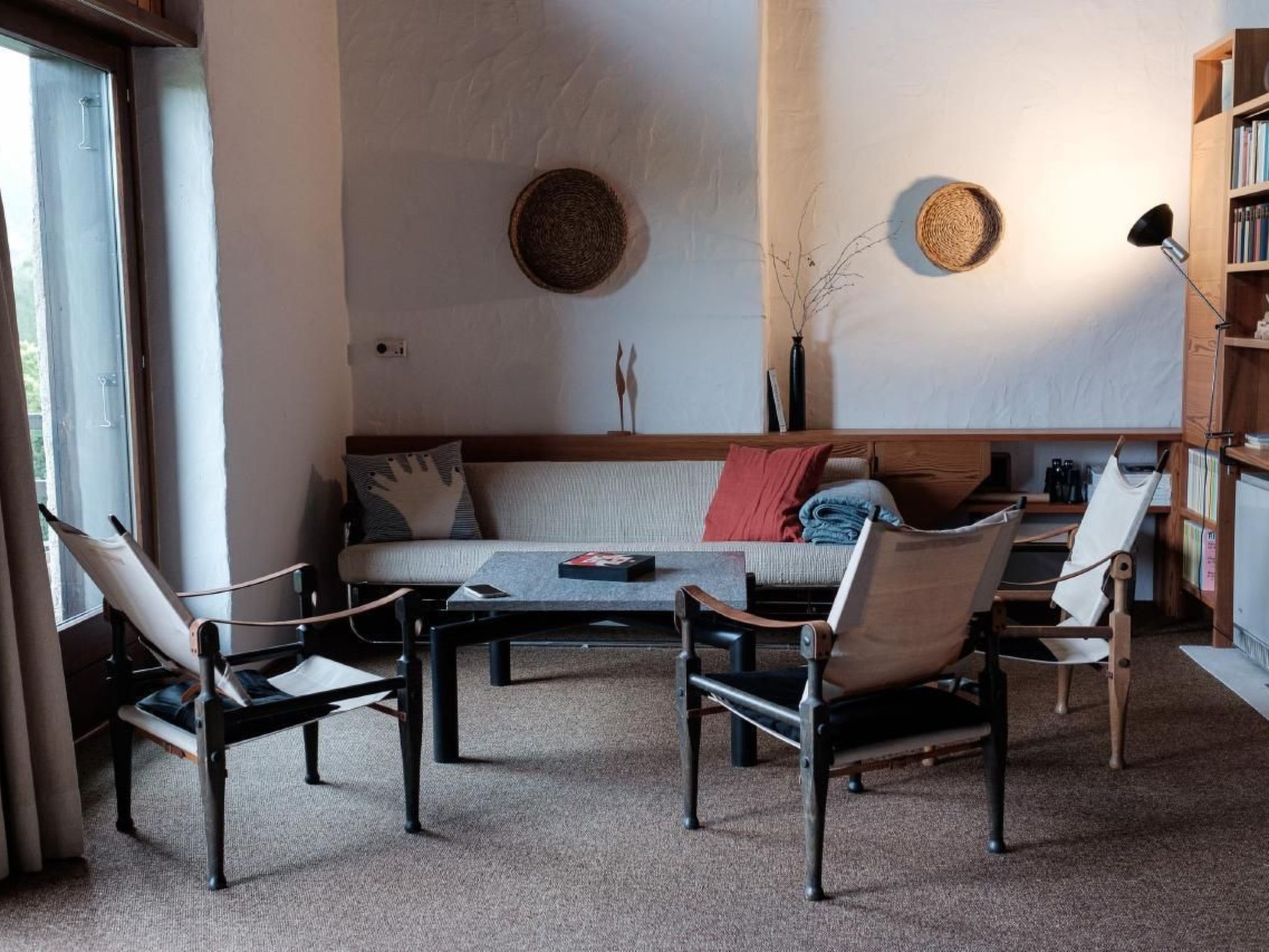 Das Haus hat drei Schlafzimmer: Ein Zimmer mit Doppelbett, ein Zimmer mit zwei Einzelbetten und ein Zimmer mit einem Etagenbett (geeignet für Kinder). Auf derselben Ebene befinden sich Küche und Bad sowie ein schönes, helles Wohnzimmer mit einem freistehenden Kamin. Eine Galerie dient als Rückzugsort, wo es sich gut Arbeiten lässt oder wo sich Kinder ausbreiten können. Im Untergeschoss hat es eine Sauna und einen Kaltwasser-Zuber, um sich nach dem Schwitzen abzukühlen. Der Aussenbereich besteht aus einem grossen, gedeckten Balkon und viel Grün mit verschiedenen Sitzgelegenheiten.