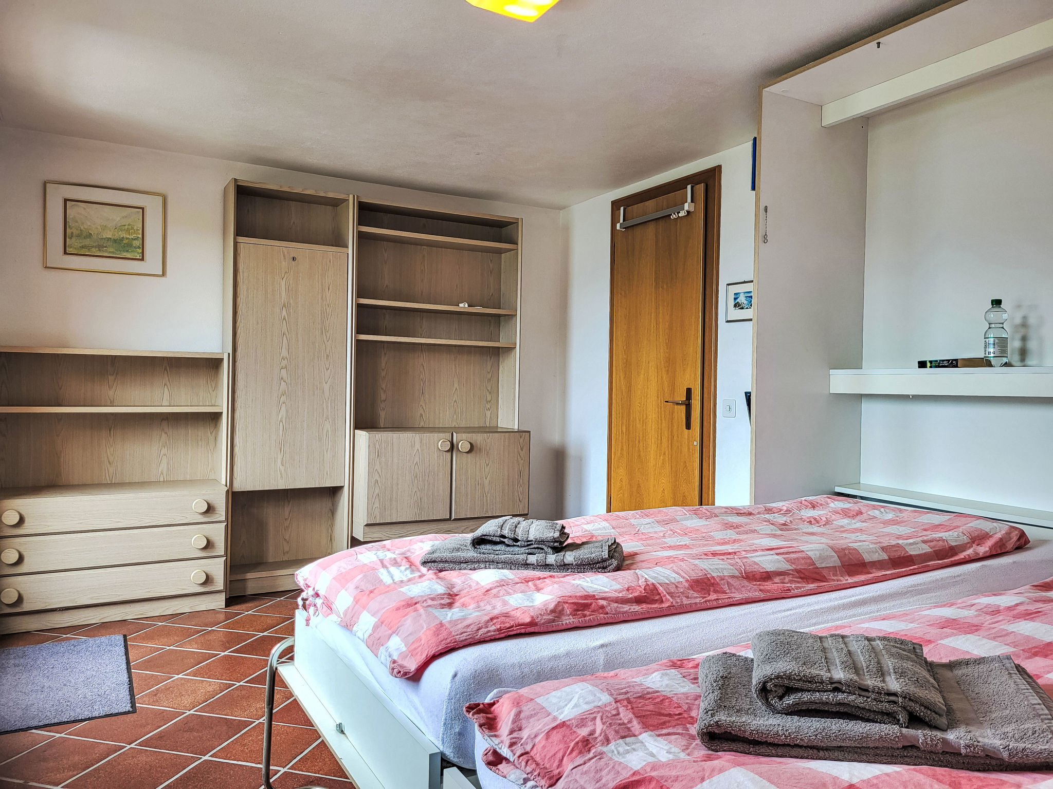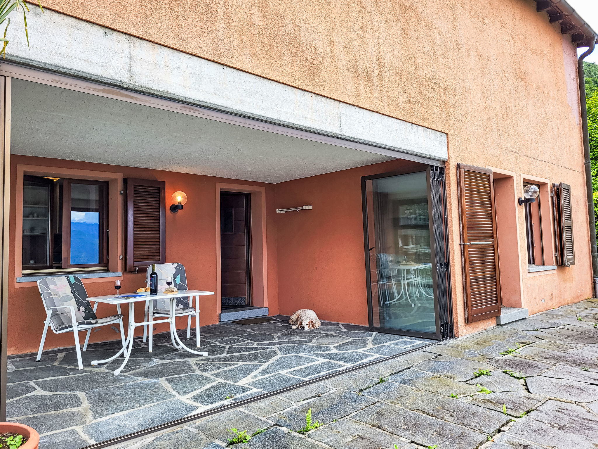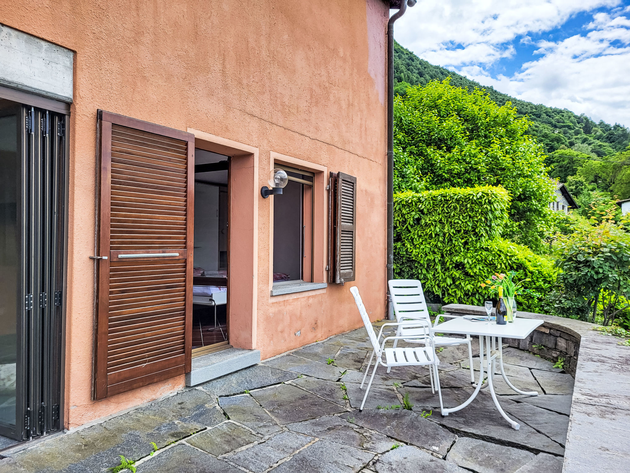 "Studio Indèman", 2-Zimmer-Studio 35 m2. Objekt geeignet für 2 Erwachsene. Einfach und zweckmässig eingerichtet: 1 Doppelzimmer mit 2 Wandschrankbetten (90 cm, Länge 200 cm), Radio. Ausgang zur Terrasse. Kleine Küche (4 Kochplatten, Geschirrspüler, Toaster, elektrische Kaffeemaschine, Kapseln für die Kaffeemaschine (Delizio) extra). Dusche/WC. Ölheizung. Natursteinboden. Grosse Terrasse 25 m2, grosser Gartensitzplatz, grosser Garten. Terrassenmöbel, Balkonmöbel, Wintergarten. Herrliche Panoramasicht auf den See, die Berge, die Landschaft und die Ortschaft. Bitte beachten: Nichtraucher-Unterkunft. Maximal 1 Haustier/Hund erlaubt. NL-00008948