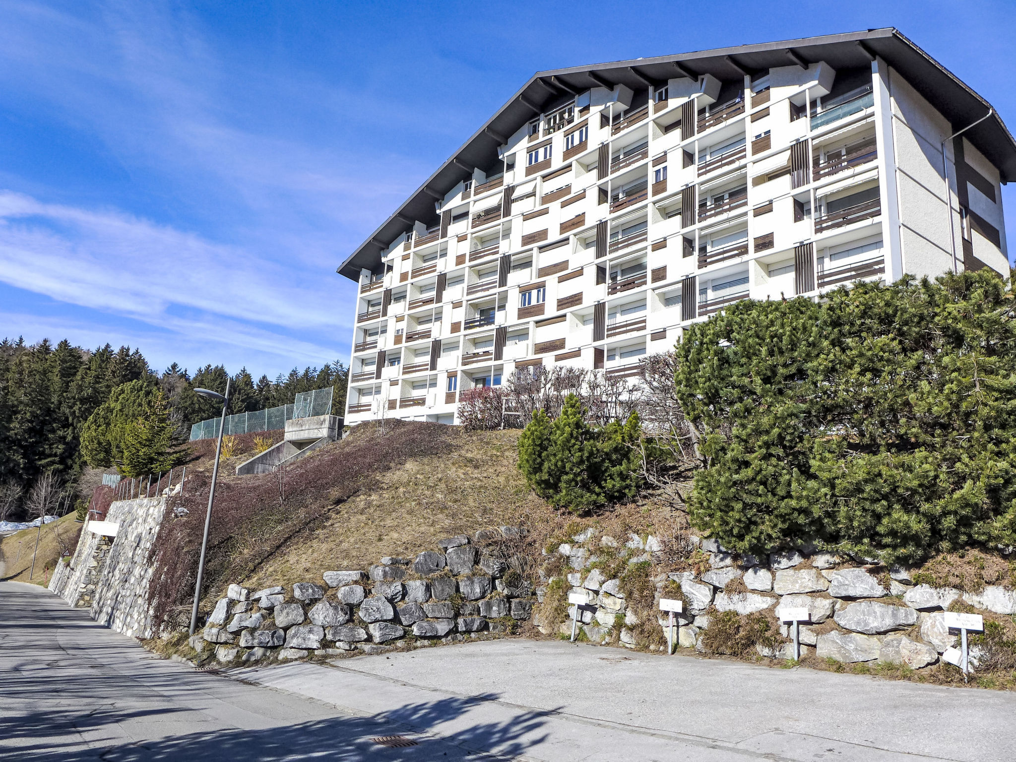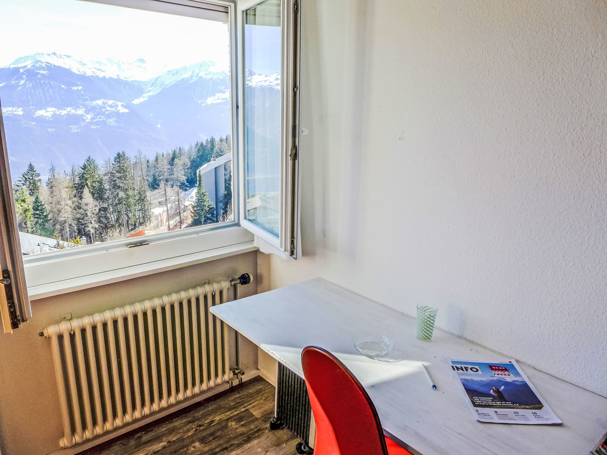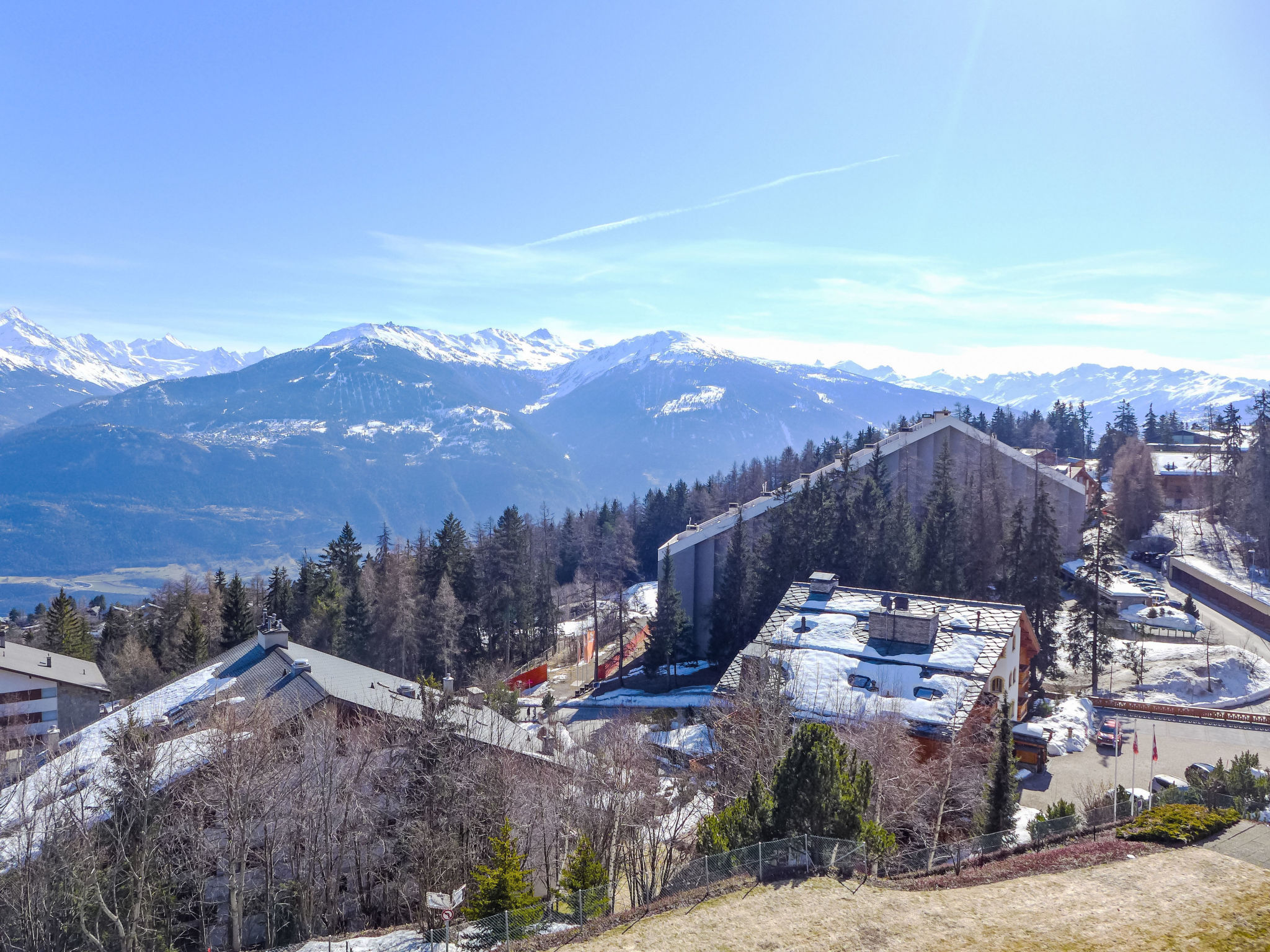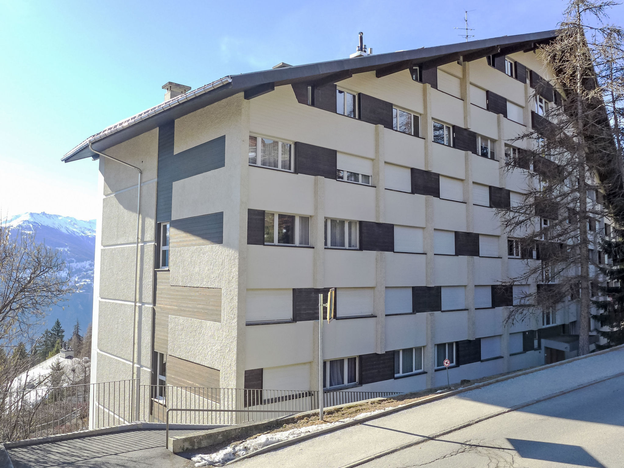 Mehrfamilienhaus "Les Orzières". Im Ortsteil Marigny, 550 m vom Zentrum von Montana, ruhige, sonnige Lage, 1.3 km vom See, 1.8 km vom Skigebiet, Richtung Süden. Im Hause: Fahrstuhl, Skiraum, Zentralheizung, Waschmaschine, Wäschetrockner (zur Mitbenutzung, extra), Trockenraum. Gemeinschaftsgarage. Einkaufsgeschäft, Supermarkt 500 m, Restaurant 600 m, Bäckerei 550 m, Zentrum zu Fuss in 6 Minuten erreichbar, Bushaltestelle "Montana Poste" 400 m, Bahnstation "Funiculaire Montana Gare" 1.8 km, Badesee "Moubra" 1.5 km, See Moubra 1.3 km. Golfplatz (18 Loch) 3.6 km, Skisportanlagen 1.8 km. Bekannte Seen in der Umgebung sind gut erreichbar: Lac Grenon 2.5 km, Etang Long 2.9 km. Bitte beachten: Gratis Skibus.