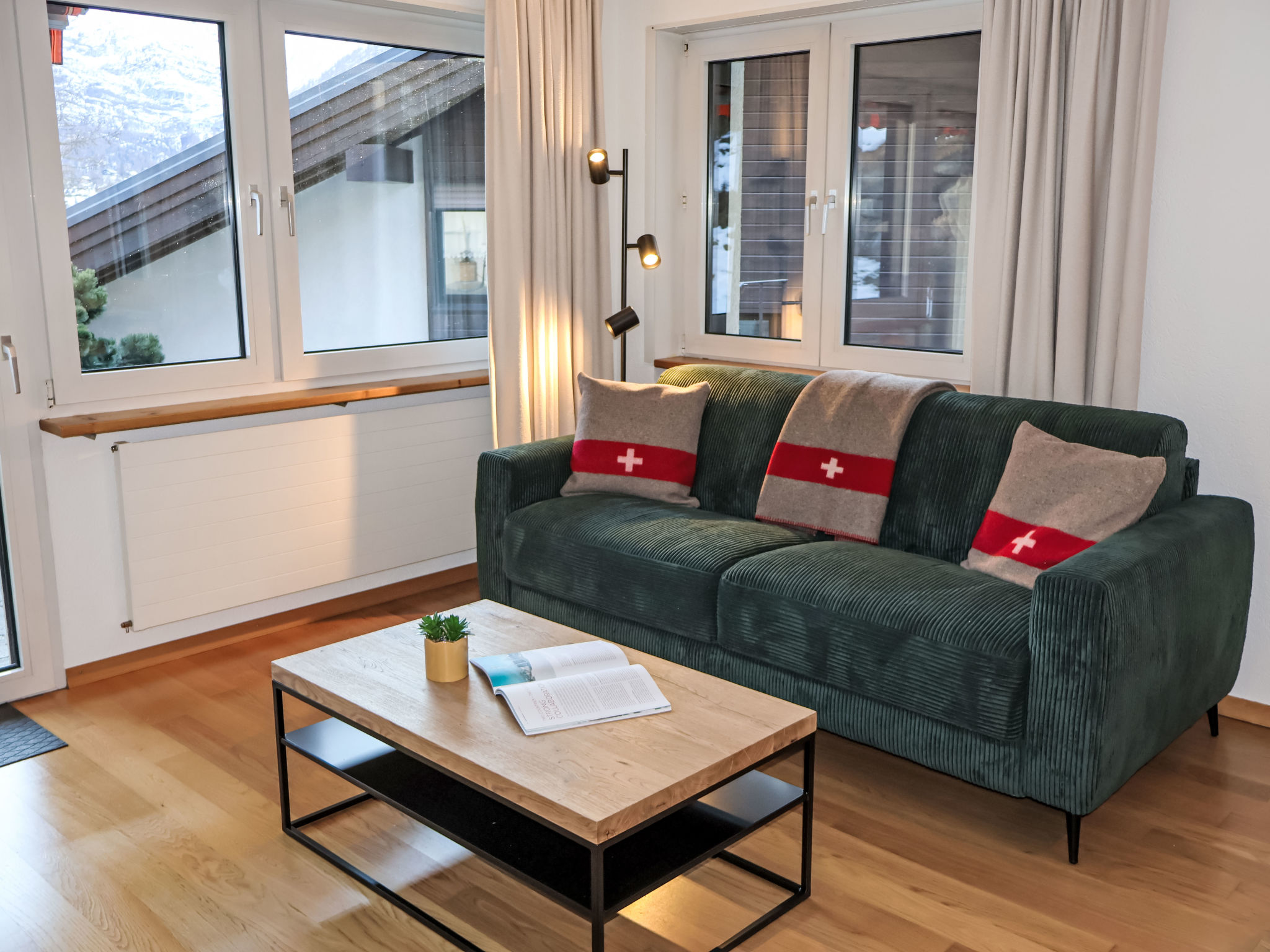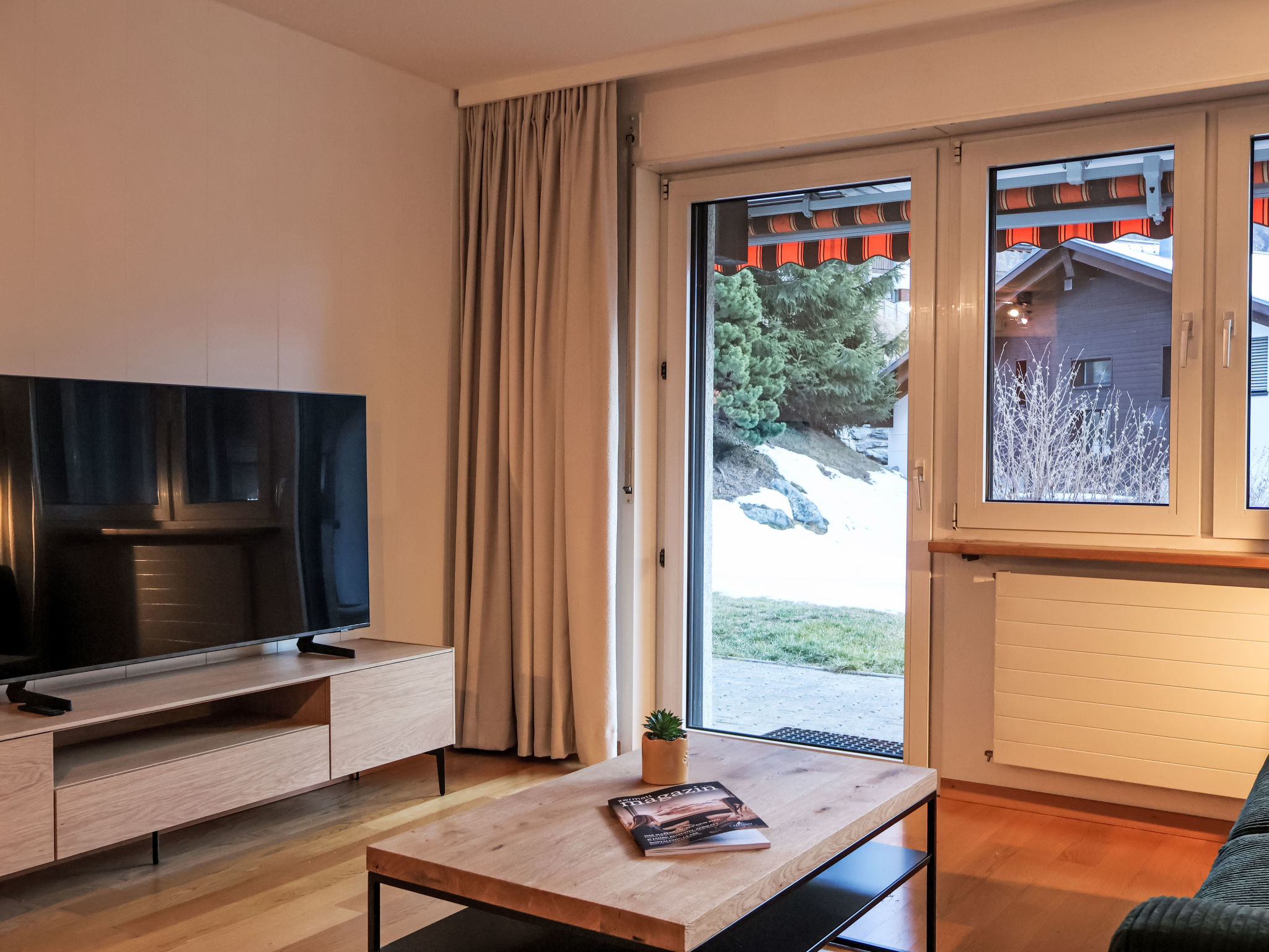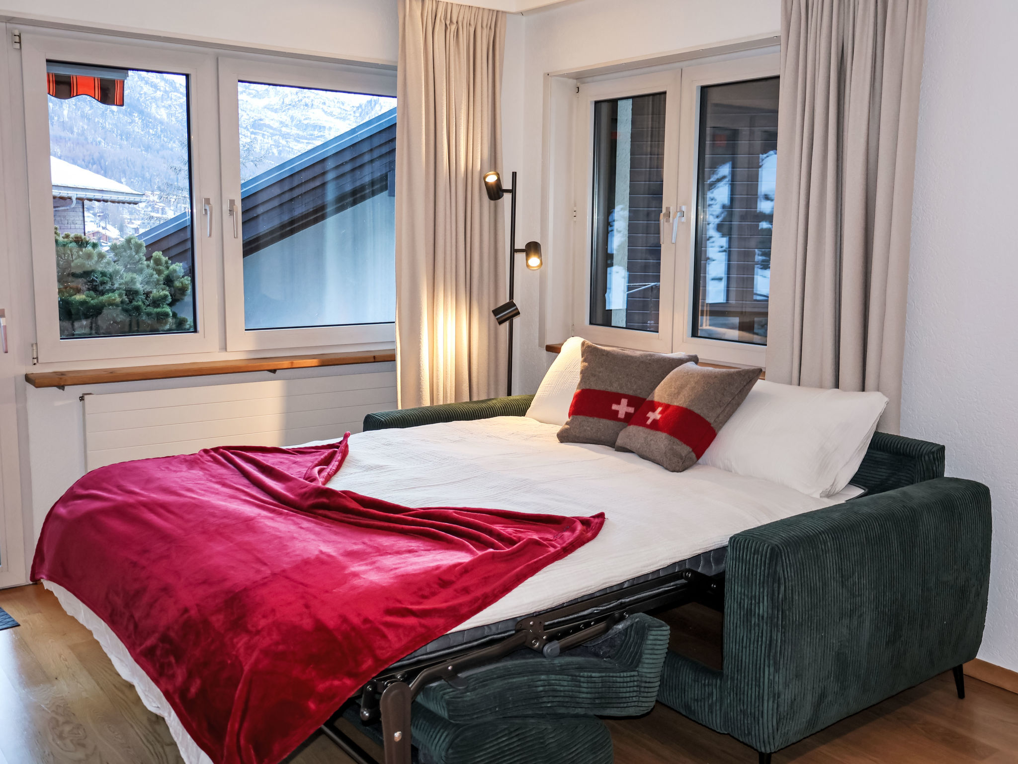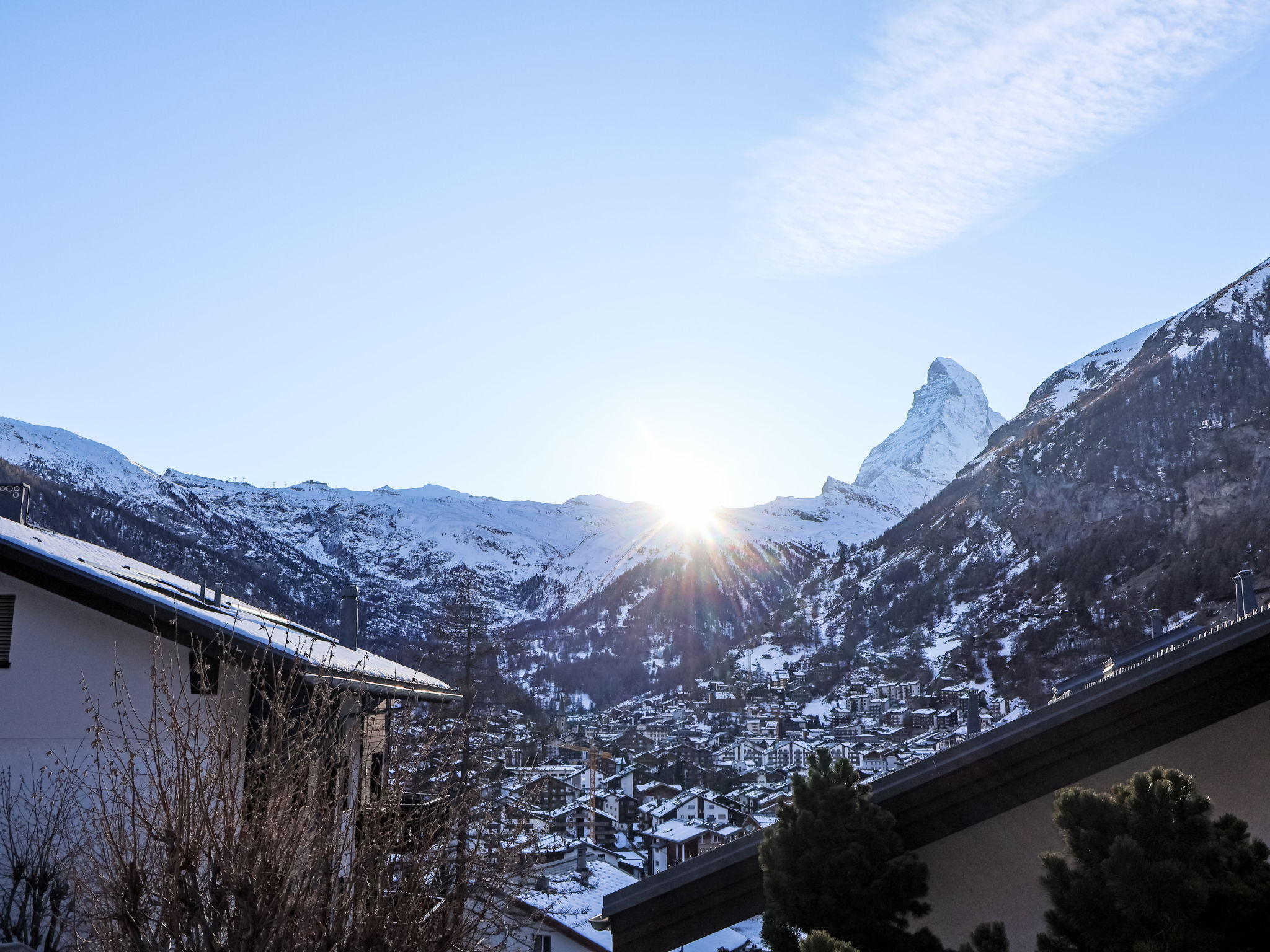 "Sonnhalde A", 2-Zimmer-Wohnung 60 m2, im Erdgeschoss. Hell, teilweise renoviert, geschmackvoll und gemütlich eingerichtet: Wohn-/Schlafzimmer mit 1 Doppeldiwanbett (140 cm, Länge 200 cm), Esstisch und Digital-TV. Ausgang zum Balkon. 1 Doppelzimmer mit 1 Doppelbett (160 cm, Länge 200 cm). (Backofen, Geschirrspüler, 4 Glaskeramikplatten, Toaster, Wasserkocher, Tiefkühler, elektrische Kaffeemaschine, Racletteofen, Fondue Set (Käse)). Bad/WC. Parkettboden. Terrasse. Terrassenmöbel. Sehr schöne Sicht auf die Berge, die Ortschaft und das Matterhorn. Zur Verfügung: Haartrockner. Internet (WLAN, gratis). Bitte beachten: Nichtraucher-Unterkunft.