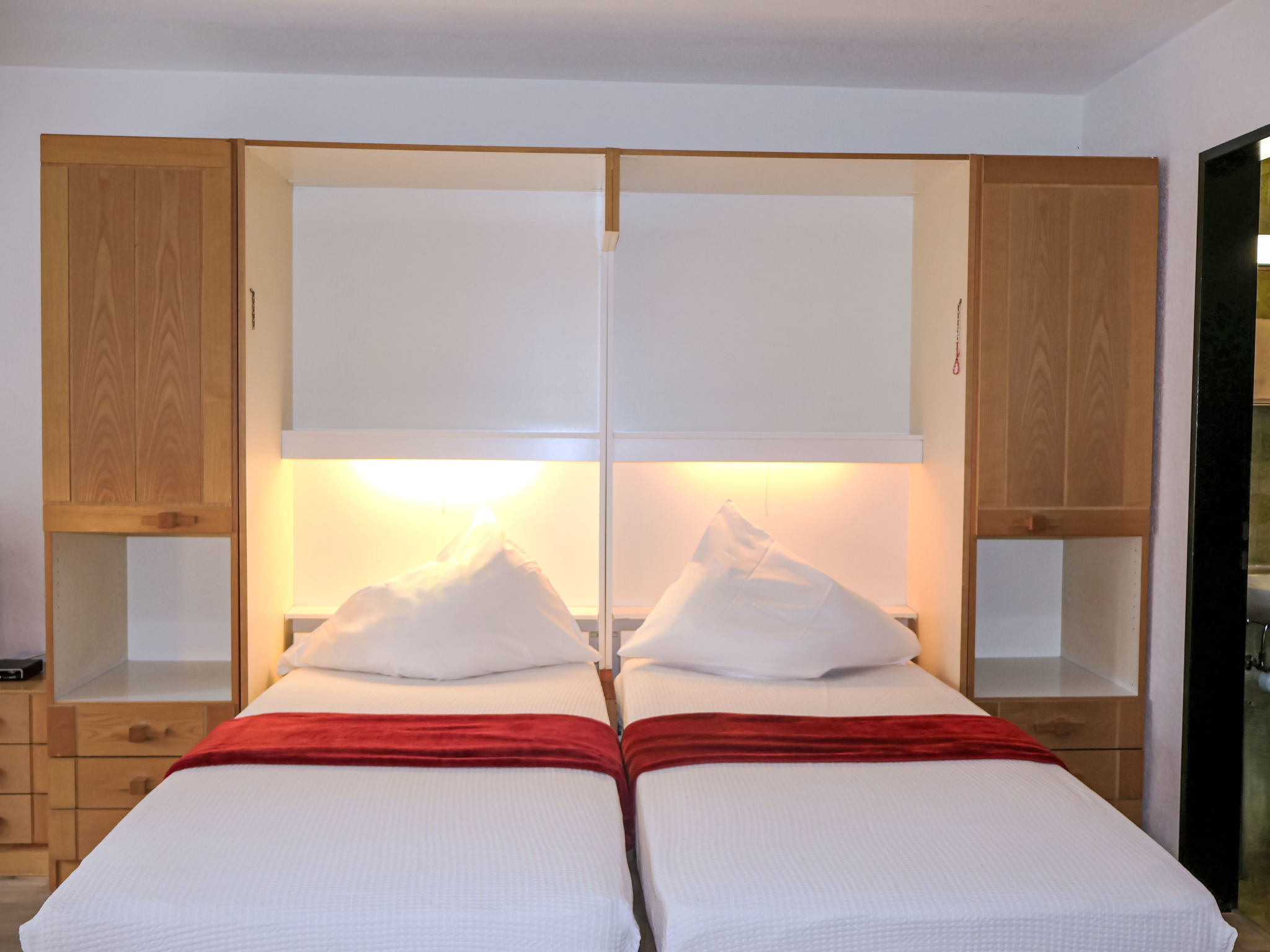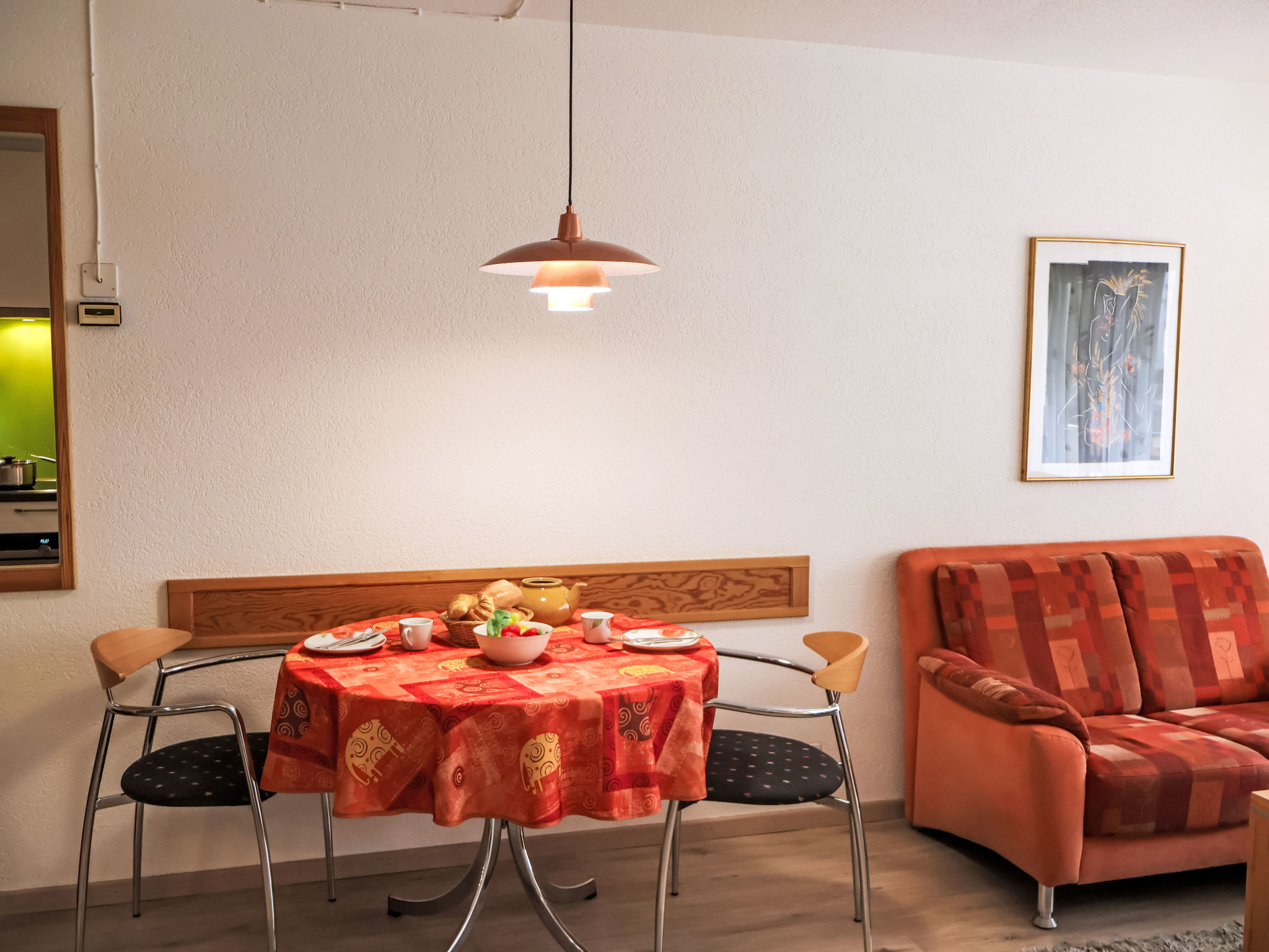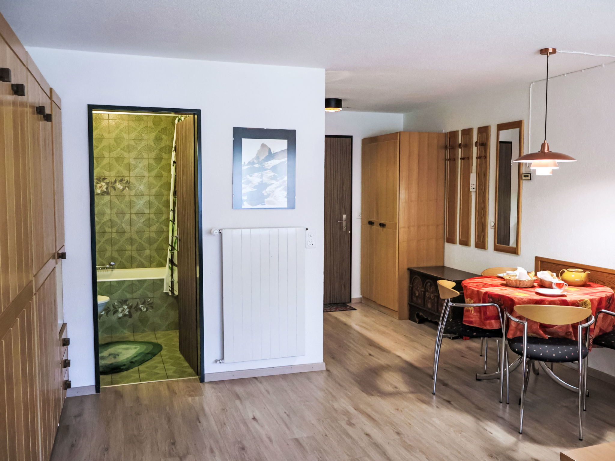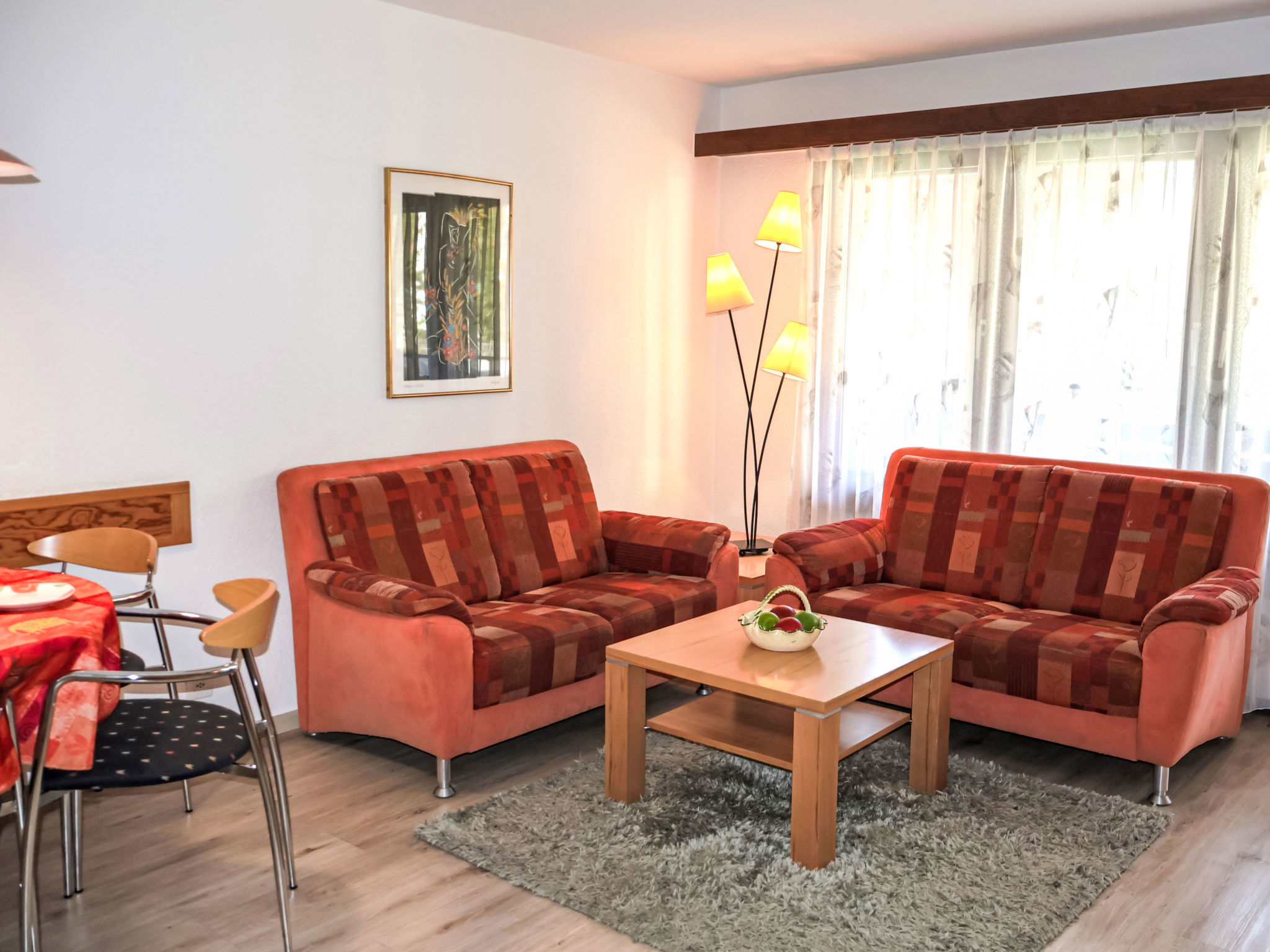 "Pasadena 6", 1-Zimmer-Wohnung 25 m2 im 2. Stock. Hell, teilweise renoviert, geschmackvoll und gemütlich eingerichtet: Wohn-/Schlafzimmer mit 2 Wandschrankbetten (90 cm, Länge 200 cm), Esstisch und Digital-TV. Ausgang zum Balkon. Küche im Eingang (Backofen, Geschirrspüler, 4 Glaskeramikplatten, Toaster, Wasserkocher, Tiefkühler, elektrische Kaffeemaschine). Bad/WC. Parkettboden. Balkon. Balkonmöbel. Seitliche Sicht auf die Berge. Zur Verfügung: Haartrockner. Internet (WLAN, gratis). Bitte beachten: Nichtraucher-Unterkunft.