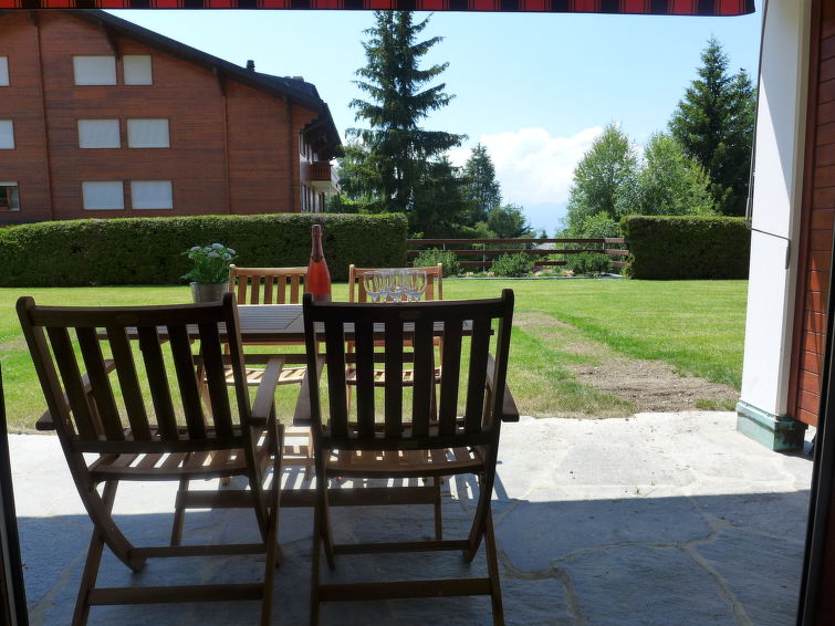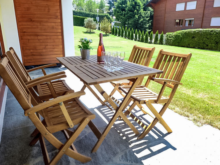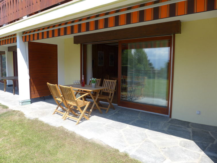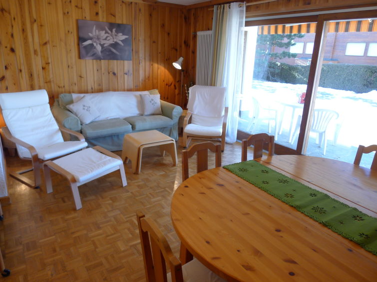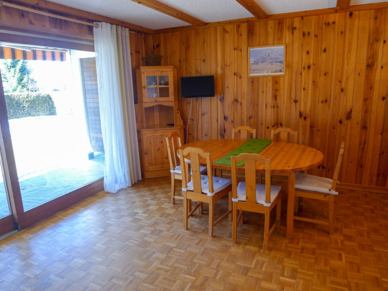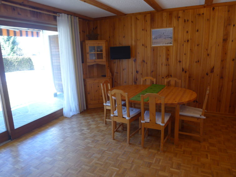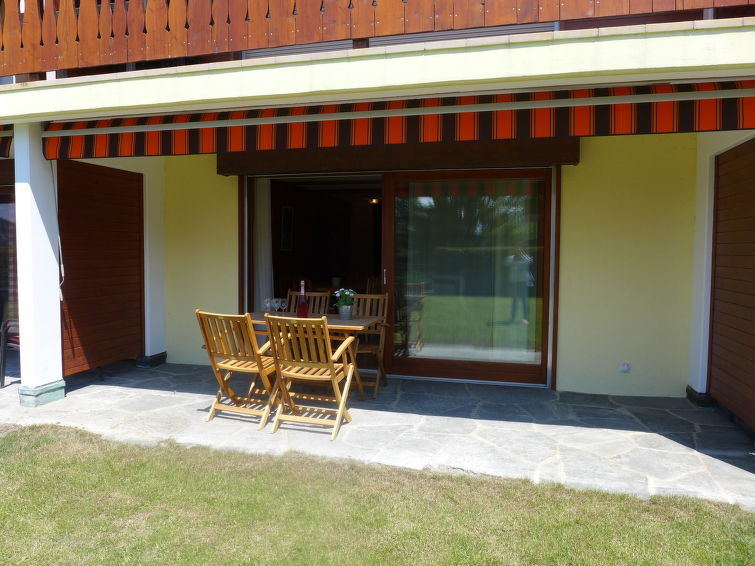 "Hyacinthe 2", 3-Zimmer-Wohnung 80 m2, im Erdgeschoss, Südlage. Zweckmässig und schön eingerichtet: Wohn-/Esszimmer mit Kabel-TV. Ausgang zum Garten, zur Terrasse. 1 Zimmer, ohne Schrank mit 1 Doppelbett (160 cm, Länge 200 cm). 1 Zimmer mit 2 x 2 Etagenbetten (80 cm, Länge 190 cm). Kleine Küche (Backofen, Geschirrspüler, 4 Glaskeramikplatten, Toaster, Wasserkocher, Mikrowelle, Tiefkühler, elektrische Kaffeemaschine, Kapseln für die Kaffeemaschine (Martello) extra, Racletteofen, Fondue Set (Käse)) mit Durchreiche. Bad/Bidet/WC, Dusche/WC. Parkettboden, Teppichboden. Terrasse. Terrassenmöbel. Schöne Sicht. Zur Verfügung: Bügeleisen, Haartrockner. Internet (Wireless LAN, gratis). Garage Nr. 18.