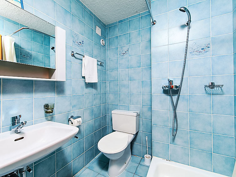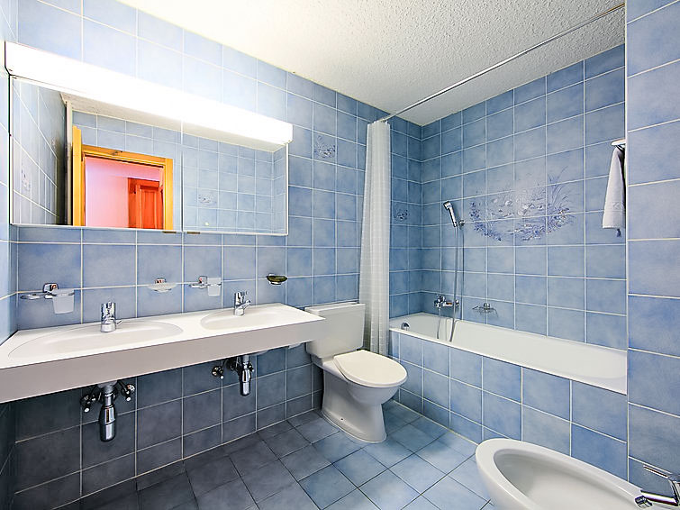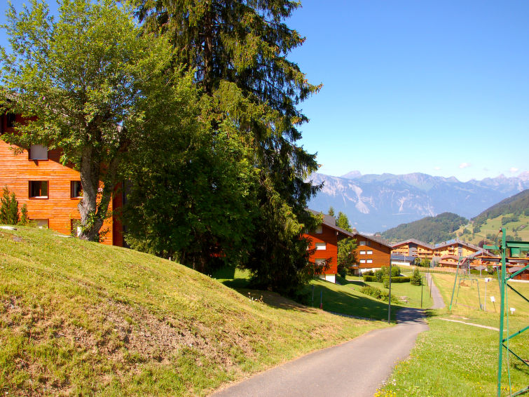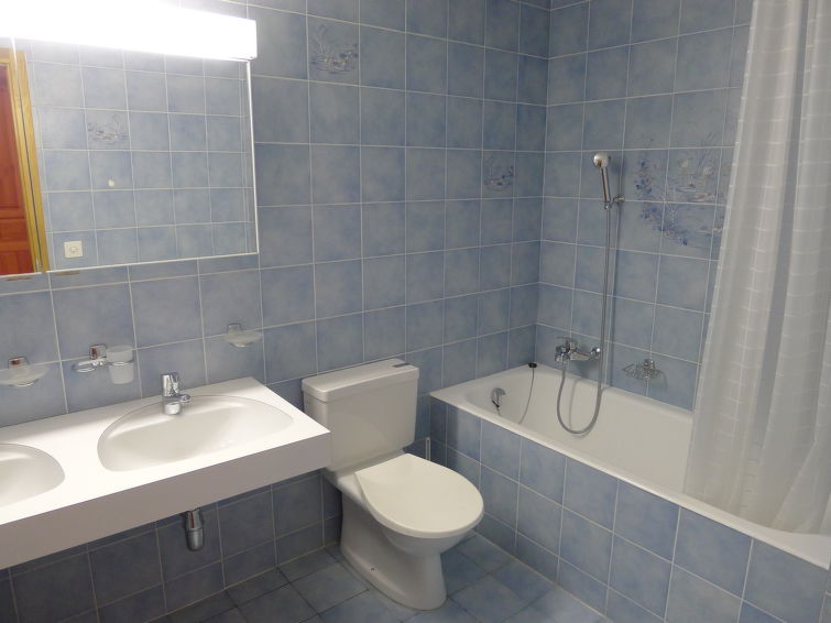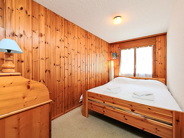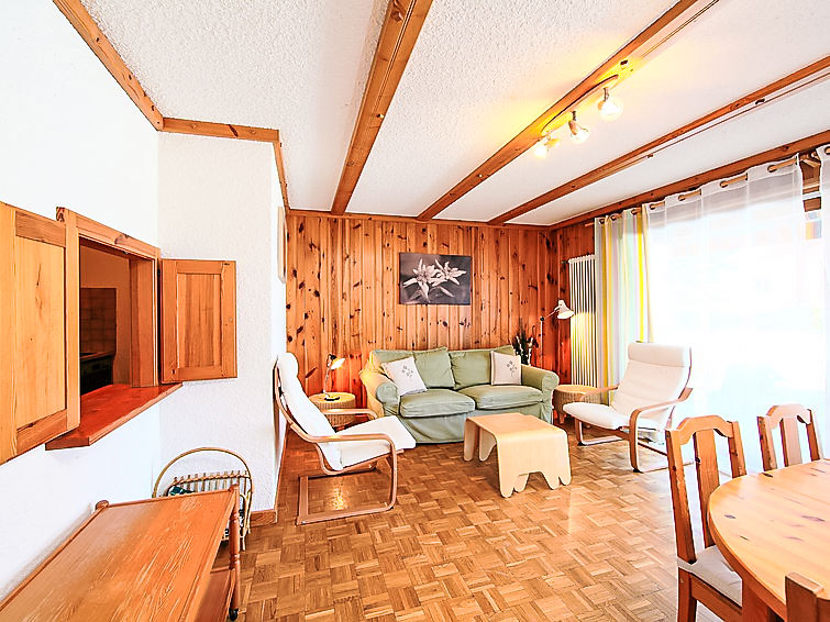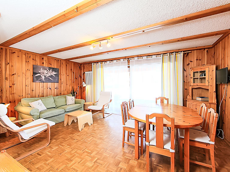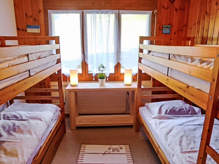 "Hyacinthe 2", 3-Zimmer-Wohnung 80 m2, im Erdgeschoss, Südlage. Zweckmässig und schön eingerichtet: Wohn-/Esszimmer mit Kabel-TV. Ausgang zum Garten, zur Terrasse. 1 Zimmer, ohne Schrank mit 1 Doppelbett (160 cm, Länge 200 cm). 1 Zimmer mit 2 x 2 Etagenbetten (80 cm, Länge 190 cm). Kleine Küche (Backofen, Geschirrspüler, 4 Glaskeramikplatten, Toaster, Wasserkocher, Mikrowelle, Tiefkühler, elektrische Kaffeemaschine, Kapseln für die Kaffeemaschine (Martello) extra, Racletteofen, Fondue Set (Käse)) mit Durchreiche. Bad/Bidet/WC, Dusche/WC. Parkettboden, Teppichboden. Terrasse. Terrassenmöbel. Schöne Sicht. Zur Verfügung: Bügeleisen, Haartrockner. Internet (Wireless LAN, gratis). Garage Nr. 18.