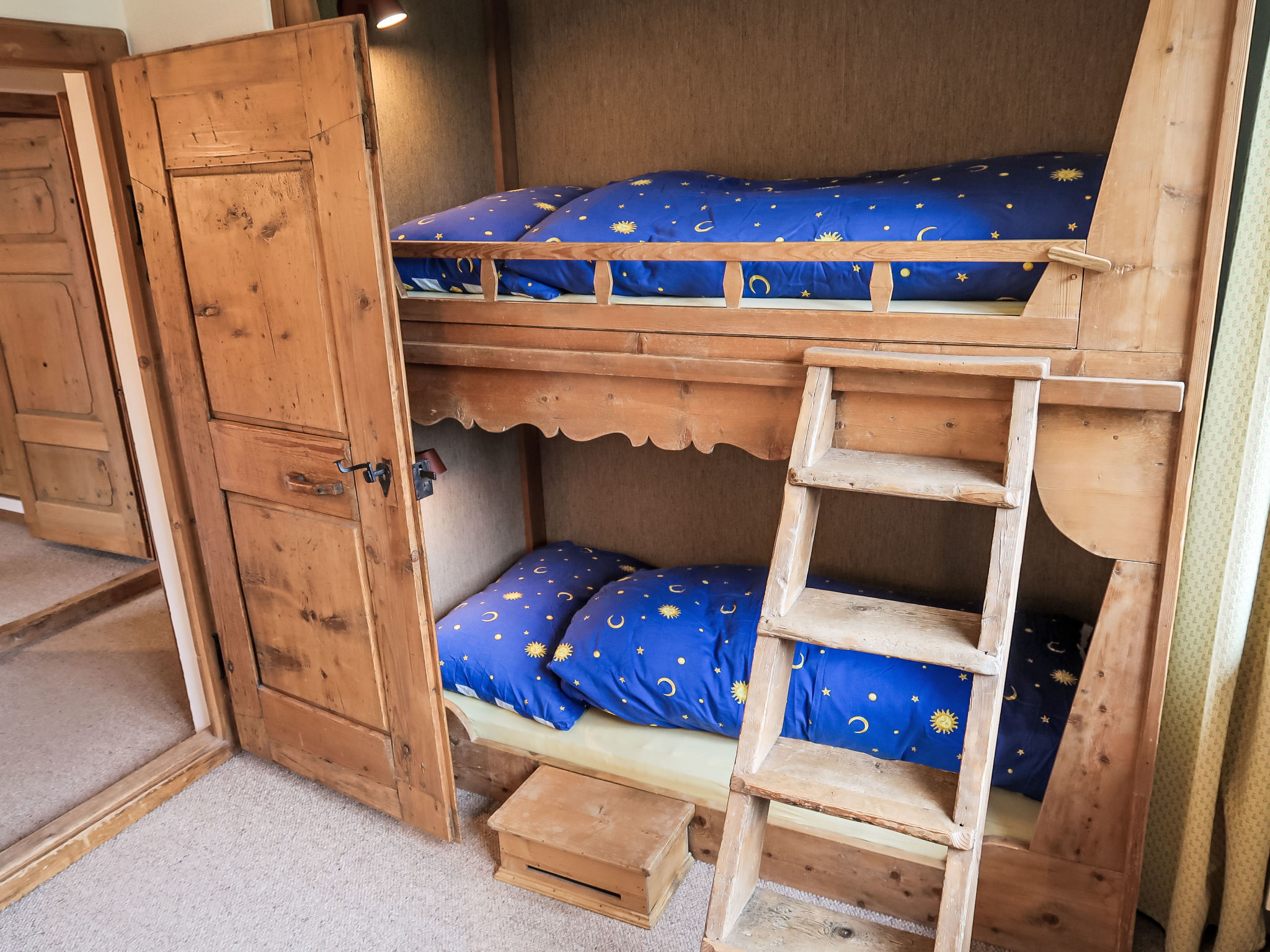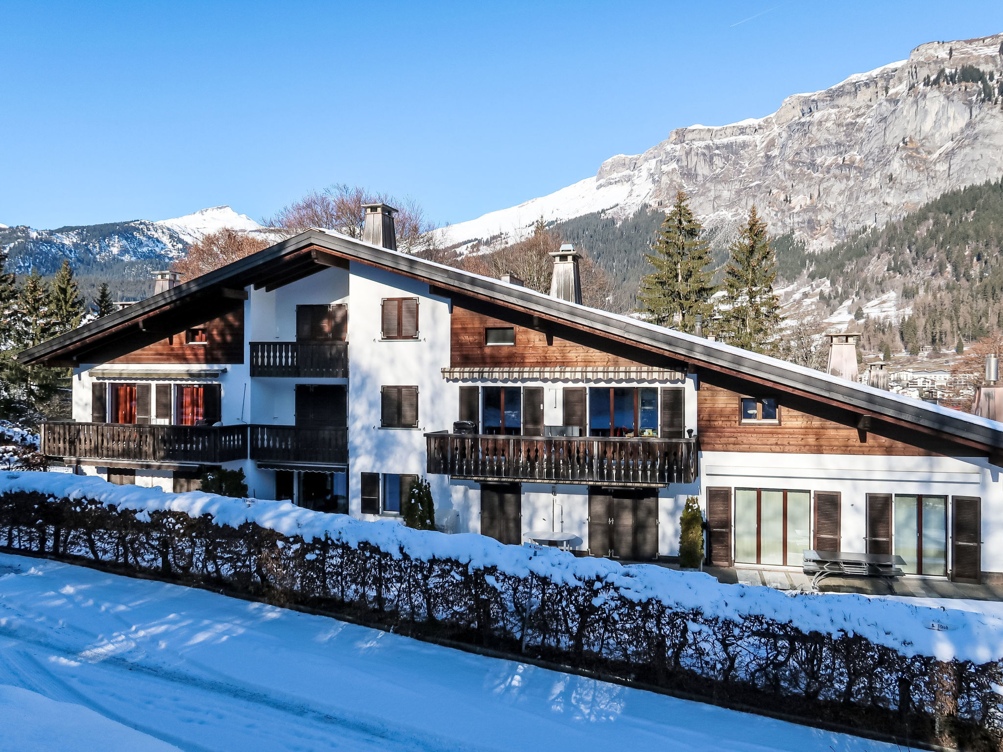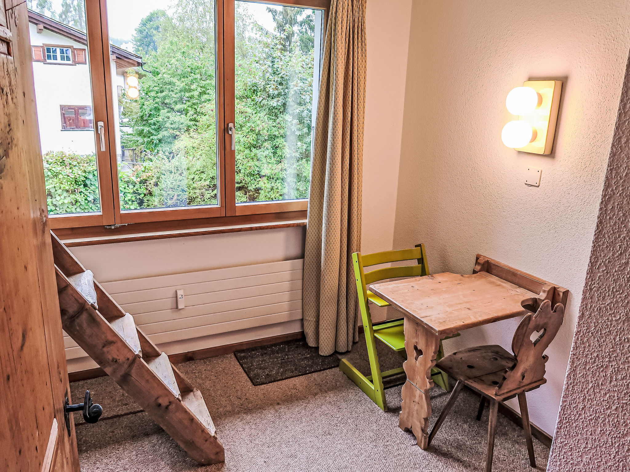"Villa Waldpark", 5-Zimmer-Maisonette-Wohnung 85 m2 auf 2 Stockwerken im 1. Stock. Komfortabel und gemütlich eingerichtet: Wohn-/Esszimmer mit Sat-TV (Flachbildschirm). Ausgang zum Balkon. 1 Zimmer mit 1 Doppelbett (160 cm, Länge 185 cm). 1 Kinderzimmer mit 1 x 2 Etagenbetten (90 cm, Länge 185 cm). Offene Küche (Backofen, Geschirrspüler, 4 Induktionskochplatten, Wasserkocher, elektrische Kaffeemaschine, Kapseln für die Kaffeemaschine (Nespresso) extra, Racletteofen, Fondue Set (Chinoise, Käse)) mit Esstisch. Bad/WC. Obergeschoss: Galerie. 1 Zimmer mit 1 Doppelbett (180 cm, Länge 185 cm). Dusche/WC. Balkon 10 m2, Südlage. Balkonmöbel, Liegestühle (1). Schöne Sicht auf die Berge und die Landschaft. Zur Verfügung: Waschmaschine. Internet (Wireless LAN, gratis). Garage Nr. 7 (1 Auto). Bitte beachten: geeignet für Familien. Nichtraucher-Unterkunft.
