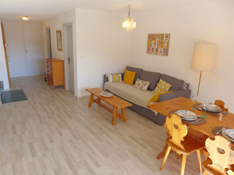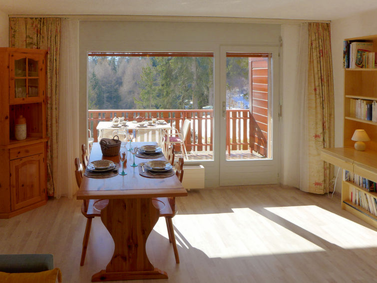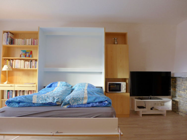 "Les Faverges 1", 1-Zimmer-Studio 35 m2, im erhöhten Erdgeschoss. Objekt geeignet für 2 Erwachsene + 1 Kind. Wohn-/Esszimmer mit 1 Diwanbett (144 cm, Länge 200 cm), 1 franz. Wandklappbett (135 cm, Länge 190 cm), Kabel-TV (Flachbildschirm). Ausgang zum Balkon, Richtung Süden mit Flachbildschirm. Küche (3 Kochplatten, Backofen, Geschirrspüler, Toaster, Wasserkocher, Mikrowelle, elektrische Kaffeemaschine, Kapseln für die Kaffeemaschine (Nespresso) extra, Racletteofen). Bad/Bidet/WC. Balkon, Südlage. Balkonmöbel. Sicht auf den Wald. Zur Verfügung: Bügeleisen, Babybett bis 2 Jahre, Haartrockner. Internet (Wireless LAN, gratis). Garage Nr. 1, Höhe 200 cm, Breite 210 cm. Bitte beachten: Nichtraucher-Unterkunft. Faltbares Babybett ohne Bettwäsche und ohne Decke.
