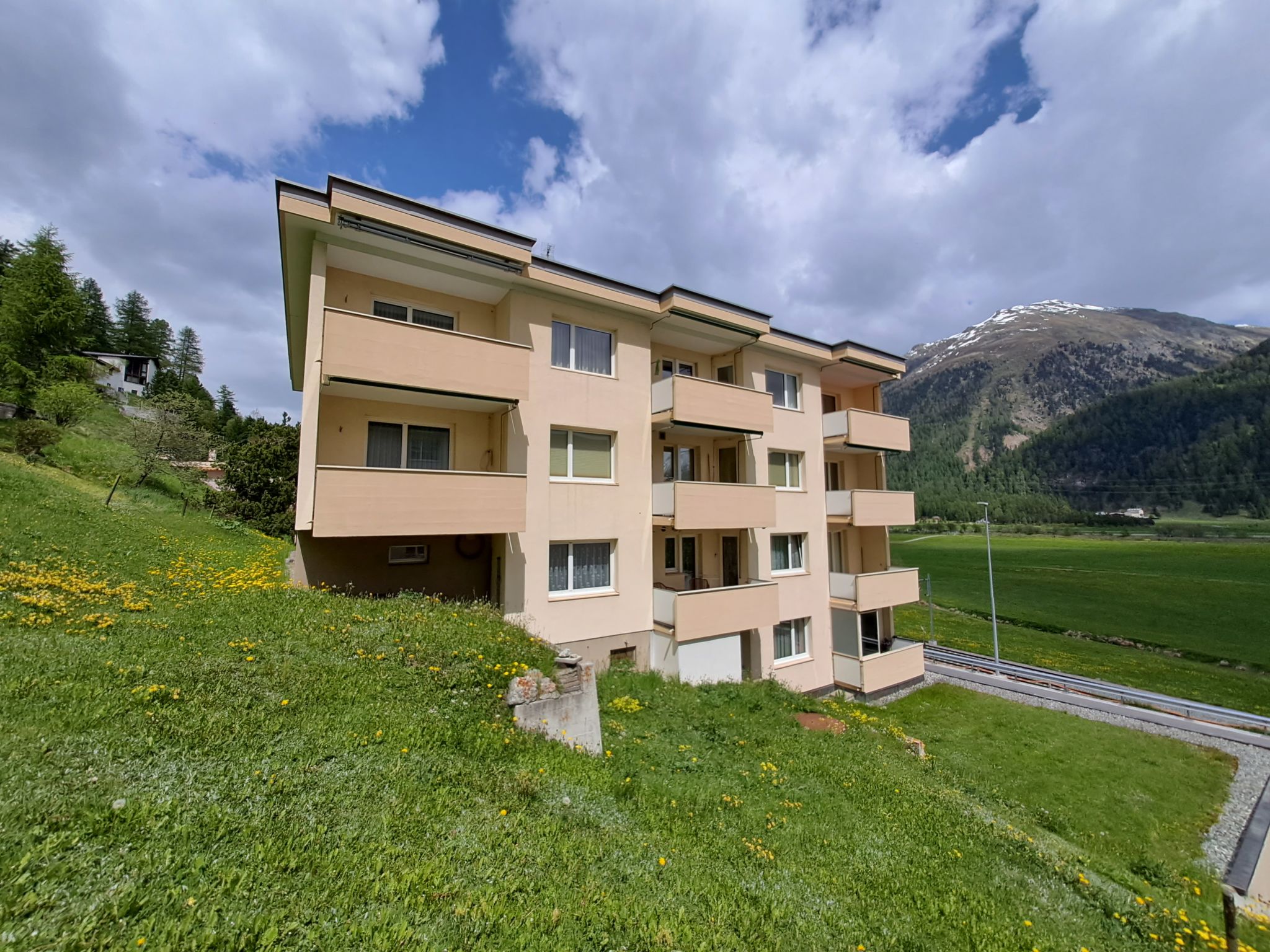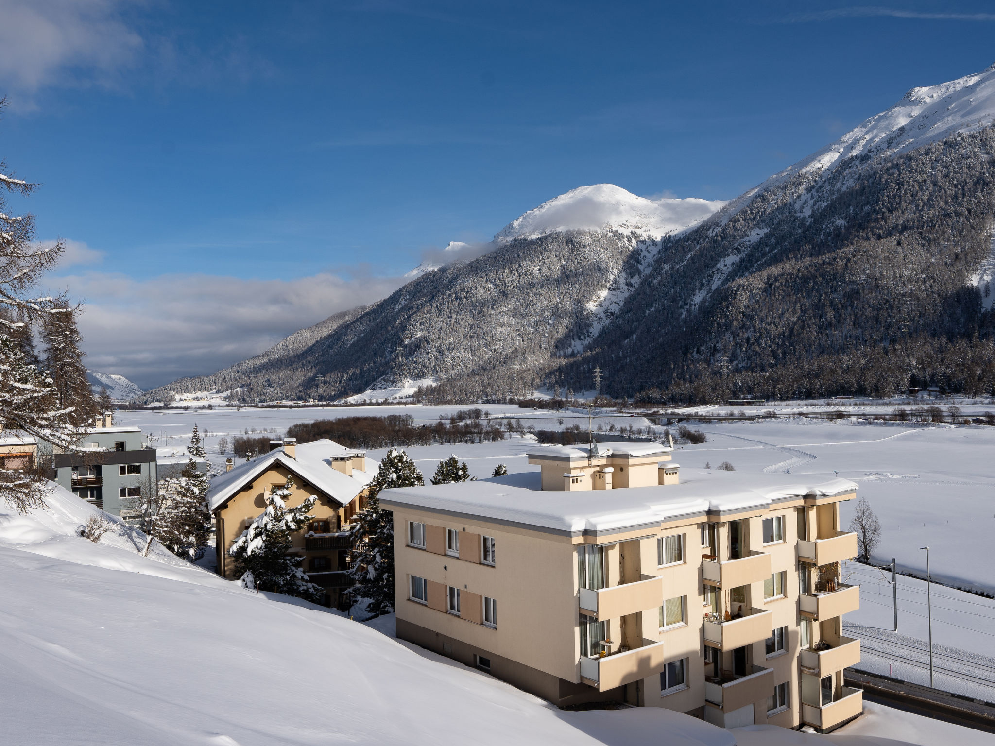 Samedan: Mehrfamilienhaus "Chesa Muntarütsch", auf 4 Stockwerken. Am Ortsrand, am Hang, an einer Strasse. Zur Mitbenutzung: Garten (nicht eingezäunt), Naturgarten. Terrasse. Im Hause: Einstellraum für Fahrräder, Skiraum, Waschmaschine (extra), Wäschetrockner (zur Mitbenutzung, extra), Trockenraum. Einzelgarage. Supermarkt 1.2 km, Einkaufszentrum 1.9 km, Restaurant 800 m, Bäckerei 650 m, Bushaltestelle 300 m, Bahnstation 900 m, Hallenbad 8.8 km. Golfplatz (18 Loch) 1.7 km, Tennis 1.8 km, Reitstall 7 km, Wanderwege ab Haus, Radweg 100 m, Bergeisenbahn 4 km, Sessellift 1.2 km, Skipisten 4 km, Skiverleih 900 m, Skischule 4 km, Langlaufloipe 500 m. Bekannte Skigebiete sind gut erreichbar: Corviglia - Marguns - Celerina 4 km, Corvatsch - Furtschellas - Surlej 14 km, Diavolezza - Lagalb - Pontresina 18 km. Bekannte Seen in der Umgebung sind gut erreichbar: Lej da Staz 9 km, St. Moritz See 8 km, Silvaplana See 13 km. Wandergebiete: Corviglia - Piz Nair, Muottas Muragl, Val Bever. Bitte beachten: Eisenbahnlinie in der Nähe 30 m vom Haus.