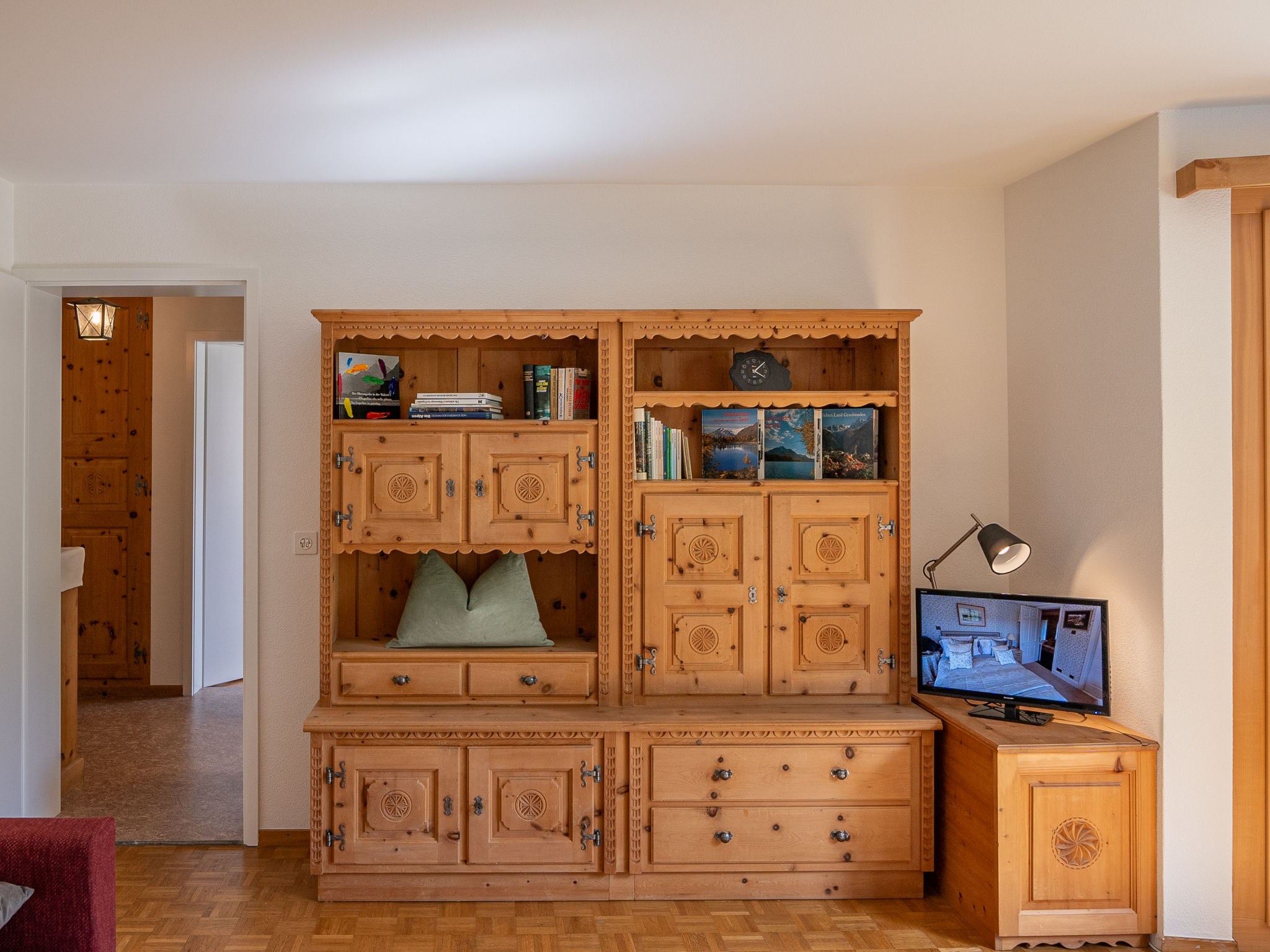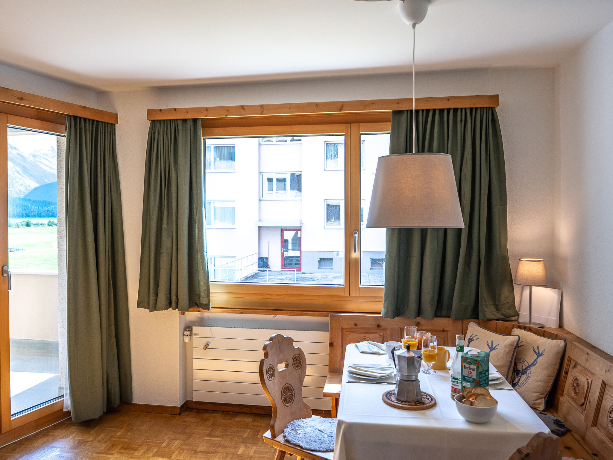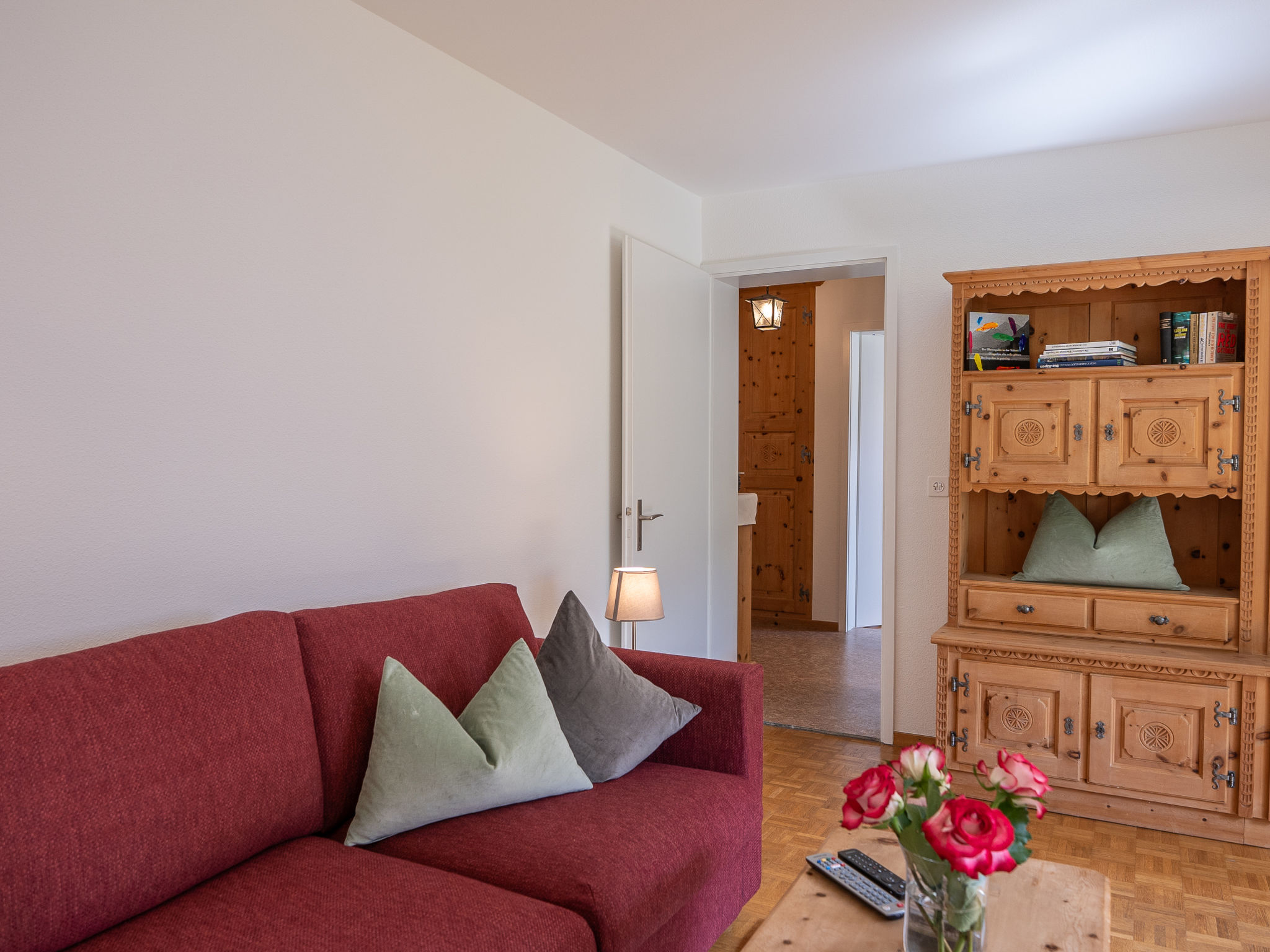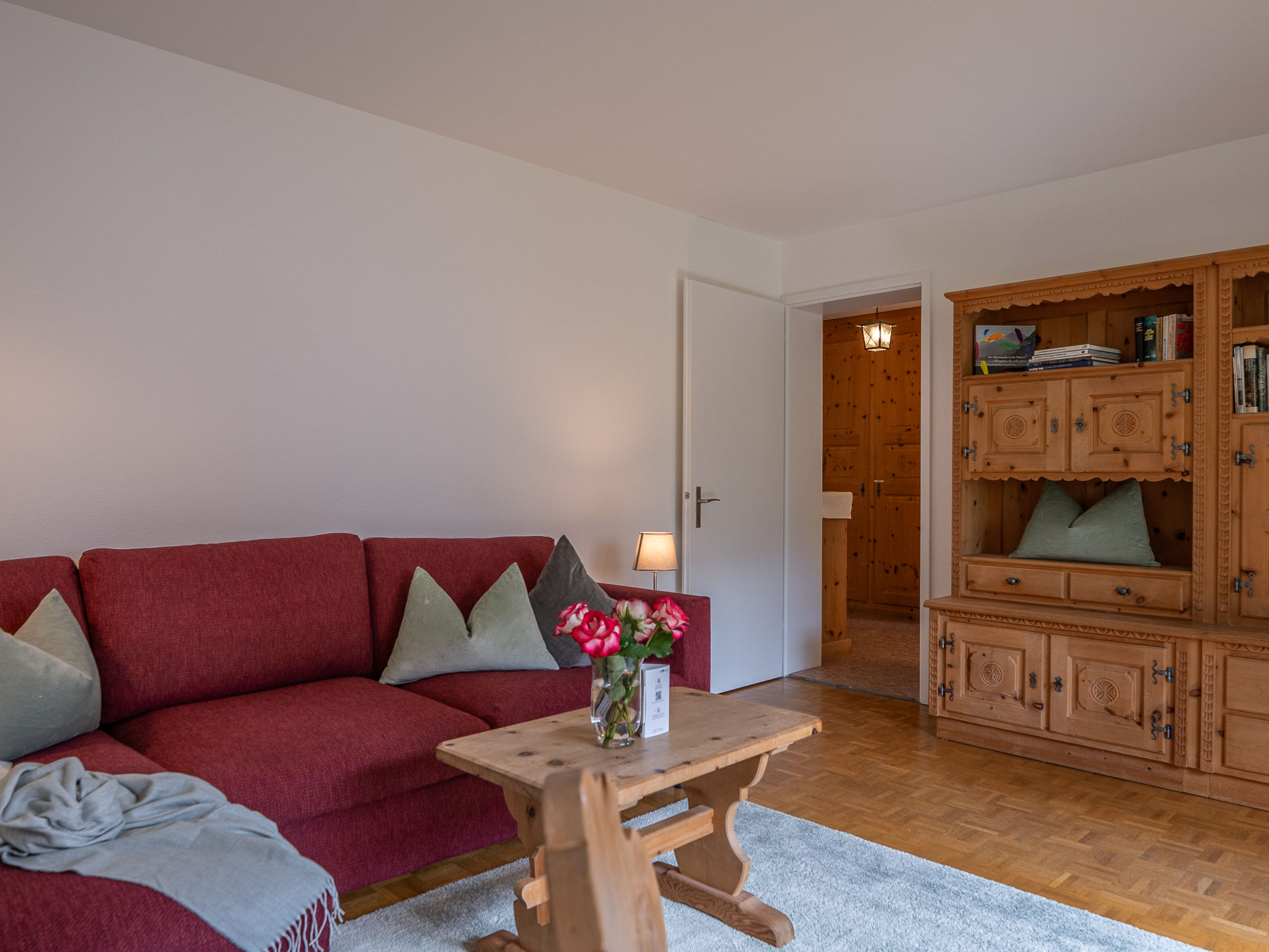 "Chesa Muntarütsch", 2-Zimmer-Wohnung 55 m2 im 2. Stock. Gemütlich und mit viel Holz eingerichtet: Wohn-/Esszimmer mit 1 Diwanbett (140 cm, Länge 190 cm), Esstisch und TV (Flachbildschirm). Ausgang zum Balkon. 1 grosses Doppelzimmer mit 1 Doppelbett (2 x 90 cm, Länge 200 cm). Ausgang zum Balkon. Küche (Backofen, Geschirrspüler, 4 Glaskeramikplatten, Toaster, Wasserkocher, elektrische Kaffeemaschine, Kapseln für die Kaffeemaschine (Nespresso) extra, Fondue Set (Käse)). Bad/WC. Heizung. Holzdielenboden. Balkonmöbel. Sicht auf die Berge, die Landschaft und die Ortschaft. Zur Verfügung: Bügeleisen, Haartrockner. Internet (Wireless LAN, gratis). Garage Nr. 2, Höhe 193 cm, Breite 230 cm. Bitte beachten: Nichtraucher-Unterkunft, Nichtraucher-Haus. Maximal 2 Haustiere/Hunde erlaubt.