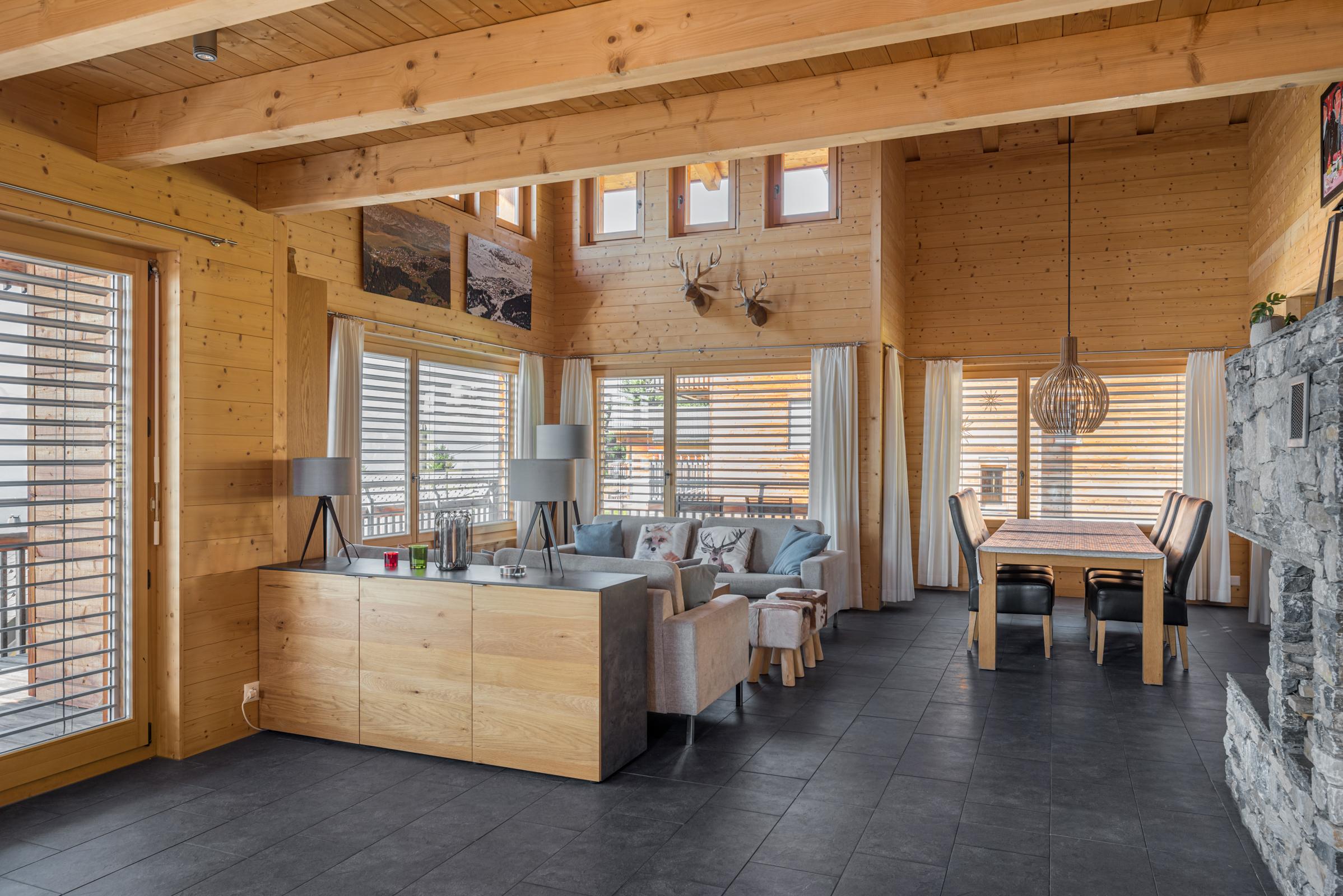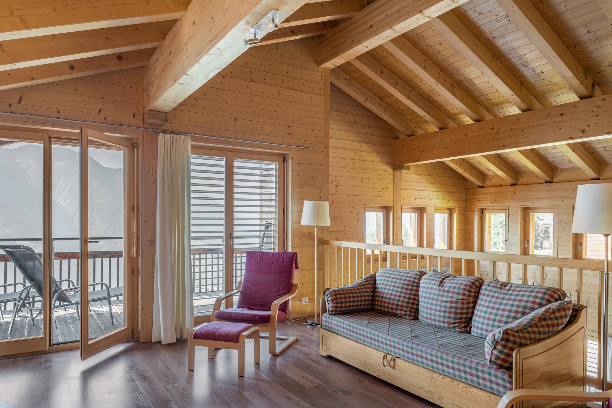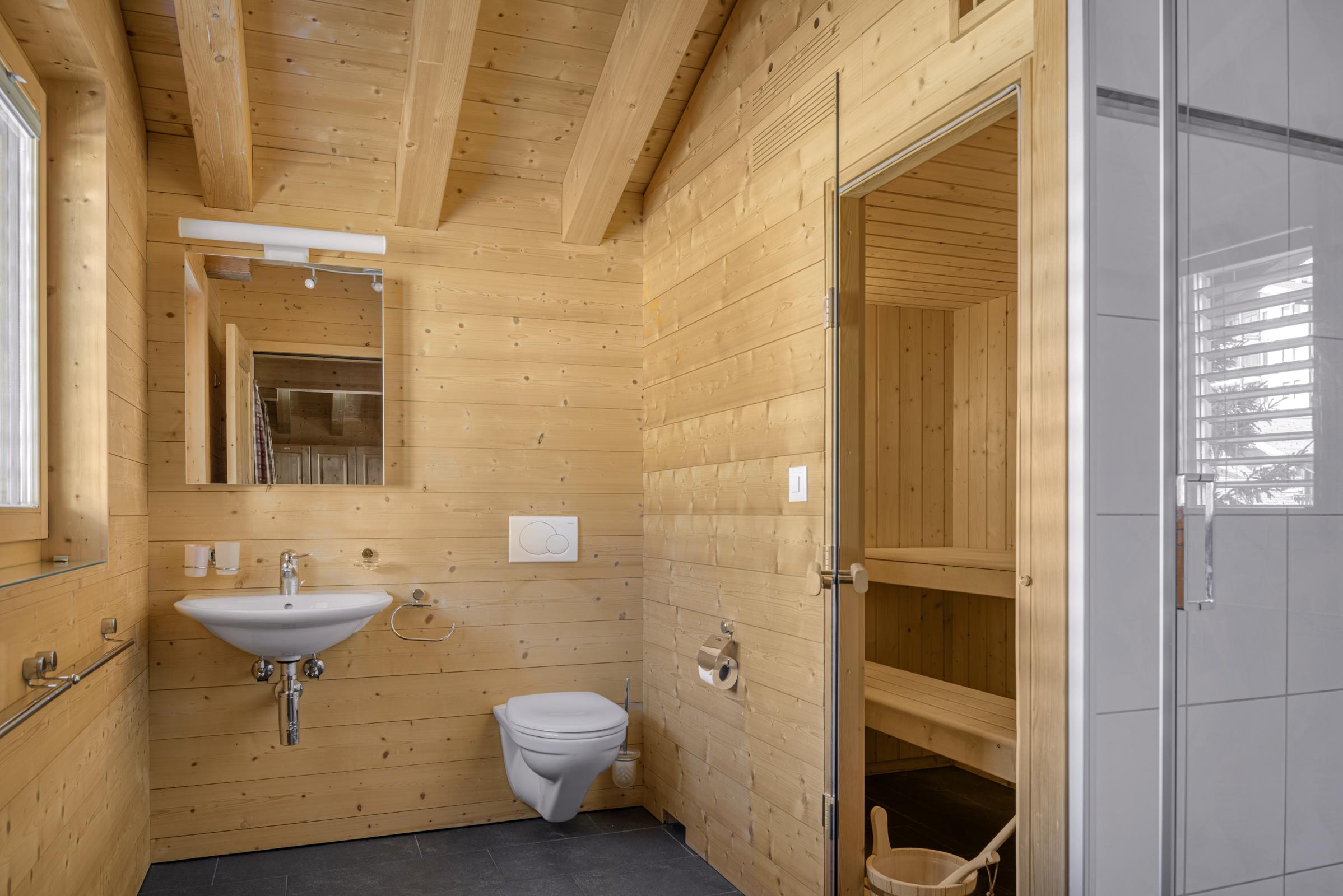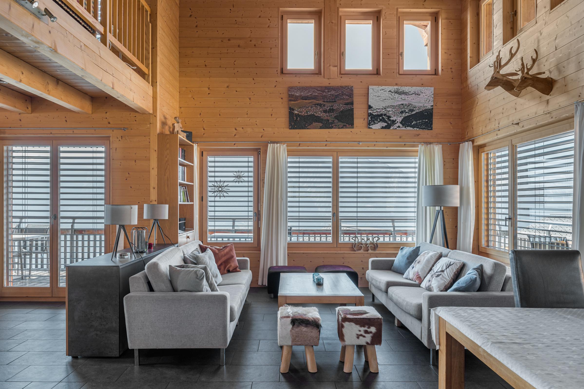 Das gemütliche Chalet erstreckt sich über drei Etagen und bietet Platz für grössere Gruppen oder Familien. Der Eingang im ersten Stock führt direkt ins Entrée mit Tages-WC und einem praktischen Skiraum samt Skischuhtrockner. Im Obergeschoss befindet sich eine offene Galerie mit zusätzlicher Sitzecke, TV und Schlafmöglichkeit. Die verschiedenen Schlafzimmer sind auf das Erd- und Obergeschoss verteilt, wobei mehrere Duschen, WCs sowie eine private Sauna für Komfort sorgen. Der nach Südwesten ausgerichtete Balkon und ein weiterer Balkon im Obergeschoss bieten einen schönen Ausblick und sonnige Stunden.