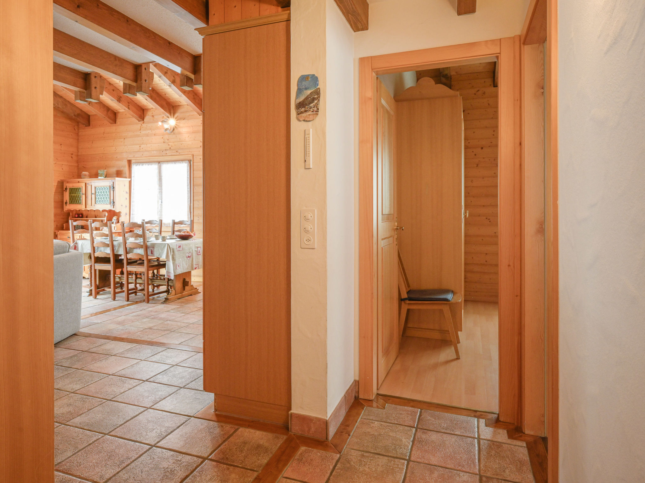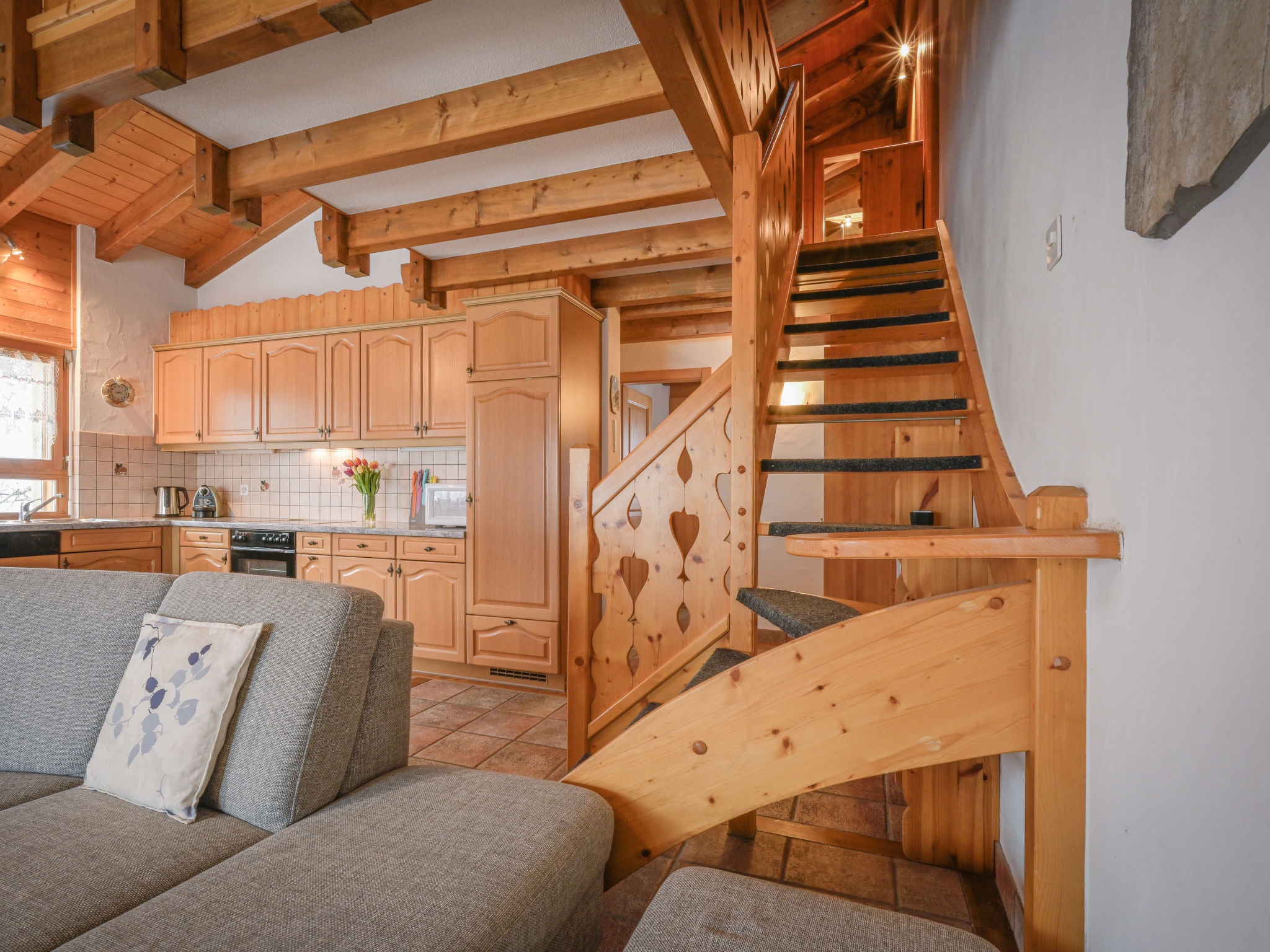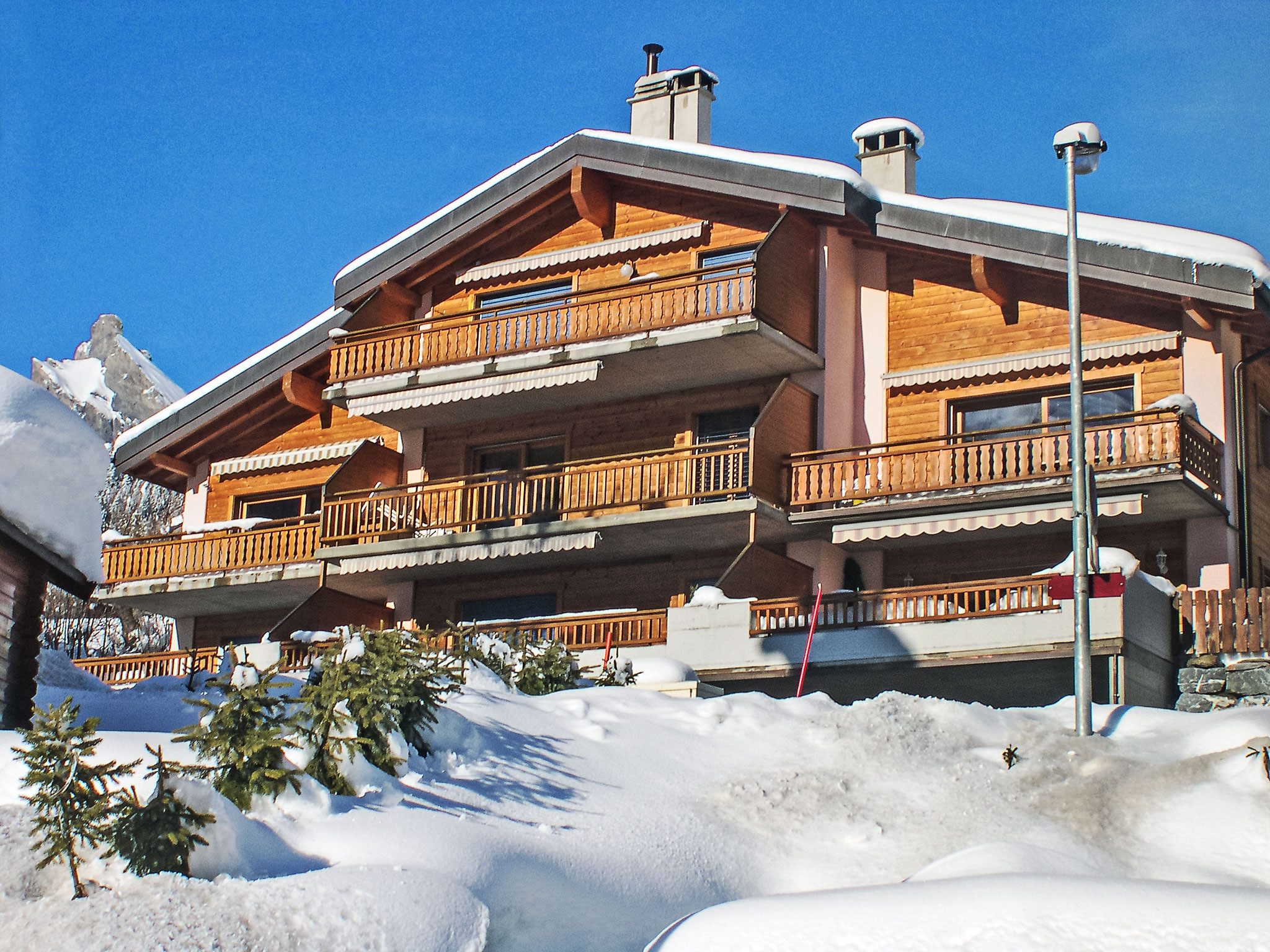 "Heida A 4", 3-Zimmer-Wohnung 75 m2 im 2. Stock, Südwestlage. Komfortabel und geschmackvoll eingerichtet: Wohn-/Esszimmer 30 m2 mit Schiebetür, Panoramafenster mit Schwedenofen, Kabel-TV und Flachbildschirm. Ausgang zum Balkon. 1 Zimmer mit 1 franz. Bett (140 cm), Radio. 1 Zimmer mit 1 Doppelbett und Radio. Galerie 10 m2 mit 1 Bett (90 cm). Kochnische (4 Kochplatten, Backofen, Geschirrspüler, Toaster, Mikrowelle, elektrische Kaffeemaschine, Kapseln für die Kaffeemaschine (Nespresso) extra, Racletteofen, Fondue Set (Chinoise, Käse)). Dusche/WC, sep. WC. Balkon 12 m2. Terrassenmöbel, Liegestühle. Sehr schöne Sicht auf die Berge und das Tal. Zur Verfügung: Babybett bis 2 Jahre. Internet (WLAN, gratis). Garage Nr. 4. Bitte beachten: Nichtraucher-Unterkunft. Maximal 1 kleines Haustier/Hund erlaubt. Anstelle eines abgeschlossenen Schlafzimmers befinden sich manche Schlafplätze in einem offenen Bereich (Galerie, Nische etc.).