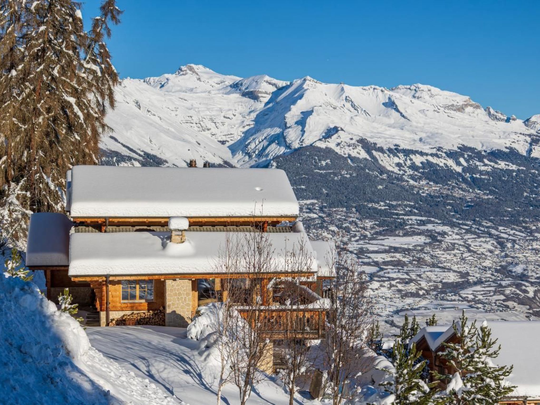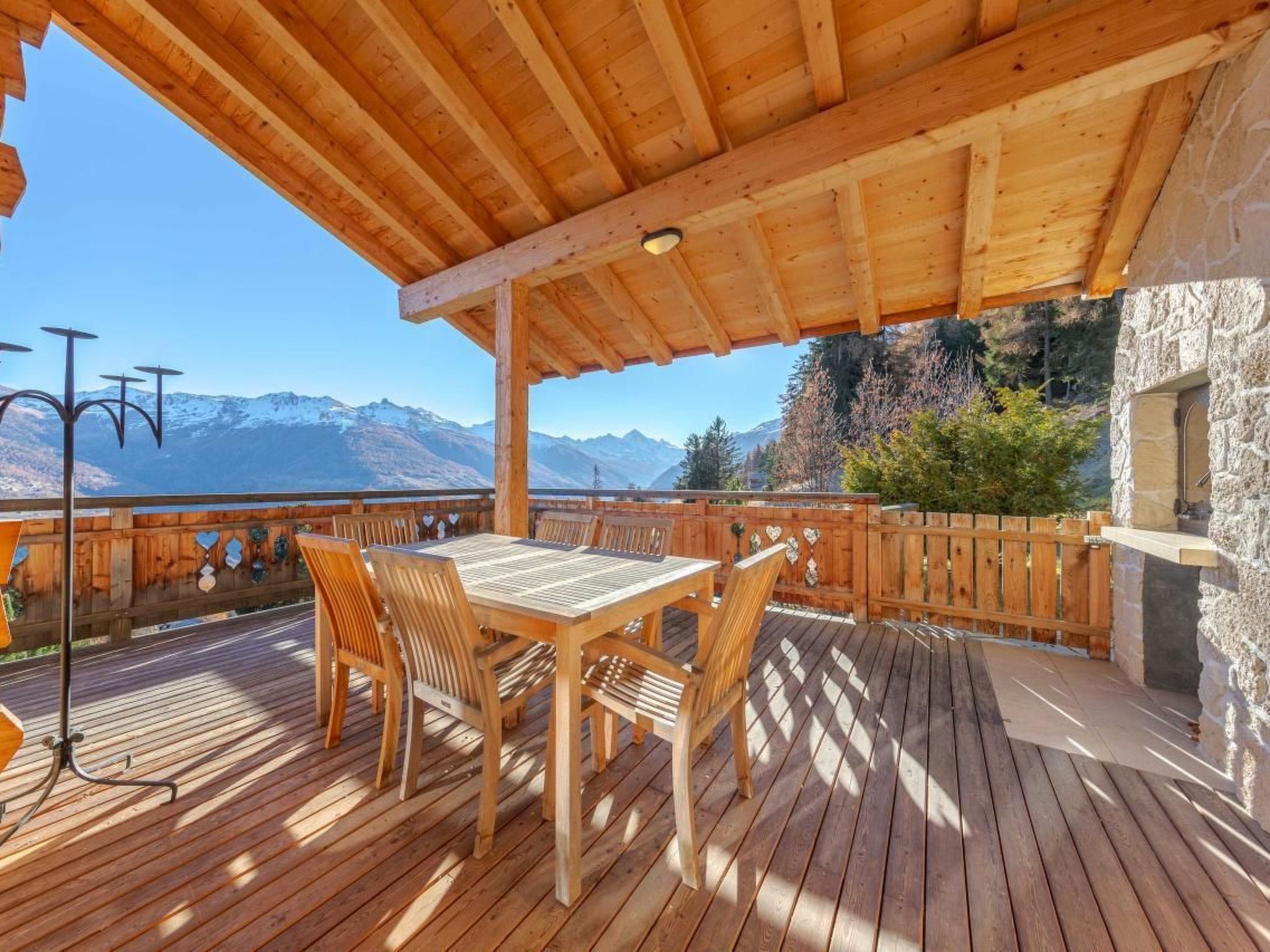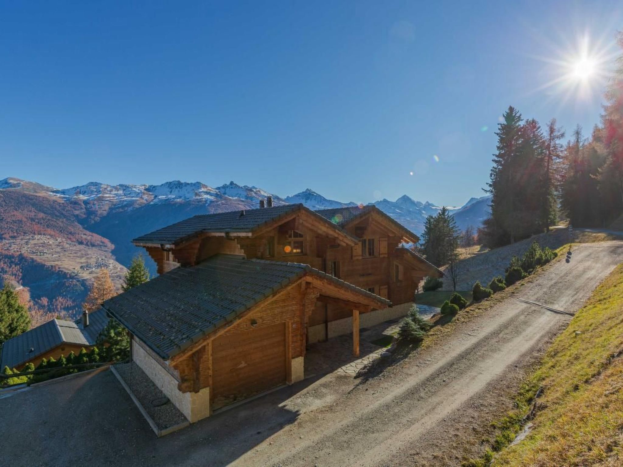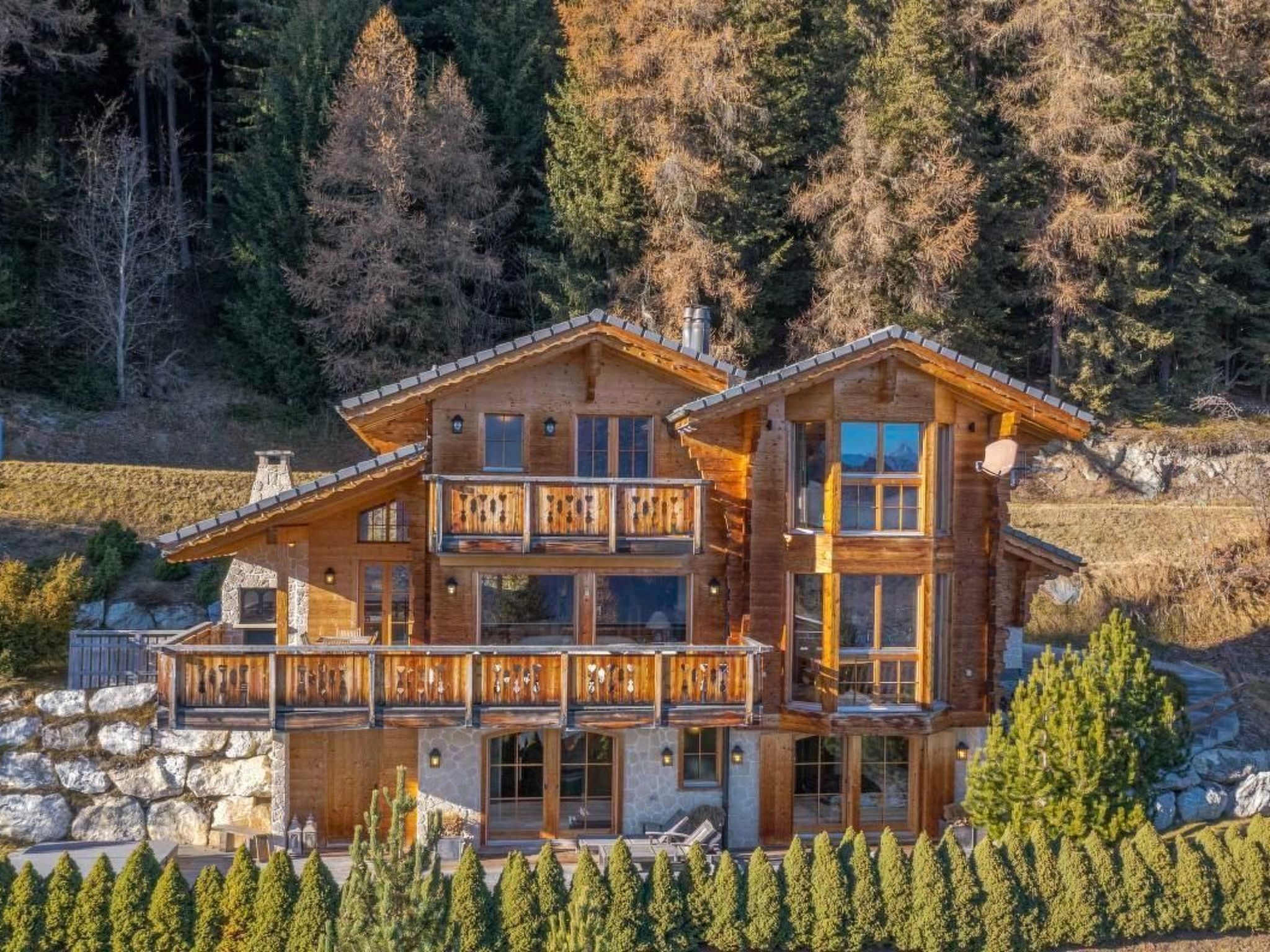 Es wurde in einer ruhigen Umgebung gebaut und schmiegt sich an den Berg mit einem Wald auf der Rückseite und einem atemberaubenden Panoramablick über das Val d'Hérens und das Rhonetal bis hin zu den Berner Alpen auf der Vorderseite. Beobachten Sie, wie die Sonne oder der Mond hinter den Bergen aufgeht oder untergeht und dabei vier 4000er-Gipfel, darunter das Matterhorn und die Dent Blanche, beleuchtet.