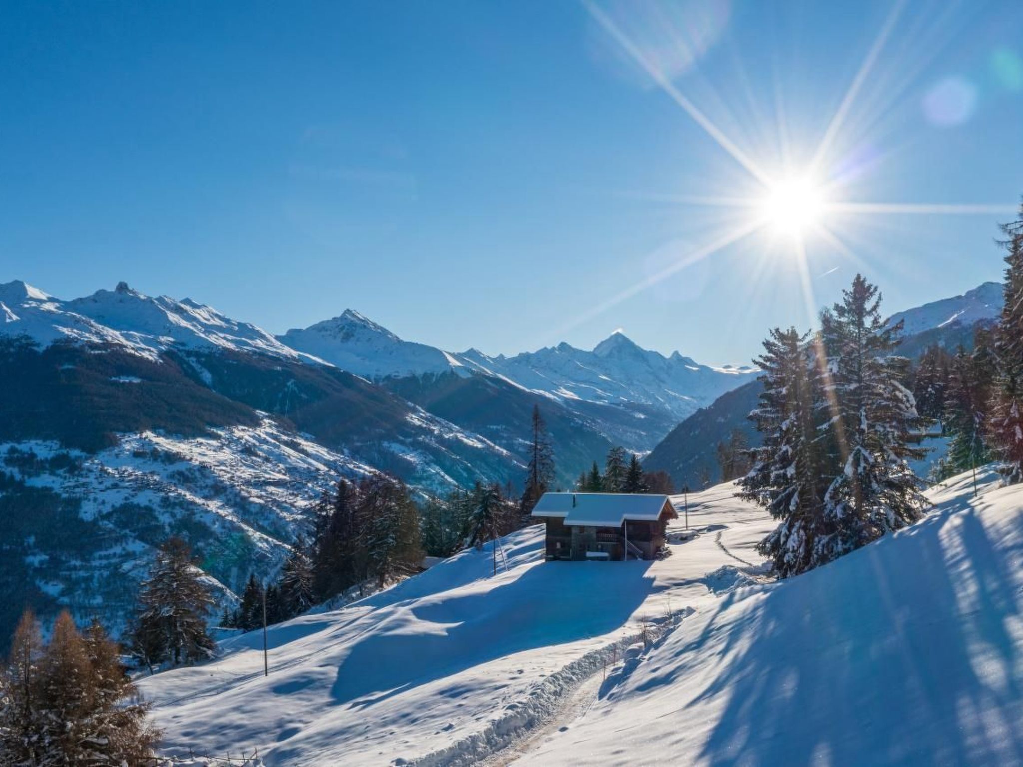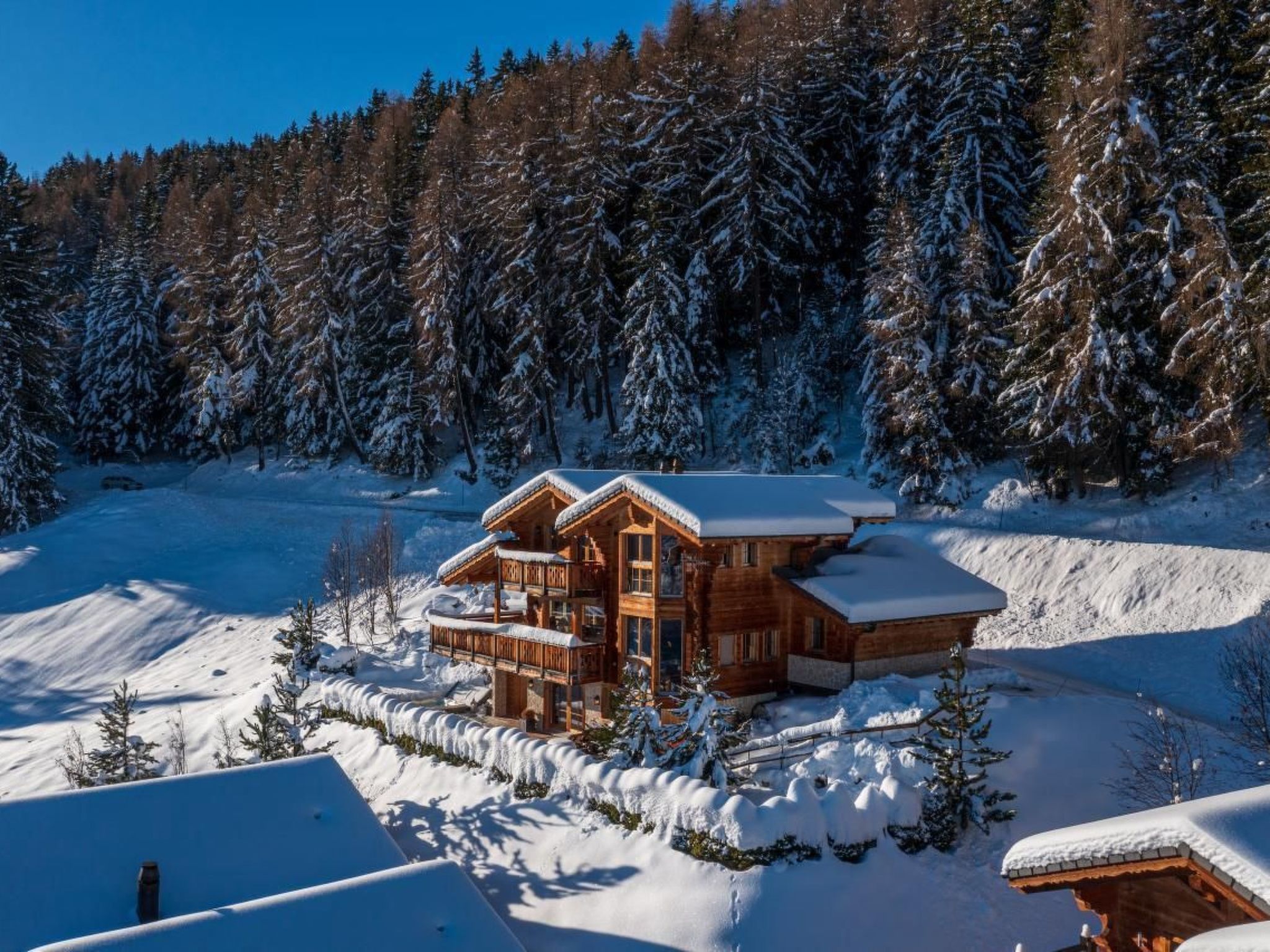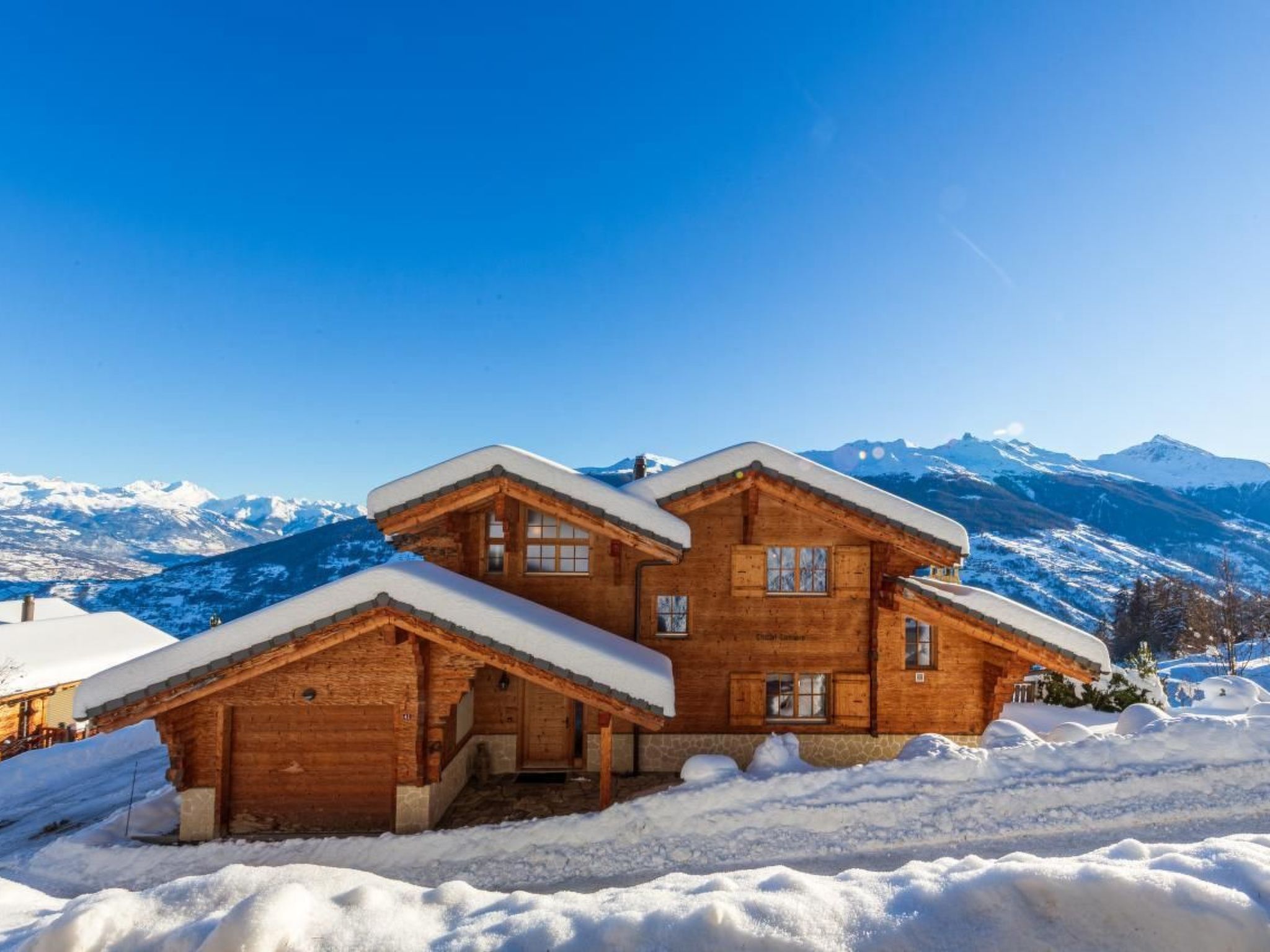 Es wurde in einer ruhigen Umgebung gebaut und schmiegt sich an den Berg mit einem Wald auf der Rückseite und einem atemberaubenden Panoramablick über das Val d'Hérens und das Rhonetal bis hin zu den Berner Alpen auf der Vorderseite. Beobachten Sie, wie die Sonne oder der Mond hinter den Bergen aufgeht oder untergeht und dabei vier 4000er-Gipfel, darunter das Matterhorn und die Dent Blanche, beleuchtet.