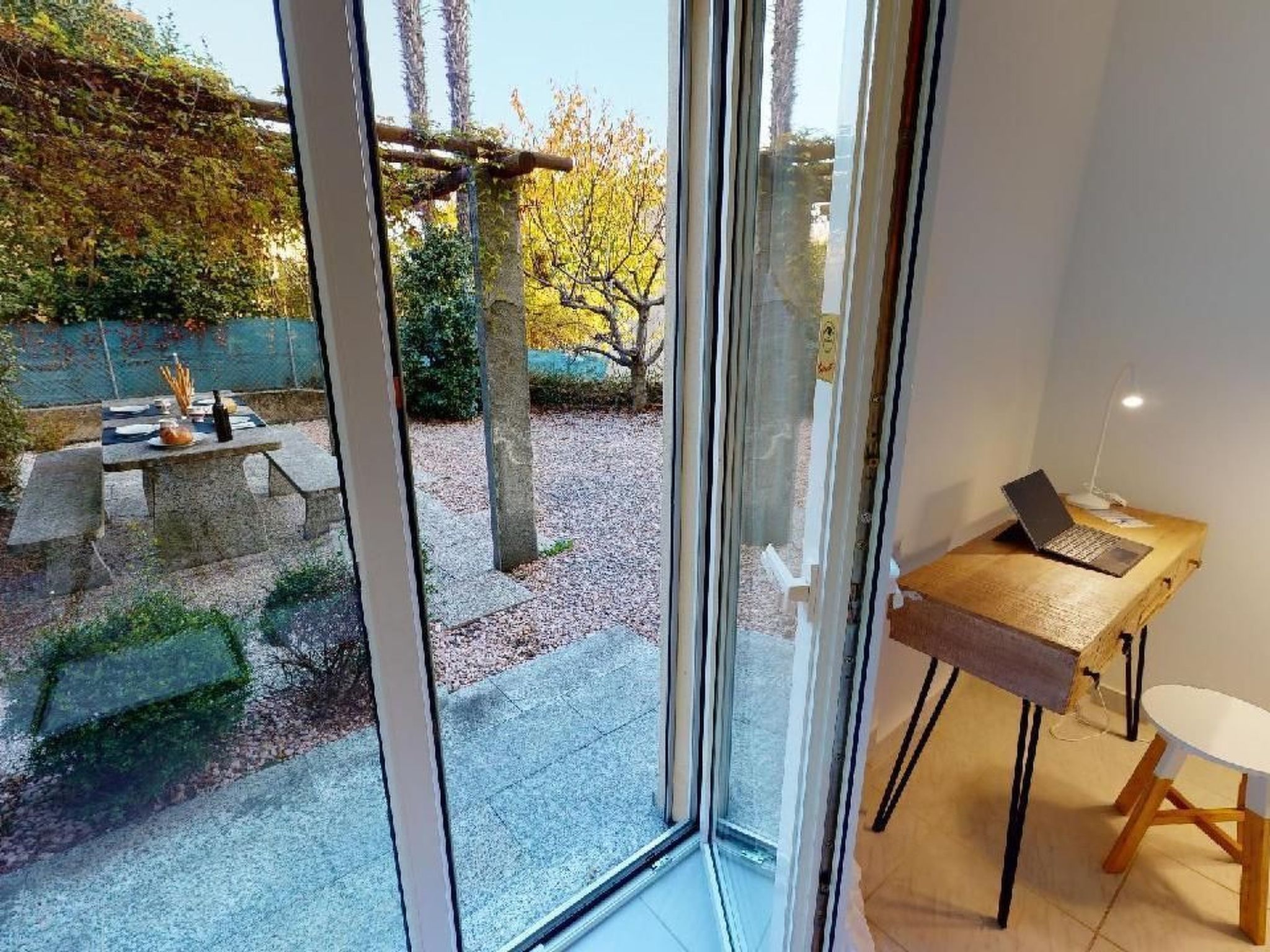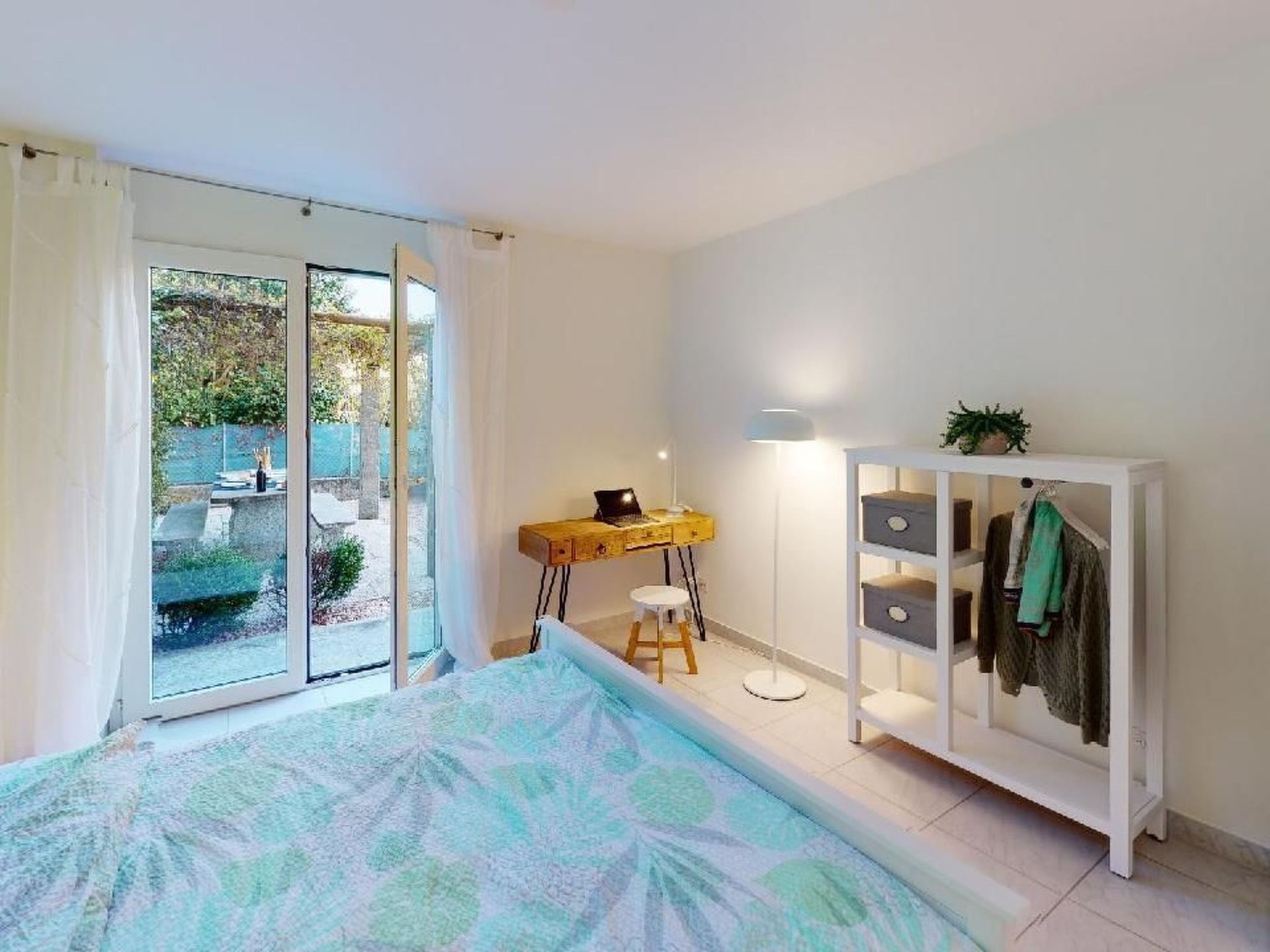 Sonstige Schlafzimmereinrichtung (Schlafzimmer1): offener Kleiderschrank, Arbeitsplatz für Laptop, Direkter Zugang zum Garten