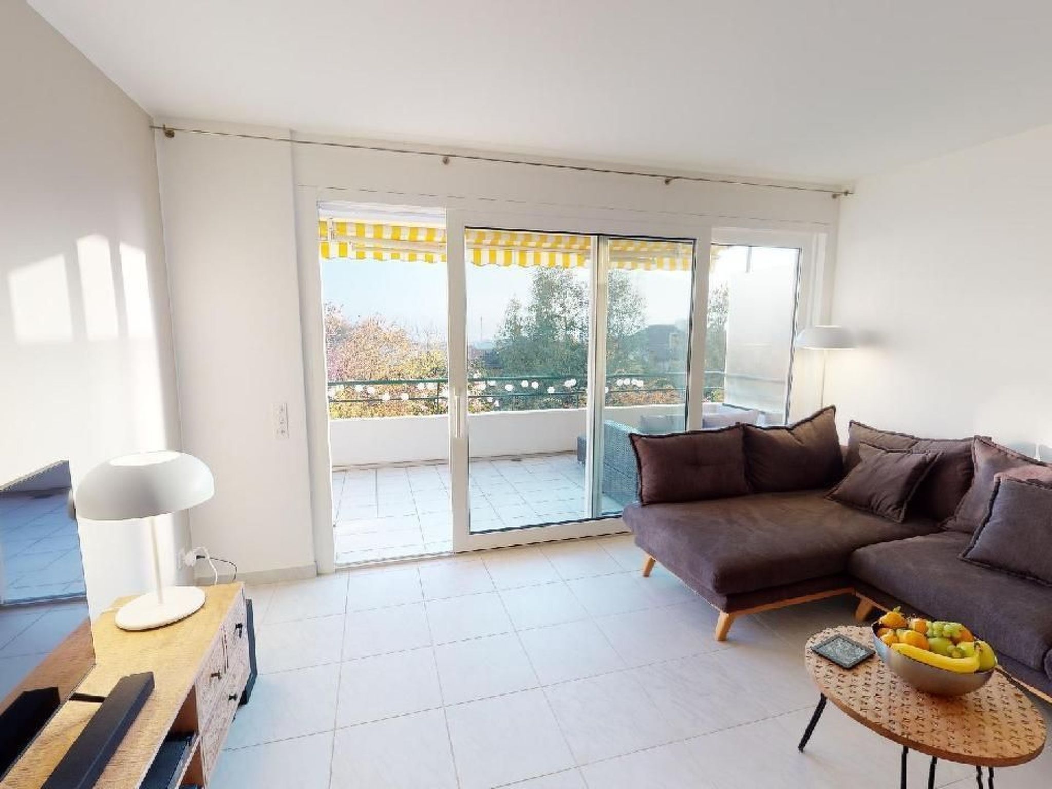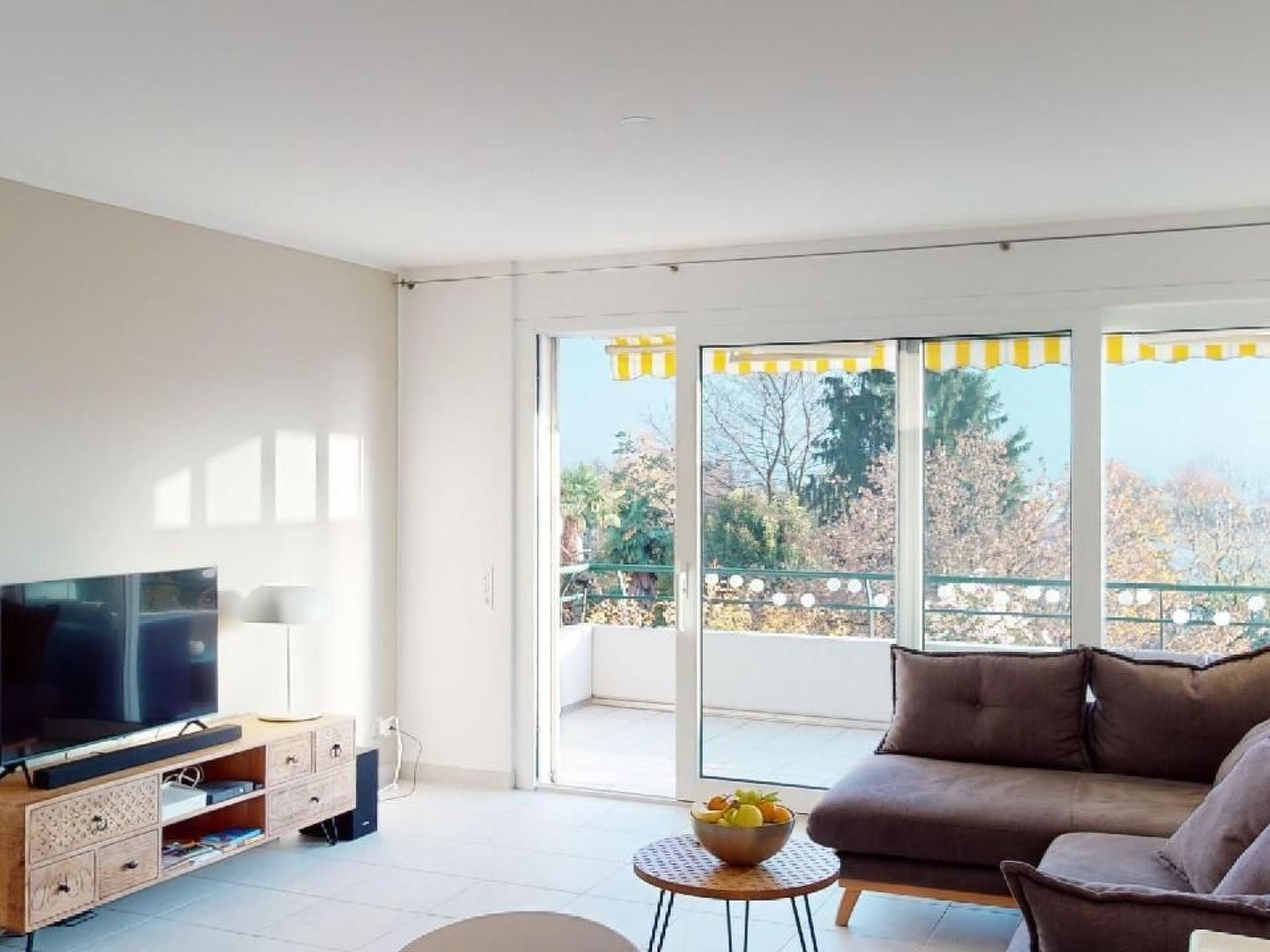Sonstige Wohnzimmerausstattung (Wohnzimmer1): Esstisch, Ecksofa, TV (D/It/Fr/En-Kanäle, Replay Funktion). Zugang zum grossen separaten Balkon mit partieller Seesicht.